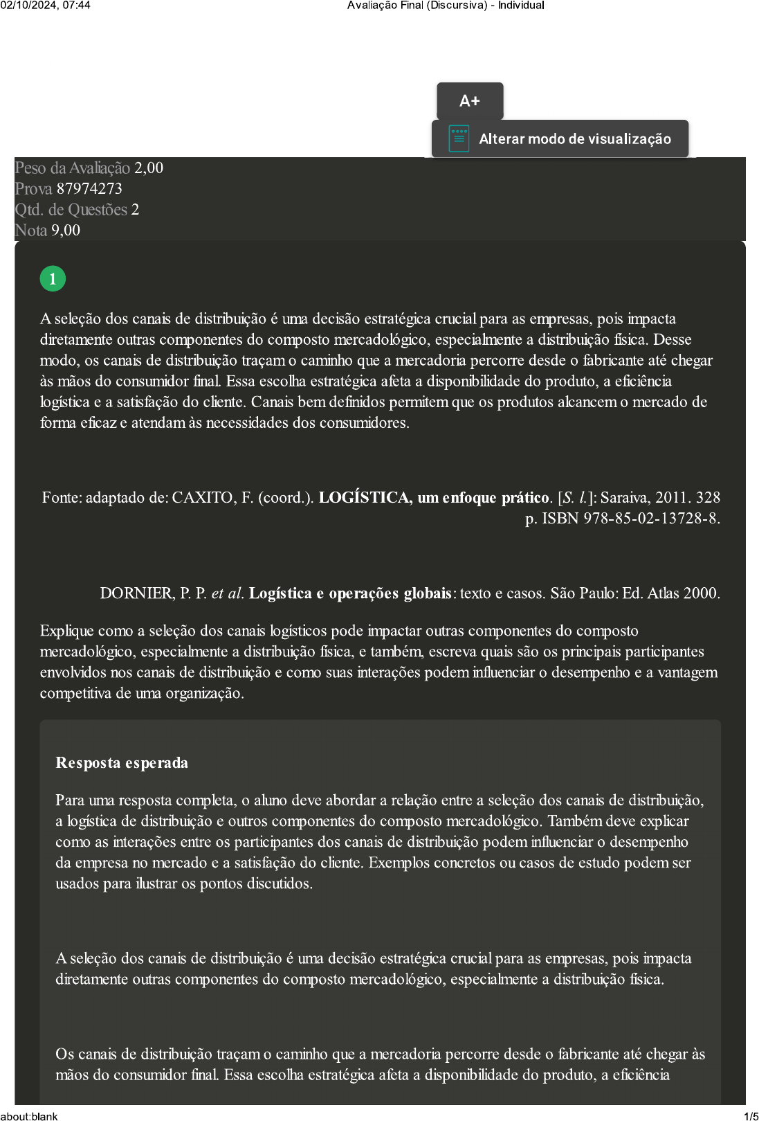 <p>02/10/2024, 07:44 Avaliação Final (Discursiva) Individual A+ Alterar modo de visualização Peso da Avaliação 2,00 Prova 87974273 Qtd. de Questões 2 Nota 9,00 1 A seleção dos canais de distribuição é uma decisão estratégica crucial para as empresas, pois impacta diretamente outras componentes do composto mercadológico, especialmente a distribuição fisica. Desse modo, os canais de distribuição traçam caminho que a mercadoria percorre desde fabricante até chegar às mãos do consumidor Essa escolha estratégica afeta a disponibilidade do produto, a eficiência logística e a satisfação do cliente. Canais bem definidos permitem que os produtos alcancem mercado de forma eficaz e atendam às necessidades dos consumidores. Fonte: adaptado de: CAXITO, F. (coord.). LOGÍSTICA, um enfoque prático. [S. Saraiva, 2011. 328 p. ISBN 978-85-02-13728-8. DORNIER, P. P. et al. Logística e operações globais: texto e casos. São Paulo: Ed. Atlas 2000. Explique como a seleção dos canais logísticos pode impactar outras componentes do composto mercadológico, especialmente a distribuição fisica, e também, escreva quais são os principais participantes envolvidos nos canais de distribuição e como suas interações podem influenciar desempenho e a vantagem competitiva de uma organização. Resposta esperada Para uma resposta completa, aluno deve abordar a relação entre a seleção dos canais de distribuição, a logística de distribuição e outros componentes do composto mercadológico. Também deve explicar como as interações entre os participantes dos canais de distribuição podem influenciar desempenho da empresa no mercado e a satisfação do cliente. Exemplos concretos ou casos de estudo podem ser usados para ilustrar os pontos discutidos. A seleção dos canais de distribuição é uma decisão estratégica crucial para as empresas, pois impacta diretamente outras componentes do composto mercadológico, especialmente a distribuição Os canais de distribuição traçam caminho que a mercadoria percorre desde fabricante até chegar às mãos do consumidor final. Essa escolha estratégica afeta a disponibilidade do produto, a eficiência about:blank 1/5</p><p>02/10/2024, 07:44 Avaliação Final (Discursiva) - Individual logística e a satisfação do cliente. Canais bem definidos permitem que os produtos alcancem mercado de forma eficaz e atendam às necessidades dos consumidores. Os principais participantes nos canais de distribuição incluem: Fabricantes (Produtores): São os responsáveis pela criação e produção dos produtos. Decisões sobre canais afetam diretamente a forma como seus produtos chegam aos consumidores. Atacadistas: Compram grandes quantidades de produtos dos fabricantes. Revendem para varejistas ou outros intermediários. Sua eficiência na distribuição influencia fluxo de produtos. Varejistas: Vendem diretamente aos consumidores finais. Sua localização e estratégias de marketing afetam a disponibilidade dos produtos. Distribuidores Especializados: Focam em segmentos específicos, como equipamentos odontológicos. Atuam como intermediários entre fabricantes e varejistas. about:blank 2/5</p><p>02/10/2024, 07:44 Avaliação Final (Discursiva) Individual Sua expertise influencia a escolha dos produtos e a satisfação dos clientes. Clientes (Consumidores Finais): São último elo da cadeia, adquirindo os produtos para uso pessoal. Suas preferências e demandas impactam diretamente as estratégias de distribuição. As interações entre esses participantes afetam desempenho e a vantagem competitiva da organização: Eficiência Logística: Canais bem coordenados otimizam fluxo de produtos, reduzindo custos e prazos de entrega. Uma distribuição eficiente contribui para a satisfação do cliente. Satisfação do Cliente: Canais eficazes garantem que os produtos estejam disponíveis quando e onde os clientes precisam. A experiência de compra influencia a fidelidade do cliente. Posicionamento no Mercado: A escolha dos canais impacta a percepção da marca e a penetração no mercado. Canais bem alinhados reforçam a imagem da empresa. about:blank 3/5</p><p>02/10/2024, 07:44 Avaliação Final (Discursiva) Individual Competitividade: Canais bem gerenciados conferem à empresa uma vantagem competitiva sustentável. A colaboração entre parceiros fortalece a posição no mercado. Minha resposta A forma como os produtos são distribuídos é fortemente influenciada pela escolha dos canais. Quando um produtor vende diretamente para cliente, usando canais diretos, ele tem mais controle sobre a logística, que pode resultar em entregas mais rápidas e eficientes. Por outro lado, os canais indiretos, que envolvem intermediários como atacadistas e varejistas, ajudam a alcançar mais clientes. mas podem trazer desafios logísticos e custos adicionais. A escolha do canal impacta a velocidade de entrega, a disponibilidade do produto e os custos envolvidos. As relações entre os diferentes participantes da cadeia de distribuição são essenciais para sucesso da empresa. Ter uma boa comunicação e colaboração entre fabricantes e atacadistas garante que estoque esteja sempre adequado e que a demanda do mercado seja atendida. Da mesma forma, uma parceria eficiente entre varejistas e fabricantes pode levar a promoções mais atraentes e a uma melhor compreensão das necessidades dos consumidores. Essas relações também podem influenciar a vantagem competitiva de uma empresa. Parcerias bem-sucedidas ao longo da cadeia de distribuição podem ajudar a reduzir custos, melhorar a eficiência e oferecer um atendimento ao cliente superior. Além disso, ser capaz de ajustar rapidamente os canais de distribuição às mudanças do mercado é um diferencial importante em um ambiente competitivo. Em resumo, a escolha dos canais de distribuição não só afeta como os produtos chegam aos consumidores, mas também influencia a eficiência operacional, a percep