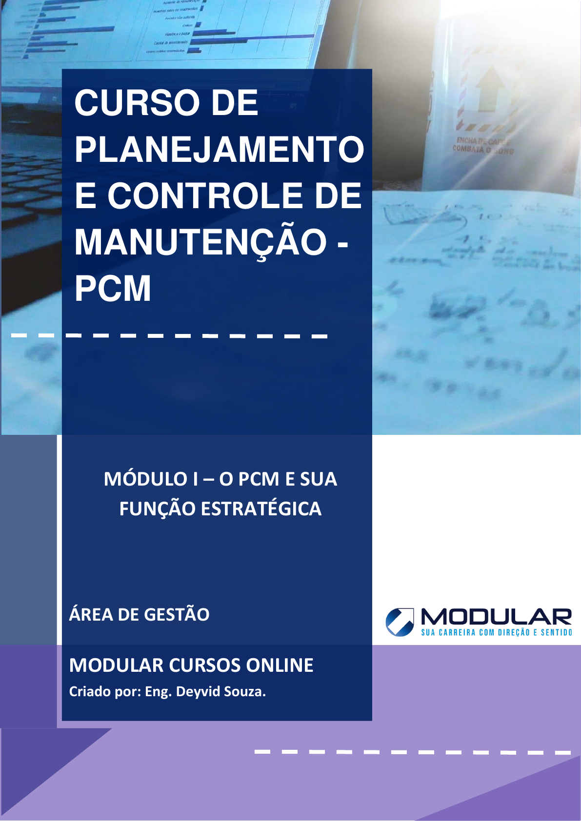 <p>CURSO DE</p><p>PLANEJAMENTO</p><p>E CONTROLE DE</p><p>MANUTENÇÃO -</p><p>PCM</p><p>ÁREA DE GESTÃO</p><p>MODULAR CURSOS ONLINE</p><p>Criado por: Eng. Deyvid Souza.</p><p>MÓDULO I – O PCM E SUA</p><p>FUNÇÃO ESTRATÉGICA</p><p>Nome: Fábio Poli Maretto Freitas</p><p>Cpf: 166.832.087-86</p><p>CURSO DE PCM – MÓDULO 1: Introdução ao PCM</p><p>ÁREA DE GESTÃO e INDÚSTRIA</p><p>MODULAR CURSOS ONLINE</p><p>contato@modularcursos.com</p><p>35.847.456/0001-76</p><p>P</p><p>ág</p><p>in</p><p>a2</p><p>Do Autor:</p><p>Este curso foi desenvolvido com o objetivo de capacitar os</p><p>profissionais da área industrial a executarem o planejamento e controle</p><p>da manutenção. Por ser um curso de gestão, aplica-se a todos os</p><p>envolvidos com manutenção, produção, gestão, engenharias, técnicos e</p><p>também da segurança do trabalho. Será explorado os conceitos de</p><p>manutenção e inspeção, fluxo de Ordens de Serviço e Indicadores de</p><p>manutenção, com foco em Planejamento e Controle. Após ler o E-Book</p><p>faça a E-Aula para cada módulo e aprofunde seu conhecimento.</p><p>Somos muito gratos por você escolher a MODULAR para se</p><p>profissionalizar em PCM. Estamos sempre à disposição para atendê-lo.</p><p>Desejamos um bom curso e seja muito bem-vindo.</p><p>INFORMAÇÕES</p><p>CURSO: Planejamento e Controle de Manutenção</p><p>MÓDULO: I</p><p>ÁREA: Gestão e Indústria</p><p>PRODUZIDO POR: Modular Cursos Online</p><p>DATA: março de 2020</p><p>Nome: Fábio Poli Maretto Freitas</p><p>Cpf: 166.832.087-86</p><p>CURSO DE PCM – MÓDULO 1: Introdução ao PCM</p><p>ÁREA DE GESTÃO e INDÚSTRIA</p><p>MODULAR CURSOS ONLINE</p><p>contato@modularcursos.com</p><p>35.847.456/0001-76</p><p>P</p><p>ág</p><p>in</p><p>a3</p><p>Sumário</p><p>RESUMO ....................................................................................................... 4</p><p>O que é PCM? ............................................................................................... 4</p><p>1. Manutenção ..................................................................................... 7</p><p>2. Planejamento ................................................................................. 10</p><p>3. Controle ......................................................................................... 13</p><p>A Estrutura da Manutenção ........................................................................ 16</p><p>REVISÃO: .................................................................................................... 17</p><p>Nome: Fábio Poli Maretto Freitas</p><p>Cpf: 166.832.087-86</p><p>CURSO DE PCM – MÓDULO 1: Introdução ao PCM</p><p>ÁREA DE GESTÃO e INDÚSTRIA</p><p>MODULAR CURSOS ONLINE</p><p>contato@modularcursos.com</p><p>35.847.456/0001-76</p><p>P</p><p>ág</p><p>in</p><p>a4</p><p>RESUMO:</p><p>Apresentaremos os conceitos básicos de manutenção, a evolução e as</p><p>mudanças que vêm ocorrendo ao longo dos anos. Mostraremos o que é o PCM</p><p>e como funciona a estrutura do setor de manutenção em empresas. Além disso,</p><p>será feito um aprofundamento dos conceitos de Planejamento e Controle,</p><p>lançando as bases para todo o curso. O ponto chave deste módulo é entender a</p><p>importância da manutenção no contexto industrial atual e como o PCM tem</p><p>protagonismo nesse cenário.</p><p>O que é PCM?</p><p>Nada mais é do que a sigla para Planejamento e Controle de</p><p>Manutenção. PCM pode ser um setor de uma empresa, uma função ou até</p><p>mesmo um responsável por planejar e controlar não só as manutenções dos</p><p>equipamentos, mas também de planejar e controlar o setor de manutenção de</p><p>uma empresa, ou seja, o PCM é onde nasce a estratégia da manutenção.</p><p>O setor de PCM surgiu após a segunda guerra mundial, por volta de</p><p>1950, de modo que em um período pós-guerra era necessário ter maior</p><p>produtividade com menores recursos. Nesse período, paradas de produção</p><p>devido a falhas em equipamentos constituíam um atestado de ineficiência.</p><p>Com isso, foi necessário aprender a planejar manutenções preventivas, e com</p><p>essa necessidade de planejamento surgiu o PCM.</p><p>Ao longo da história, o setor de manutenção vem mudando e evoluindo,</p><p>veja um breve resumo a seguir.</p><p>Nome: Fábio Poli Maretto Freitas</p><p>Cpf: 166.832.087-86</p><p>CURSO DE PCM – MÓDULO 1: Introdução ao PCM</p><p>ÁREA DE GESTÃO e INDÚSTRIA</p><p>MODULAR CURSOS ONLINE</p><p>contato@modularcursos.com</p><p>35.847.456/0001-76</p><p>P</p><p>ág</p><p>in</p><p>a5</p><p>➢ Manutenção nos anos 1950 e 1960:</p><p>o manutenção corretiva;</p><p>o manutenção preventiva com base no tempo de operação;</p><p>o surgimento do PCM.</p><p>➢ Manutenção nos anos 1970 e 1980:</p><p>o manutenção preditiva;</p><p>o preventivas com base na condição;</p><p>o análise de causas e efeitos.</p><p>➢ Manutenção nos anos 1990 e 2000:</p><p>o confiabilidade;</p><p>o disponibilidade;</p><p>o manutenibilidade.</p><p>➢ Tendências da Manutenção Atual:</p><p>o Integração TPM/WCM</p><p>o Manutenção Proativa, Prescritiva e Consultiva</p><p>o Uso da Indústria 4.0</p><p>Neste cenário de constante evolução da manutenção, o setor de PCM acaba</p><p>sendo uma coluna dorsal para manter os processos, programação,</p><p>planejamento e controle das atividades operando de forma eficiente e</p><p>organizada.</p><p>Quais são as responsabilidades do PCM?</p><p>a. Definir metas e indicadores de desempenho de manutenção.</p><p>b. Criar Planos de ação para atingir as metas.</p><p>c. Elaborar Planos, Padrões, Procedimentos para manutenções</p><p>preventivas, corretivas, inspeções e preditivas.</p><p>d. Fazer a integração entre Produção, Produto, Qualidade, Projetos e TI.</p><p>Nome: Fábio Poli Maretto Freitas</p><p>Cpf: 166.832.087-86</p><p>CURSO DE PCM – MÓDULO 1: Introduç