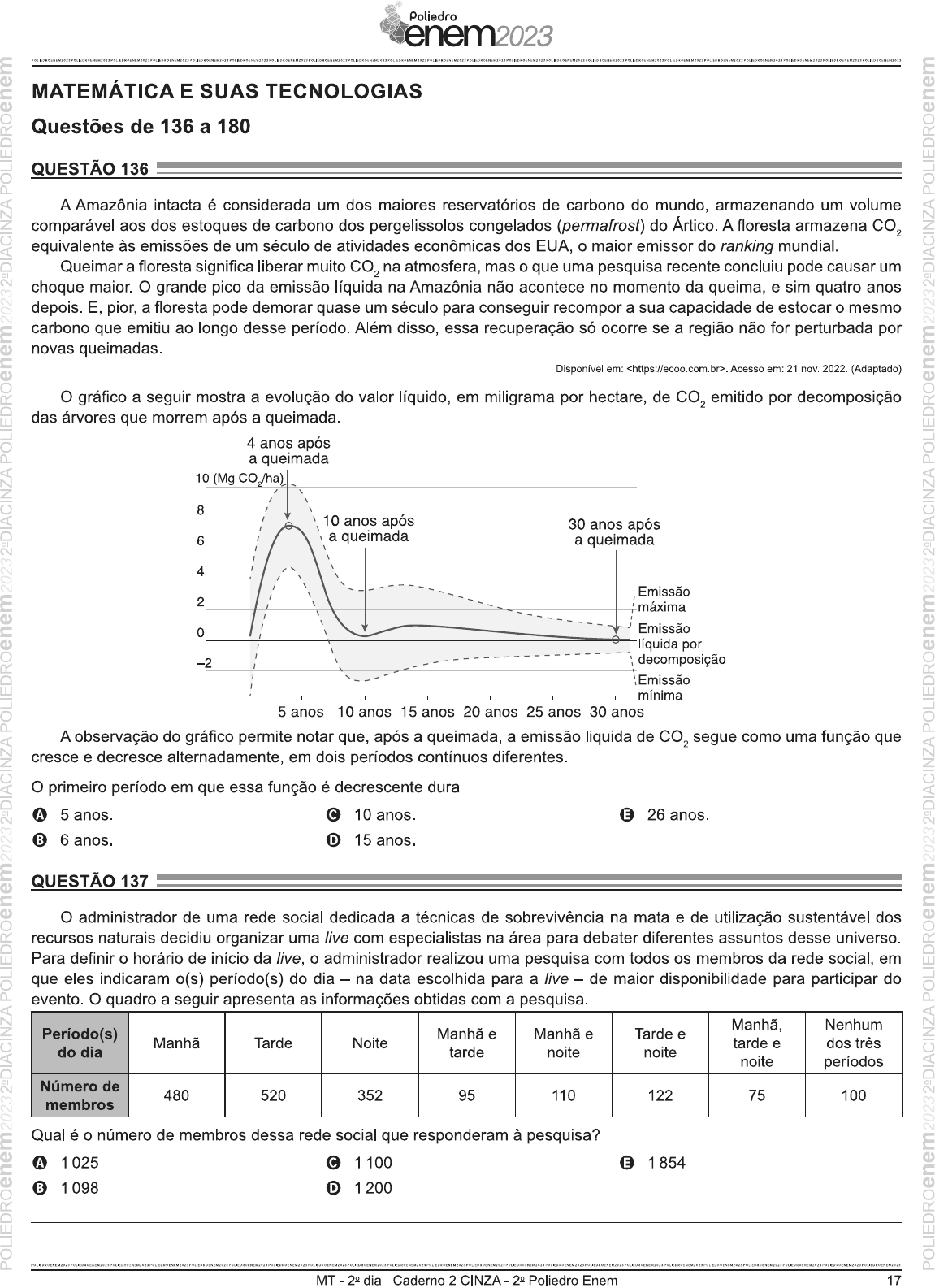 <p>Poliedro enem2023 MATEMÁTICA E SUAS TECNOLOGIAS Questões de 136 a 180 QUESTÃO 136 A Amazônia intacta é considerada um dos maiores reservatórios de carbono do mundo, armazenando um volume comparável aos dos estoques de carbono dos pergelissolos congelados (permafrost) do Ártico. A floresta armazena CO2 equivalente às emissões de um século de atividades econômicas dos EUA, o maior emissor do ranking mundial. Queimar a floresta significa liberar muito na atmosfera, mas o que uma pesquisa recente concluiu pode causar um choque maior. grande pico da emissão líquida na Amazônia não acontece no momento da queima, e sim quatro anos depois. E, pior, a floresta pode demorar quase um século para conseguir recompor a sua capacidade de estocar o mesmo carbono que emitiu ao longo desse período. Além disso, essa recuperação só ocorre se a região não for perturbada por novas queimadas. Disponível em: Acesso em: 21 nov. 2022. (Adaptado) gráfico a seguir mostra a evolução do valor líquido, em miligrama por hectare, de CO. emitido por decomposição das árvores que morrem após a queimada. 4 anos após a queimada 10 (Mg 8 10 anos após 30 anos após 6 a queimada a queimada 4 Emissão 2 máxima 0 Emissão líquida por -2 decomposição Emissão mínima 5 anos 10 anos 15 anos 20 anos 25 anos 30 anos A observação do gráfico permite notar que, após a queimada, a emissão liquida de CO2 segue como uma função que cresce e decresce alternadamente, em dois períodos contínuos diferentes. primeiro período em que essa função é decrescente dura A 5 anos. 10 anos. E 26 anos. B 6 anos. D 15 anos. QUESTÃO 137 administrador de uma rede social dedicada a técnicas de sobrevivência na mata e de utilização sustentável dos recursos naturais decidiu organizar uma live com especialistas na área para debater diferentes assuntos desse universo. Para definir o horário de início da live, o administrador realizou uma pesquisa com todos os membros da rede social, em que eles indicaram o(s) período(s) do dia na data escolhida para a live de maior disponibilidade para participar do evento. quadro a seguir apresenta as informações obtidas com a pesquisa. Manhã, Nenhum Período(s) Manhã e Manhã e Tarde e Manhã Tarde Noite tarde e dos três do dia tarde noite noite noite períodos Número de 480 520 352 95 110 122 75 100 membros Qual é o número de membros dessa rede social que responderam à pesquisa? B D 1200 MT dia Caderno 2 CINZA Poliedro Enem 17</p><p>Poliedro enem2023 QUESTÃO 138 Reserva subterrânea da Amazônia pode abastecer o planeta por 250 anos A região da Amazônia é enorme: ela ocupa mais de 60% de todo o território brasileiro. Mas o que pouquíssima gente sabe é que abaixo dela existe uma quantidade gigantesca de água doce. Trata-se de um verdadeiro oceano subterrâneo, com volume total de 162 mil quilômetros cúbicos, e que é chamado pelos cientistas de Sistema Aquífero Grande Amazônia (Saga). Para se ter uma ideia do tamanho do Saga, os pesquisadores afirmam que ele, sozinho, seria capaz de abastecer o planeta inteiro durante 250 anos. Com uma área total de um milhão e duzentos mil quilômetros quadrados, o aquífero tem 75% de sua extensão em território brasileiro. Disponível em: Acesso em: 17 out. 2022. Utilizando notação científica, qual é a representação, em metro cúbico, do volume do Saga? A 1,62 1,62 1,62 D 1,62 E 1,62 1014 QUESTÃO 139 técnico de atletismo de um clube esportivo preparou um treino de precisão para a sua equipe de arremesso de peso. Para isso, ele restringiu tanto o alcance horizontal do lançamento, que poderia variar de 10 m a 15 m, como a sua altura máxima, que deveria ser, necessariamente, maior do que 4 m e menor do que 6 m. Com base nas restrições apresentadas, sejam A e B, respectivamente, o conjunto dos possíveis alcances horizontais e o conjunto das possíveis alturas máximas de um arremesso realizado nesse treino. Qual é o gráfico que melhor representa o produto cartesiano dos conjuntos A e B, nessa ordem? y 6 6 A D 4 4 10 15 X 10 15 X y y 6 6 B E 4 4 10 15 10 15 X y 6 4 10 15 18 MT dia Caderno 2 CINZA - Poliedro Enem</p><p>Poliedro enem2023 QUESTÃO 140 QUESTÃO 142 Na teoria da música ocidental, uma forma de se calcular Um aplicativo de transporte de passageiros cobra, para a frequência de uma nota que é consonante ao ser tocada cada viagem, um valor fixo somado a um valor que depende junto de outras duas notas diferentes, de frequências X e linearmente da quantidade de quilômetros percorridos. Y, consiste em extrair a média geométrica dos valores de X Uma pessoa utilizou esse aplicativo três vezes, porém sem e de Y, o que pode ser feito por meio da expressão saber o valor fixo e o valor por quilômetro percorrido que foram cobrados em cada viagem. Assim, sobre as ocasiões Nessas condições, a expressão fornecida permite concluir em que essa pessoa utilizou o aplicativo, têm-se apenas que a frequência, em hertz (Hz), da nota consonante as informações reunidas no quadro a seguir, em que P tocada junto de duas notas de frequências X = 750 Hz e corresponde ao valor total pago pela primeira viagem. Y = Hz é igual a Quilômetros Preço total da A 330. Viagem percorridos viagem (R$) 600. 12 P 750. 28 2P D 900. 32 54 E 915. Com base nas informações do quadro, se essa pessoa QUESTÃO 141 fizer uma viagem de 16 km pelo aplicativo de transporte, qual será o valor total, em real, pago por ela? A estampa de um papel de parede apresenta o padrão A 24,00 geométrico mostrado a seguir, formado por pentágonos congruentes que, apesar de não serem equiângulos, B 27,00 encaixam-se perfeitamente uns nos outros, o que faz 30,00 aparecer, nesse padrão, hexágonos irregulares com lados D 32,00 opostos paralelos. E 36,00 QUESTÃO 143 Um arquiteto projetou a cozinha de uma casa de modo que duas paredes opostas desse ambiente tenham a mesma altura e a mesma largura. Com relação ao revestimento d