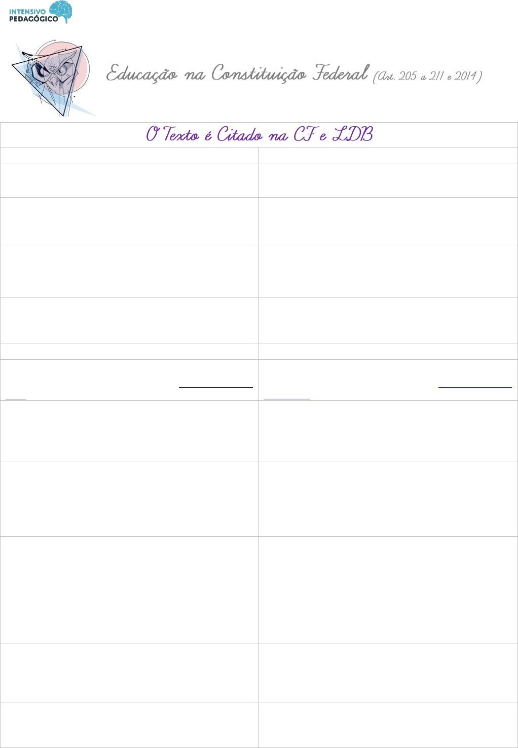 <p>LEGISLAÇÃO EDUCACIONAL</p><p>1</p><p>www.intensivopedagogico.com.br</p><p>CONSTITUIÇÃO FEDERAL LEI DE DIRETRIZES E BASES</p><p>Art. 206. O ensino será ministrado com base nos</p><p>seguintes princípios:</p><p>Art. 3º O ensino será ministrado com base nos</p><p>seguintes princípios:</p><p>Art. 206. I Igualdade de condições para o acesso e</p><p>permanência na escola;</p><p>Art. 3º I Igualdade de condições para o acesso e</p><p>permanência na escola;</p><p>Art. 206. II Liberdade de aprender, ensinar,</p><p>pesquisar e divulgar o pensamento, a arte e o</p><p>saber;</p><p>Art. 3º II Liberdade de aprender, ensinar, pesquisar</p><p>e divulgar a cultura, o pensamento, a arte e o saber;</p><p>Art. 206. IV Gratuidade do ensino público em</p><p>estabelecimentos oficiais;</p><p>Art. 3º VI Gratuidade do ensino público em</p><p>estabelecimentos oficiais;</p><p>Art. 206. VII Garantia de padrão de qualidade. Art. 3º IX Garantia de padrão de qualidade;</p><p>Art. 206. IX - Garantia do direito à educação e à</p><p>aprendizagem ao longo da vida. (Emenda nº 108, de</p><p>2020)</p><p>Art. 3º XIII Garantia do direito à educação e à</p><p>aprendizagem ao longo da vida. (Incluído pela Lei nº</p><p>13.632/2018)</p><p>Art. 208. V - Acesso aos níveis mais elevados do</p><p>ensino, da pesquisa e da criação artística, segundo</p><p>a capacidade de cada um;</p><p>Art. 4º V - Acesso aos níveis mais elevados do</p><p>ensino, da pesquisa e da criação artística, segundo</p><p>a capacidade de cada um;</p><p>Art. 208. VII - atendimento ao educando, em todas</p><p>as etapas da educação básica, por meio de</p><p>programas suplementares de material didático-</p><p>escolar, transporte, alimentação e assistência à</p><p>saúde.</p><p>Art. 4º VIII - atendimento ao educando, em todas</p><p>as etapas da educação básica, por meio de</p><p>programas suplementares de material didático-</p><p>escolar, transporte, alimentação e assistência à</p><p>saúde;</p><p>Art. 210. § 2º O ensino fundamental regular será</p><p>ministrado em língua portuguesa, assegurada às</p><p>comunidades indígenas também a utilização de</p><p>suas línguas maternas e processos próprios de</p><p>aprendizagem.</p><p>Art. 32. § 3º O ensino fundamental regular será</p><p>ministrado em língua portuguesa, assegurada às</p><p>comunidades indígenas a utilização de suas</p><p>línguas maternas e processos próprios de</p><p>aprendizagem.</p><p>Art. 211. A União, os Estados, o Distrito Federal e</p><p>os Municípios organizarão em regime de</p><p>colaboração seus sistemas de ensino.</p><p>Art. 8º A União, os Estados, o Distrito Federal e os</p><p>Municípios organizarão, em regime de</p><p>colaboração, os respectivos sistemas de ensino.</p><p>Art. 208. IV - educação infantil, em creche e pré-</p><p>escola, às crianças até 5 (cinco) anos de idade;</p><p>Art. 4º II - educação infantil gratuita às crianças de</p><p>até 5 (cinco) anos de idade;</p><p>LEGISLAÇÃO EDUCACIONAL</p><p>2</p><p>www.intensivopedagogico.com.br</p><p>Art. 208. VII - § 3º Compete ao Poder Público</p><p>recensear os educandos no ensino fundamental,</p><p>fazer-lhes a chamada e zelar, junto aos pais ou</p><p>responsáveis, pela frequência à escola.</p><p>Art. 5º § 1º O poder público, na esfera de sua</p><p>competência federativa, deverá:</p><p>I - Recensear anualmente as crianças e</p><p>adolescentes em idade escolar, bem como os</p><p>jovens e adultos que não concluíram a educação</p><p>básica;</p><p>II - fazer-lhes a chamada pública;</p><p>III - zelar, junto aos pais ou responsáveis, pela</p><p>frequência à escola.</p><p>Art. 209. O ensino é livre à iniciativa privada,</p><p>atendidas as seguintes condições:</p><p>I - cumprimento das normas gerais da educação</p><p>nacional;</p><p>II - autorização e avaliação de qualidade pelo</p><p>Poder Público.</p><p>Art. 7º O ensino é livre à iniciativa privada,</p><p>atendidas as seguintes condições:</p><p>I Cumprimento das normas gerais da educação</p><p>nacional e do respectivo sistema de ensino;</p><p>II Autorização de funcionamento e avaliação de</p><p>qualidade pelo Poder Público;</p><p>III Capacidade de autofinanciamento, ressalvado o</p><p>previsto no art. 213 da Constituição Federal.</p><p>Art. 206. VI Gestão democrática do ensino</p><p>público, na forma da lei;</p><p>Art. 3º VIII Gestão democrática do ensino público,</p><p>na forma desta Lei e da legislação dos sistemas de</p><p>ensino;</p><p>Art. 206. III Pluralismo de ideias e de concepções</p><p>pedagógicas, e coexistência de instituições</p><p>públicas e privadas de ensino;</p><p>Art. 3º III Pluralismo de ideias e de concepções</p><p>pedagógicas;</p><p>Art. 3º V Coexistência de instituições públicas e</p><p>privadas de ensino;</p><p>Art. 208. O dever do Estado com a educação será</p><p>efetivado mediante a garantia de</p><p>I - Educação básica obrigatória e gratuita dos 4</p><p>(quatro) aos 17 (dezessete) anos de idade,</p><p>assegurada inclusive sua oferta gratuita para</p><p>todos os que a ela não tiveram acesso na idade</p><p>própria;</p><p>Art. 4º O dever do Estado com educação escolar</p><p>pública será efetivado mediante a garantia de:</p><p>I - Educação básica obrigatória e gratuita dos 4</p><p>(quatro) aos 17 (dezessete) anos de idade,</p><p>organizada da seguinte forma</p><p>a) pré-escola</p><p>b) ensino fundamental</p><p>c) ensino médio;</p><p>Art. 4º IV - acesso público e gratuito aos ensinos</p><p>fundamental e médio para todos os que não os</p><p>concluíram na idade própria;</p><p>Art. 208. VII - § 1º O acesso ao ensino obrigatório</p><p>e gratuito é direito público SUBJETIVO.</p><p>Art. 5º O acesso à educação básica obrigatória é</p><p>direito público SUBJETIVO, podendo qualquer</p><p>cidadão, grupo de cidadãos, associação</p><p>comunitária, organização sindical, entida