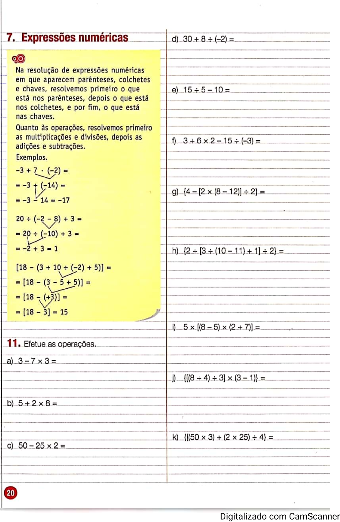 <p>7. Expressões numéricas d) Na resolução de expressões numéricas em que aparecem parênteses, colchetes e chaves, resolvemos primeiro que e) está nos parênteses, depois que está nos colchetes, e por fim, que está nas chaves. Quanto às operações, resolvemos primeiro as multiplicações e divisões, depois as f) adições e subtrações. Exemplos. -3 + (-14) - g) 20 -2+3=1 h) = = [18 - 3] = 15 i) 11. Efetue as operações. a) 3 = j) b) 5+2x8= k) c) 20 Digitalizado com CamScanner</p><p>8. Potenciação de f) (-1)5 = números inteiros g) Quando a base é positiva: sendo expoente par ou impar, o valor da potência é sempre positivo. Exemplo: expoente par Expressões numéricas com potências base potência expoente impar Nas expressões numéricas em que aparecem as quatro operações, mais a potenciação, resolvemos primeiro as base potência potências, seguido das multiplicações e divisões, e por fim as adições e Quando a base é negativa: se subtrações. expoente for par, a potência é positiva. Se o expoente for impar, a potência é negativa. Exemplos: expoente par . base potência expoente impar (+16) . base potência +1 12. Calcule as potências. 13. Resolva as expressões numéricas. a) = a) (+3)2 3 + 5 = b) c) = d) b) e) = 21 Digitalizado com CamScanner</p><p>c) = d) d) e) f) Propriedades da potenciação g) Multiplicação: Conserva-se a base e somam-se os expoentes. Divisão: Conserva-se a base e subtraem- se os expoentes. h) Potência de uma potência: Conserva-se a base e multiplicam-se os expoentes. i) Potência com expoente zero, e base não-nula: é sempre igual a 1. j) 14. Com base nas propriedades da potenciação, resolva. k) b) I) 22 Digitalizado com CamScanner</p>
