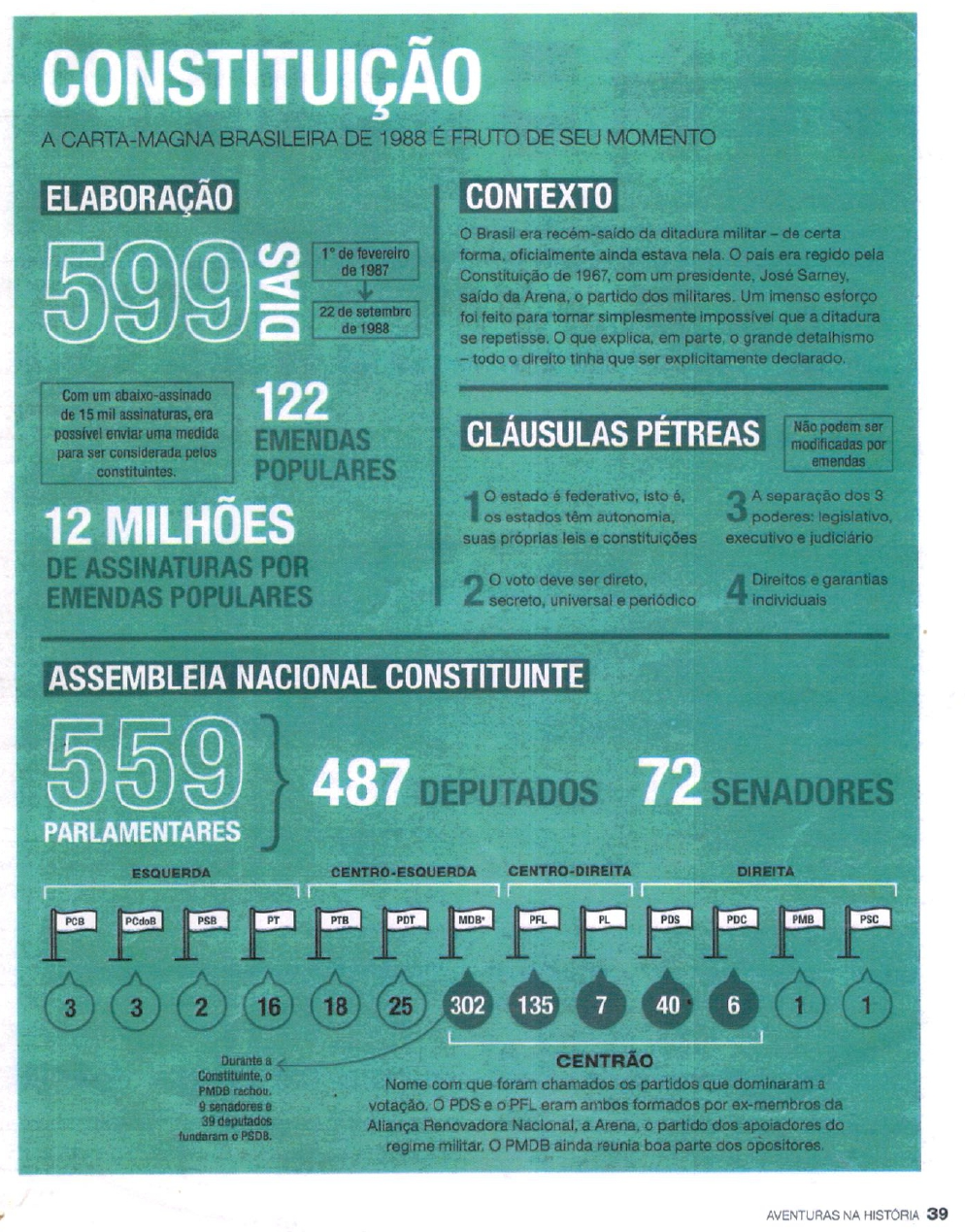 <p>CONSTITUIÇÃO A CARTA-MAGNA BRASILEIRA DE 1988 É FRUTO DE SEU MOMENTO ELABORAÇÃO CONTEXTO Brasil era da ditadura militar - de certa 1° de fevereiro forma, oficialmente ainda estava nela. pais era regido pela de 1987 Constituição de com um presidente, José saído da Arena, partido dos militares. Um imenso esforço 22 de setembro foi feito para tornar simplesmente impossível que a ditadura de 1988 se repetisse. o que explica, em parte, grande detalhismo todo direito tinha que ser explicitamente Com um abaixo-assinado de 15 mil assinaturas, era 122 possível enviar uma medida EMENDAS CLÁUSULAS PÉTREAS Não podem ser modificadas por para ser considerada pelos POPULARES emendas 12 MILHÕES 1 estado é federativo, isto é, 3 A separação dos 3 os estados têm autonomia, poderes: suas próprias leis e constituições executivo e judiciário DE ASSINATURAS POR 2 o voto deve ser direto, EMENDAS POPULARES secreto, universal e periódico 4 Direitos e garantias individuais ASSEMBLEIA NACIONAL CONSTITUINTE 559 487 DEPUTADOS 72 SENADORES PARLAMENTARES ESQUERDA CENTRO-ESQUERDA CENTRO-DIREITA DIREITA PCB PCdoB PSB PT PTB PDT PFL PL PDS PDC PMB PSC 3 3 2 16 18 25 302 135 7 40 6 1 1 Durante 8 CENTRÃO 0 PMDB Nome com que foram chamados os partidos que dominaram a 9 senadores votação. PDS e o PFL eram ambos formados por ex-membros da 39 deputados Aliança Renovadora a Arena partido dos apoiadores do fundaram regime o PMDB ainda reunia boa parte dos AVENTURAS NA HISTÓRIA 39</p>