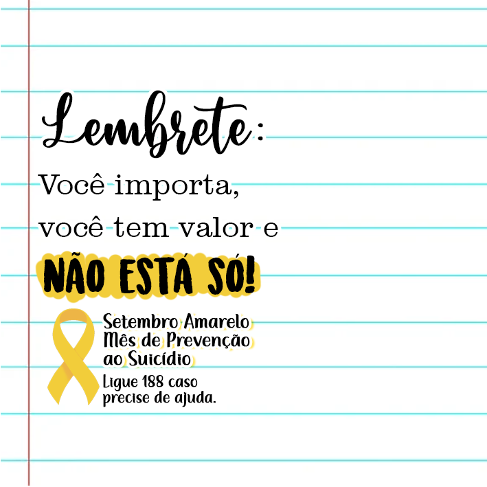 <p>Lembrete: Você importa, - e NÃO ESTA SO! Setembro Amarelo de Prevenção ao Ligue 188 caso precise de ajuda.</p>