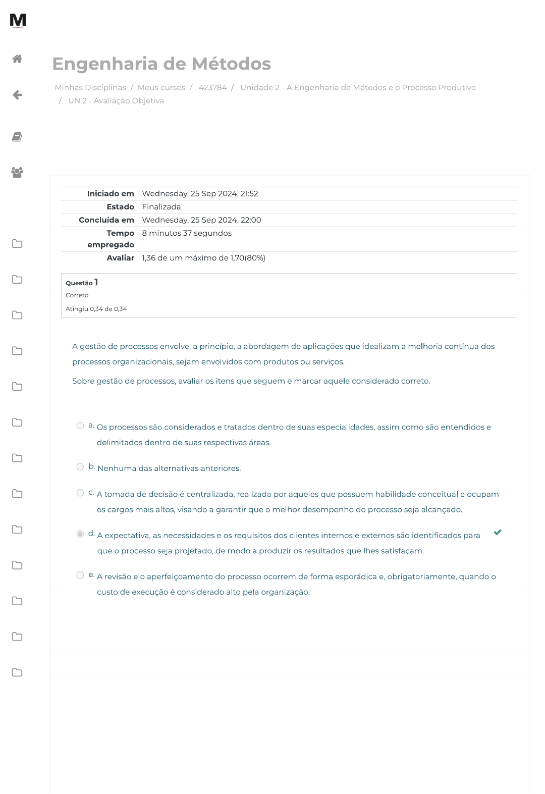 <p>M Engenharia de Métodos Minhas Disciplinas / Meus cursos / 423784 / Unidade 2 A Engenharia de Métodos e Processo Produtivo / UN 2 Avaliação Objetiva Iniciado em Wednesday, 25 Sep 2024, 21:52 Estado Finalizada Concluída em Wednesday, 25 Sep 2024, 22:00 Tempo 8 minutos 37 segundos empregado Avaliar 1,36 de um máximo de 1,70(80%) Questão 1 Correto Atingiu 0,34 de 0,34 A gestão de processos envolve, a princípio, a abordagem de aplicações que idealizam a melhoria contínua dos processos organizacionais, sejam envolvidos com produtos ou serviços. Sobre gestão de processos, avaliar os itens que seguem e marcar aquele considerado correto. a. Os processos são considerados e tratados dentro de suas especialidades, assim como são entendidos e delimitados dentro de suas respectivas áreas. b. Nenhuma das alternativas anteriores. C. A tomada de decisão é centralizada, realizada por aqueles que possuem habilidade conceitual e ocupam os cargos mais altos, visando a garantir que melhor desempenho do processo seja alcançado. d. A expectativa, as necessidades e os requisitos dos clientes internos e externos são identificados para que processo seja projetado, de modo a produzir os resultados que lhes satisfaçam. e. A revisão e aperfeiçoamento do processo ocorrem de forma esporádica e, obrigatoriamente, quando custo de execução é considerado alto pela organização.</p><p>Questão 2 M Correto Atingiu 0,34 de 0,34 De forma prática, avaliar a produtividade significa tratar de uma ferramenta de gestão de recursos, no caso, a mão de obra, utilizando critérios bem-definidos e métricas, para avaliar desempenho individual dos colaboradores e, também, desempenho coletivo da equipe. A avaliação da produtividade na organização também envolve a avaliação da capacidade produtiva; e ambos constam no estudo dos tempos e métodos. Analisar as alternativas a seguir e marcar aquela que não se encaixa nas melhorias relacionadas ao estudo apresentado no enunciado da questão. a. estudo dos tempos e métodos é direcionado à análise do tempo de trabalho exercido pelas pessoas ou em combinação com as máquinas. b. Os produtos abrangem métodos considerados ineficientes. C. Pode ser empregada em projetos de novos sistemas de produção. d. Trata-se de uma metodologia utilizada para qualquer tipo de trabalho. e. Sistemas de produção são compostos basicamente pelos recursos materiais, como instalações e equipamentos. Questão 3 Correto Atingiu 0,34 de 0,34 Para criar ou racionalizar alguns processos, é muito importante seguir princípios. estudo e a análise de melhoria de processos abrange alguns princípios que devem ser observados e um deles se chama princípio da parcimônia. Analisar as alternativas que seguem e marcar aquela que se refere ao princípio apresentado no enunciado da questão. a. Um processo elaborado deve ser somente utilizado se existir uma finalidade específica. b. Nenhum item descrito se relaciona ao princípio da parcimônia. C. Um processo de trabalho elaborado de forma satisfatória (que atenda aos requisitos básicos) não deve ter mais dados que os necessários. d. Um processo deve estar com suas tarefas para que sejam executadas na ordem cronológica. Dessa forma, garante-se a consistência dos dados. e. Um processo deve estar pronto para iniciar uma tarefa dentro de uma determinada operação, utilizando dados das fontes existentes.</p><p>Questão 4 M Incorreto Atingiu 0,00 de 0,34 Para entendimento da engenharia de métodos, é importante a compreensão do mapeamento de processos e este adota algumas etapas na sua metodologia. Avaliar os itens que seguem e marcar aquele que apresenta corretamente uma etapa da execução do mapeamento de processos. a. Na segunda etapa, ocorrem as entrevistas com os responsáveis pelas atividades desempenhadas nos processos. b. Na segunda etapa, tem-se a definição de fronteiras e dos clientes do processo, considerando os principais inputs e outputs. C. Na quarta etapa, tem-se a criação do modelo baseado na informação adquirida. x d. Na terceira etapa, a análise de especificações do projeto e dos clientes do processo, considerando os principais inputs e outputs. e. As atividades relacionadas à modelagem de processos, podem ser realizadas fazendo uso de ferramentas tecnológicas disponíveis no mercado. Questão 5 Correto Atingiu 0,34 de 0,34 estudo relacionado aos métodos de trabalho busca padronizar tarefas com foco na qualidade e na quantidade e, espera-se que sejam alcançadas com eficiência e segurança. As alternativas a seguir tratam de técnicas de análise e métodos. Analisar as alternativas que seguem e marcar aquela que apresenta técnicas que não podem ser usadas quando se analisam métodos de trabalho. a. Fluxo das atividades relacionadas às equipes formadas para realizar tarefas ou operações, utilizando-se de diagramas de atividades. b. Fluxo de operadores e de materiais e, para tal, usa-se diagramas de Gantt. C. Movimentos relacionados ao corpo, utilizando-se de diagramas de operações. d. Fluxo de operadores e de materiais e, para tanto, usa-se diagramas de fluxo e de processos. e. As tarefas de operadores e de máquinas, utilizando-se de diagramas de atividades. Conteúdo Online Seguir para...</p><p>Conteúdo Online M</p>