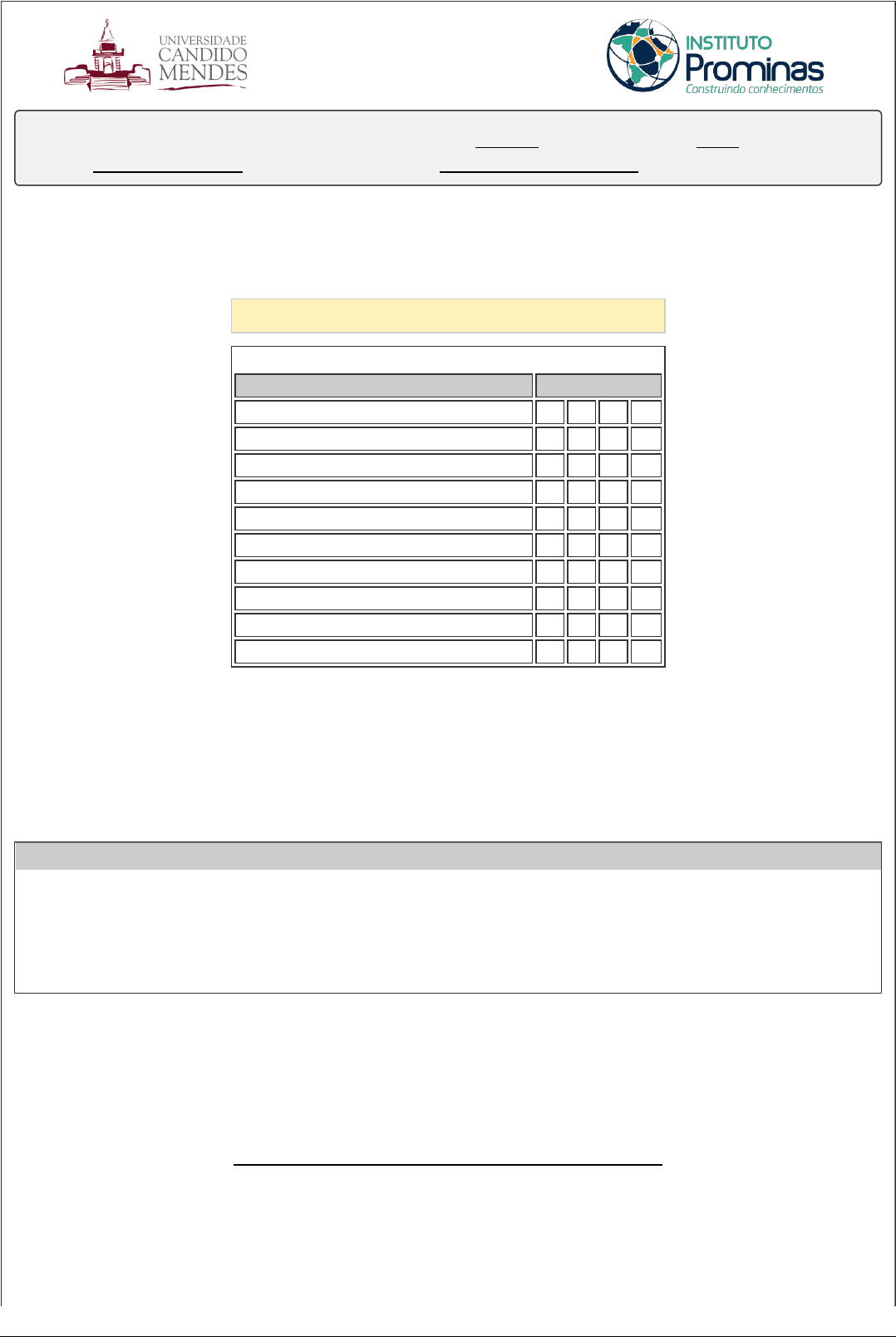 <p>Avaliação Inicial</p><p>Nome completo: ALESBELL ALVES CAMPELLO RA: 110671 Data da prova:</p><p>Curso: GESTÃO ESCOLAR Unidade de Estudo:</p><p>Código da Avaliação: 002614252D</p><p>Metodologia do Trabalho Científico</p><p>QUESTÃO ALTERNATIVAS</p><p>1 A B C D</p><p>2 A B C D</p><p>3 A B C D</p><p>4 A B C D</p><p>5 A B C D</p><p>6 A B C D</p><p>7 A B C D</p><p>8 A B C D</p><p>9 A B C D</p><p>10 A B C D</p><p>Data de emissão: 04/04/2020</p><p>A CORREÇÃO ACONTECERÁ SOMENTE PELO GABARITO</p><p>Instrução para a Avaliação a Distância</p><p>- Devolver a prova juntamente com o gabarito.</p><p>- Cada questão tem apenas 01(uma) alternativa correta.</p><p>- Não pode ter rasura.</p><p>- Use caneta azul ou preta.</p><p>ASSINATURA POR EXTENSO DO ALUNO</p><p>Pag. 1</p><p>Metodologia do Trabalho Científico 002614252</p><p>1) Os conceitos de método, que ora apresentamos, foram fundamentados em focos que remetem aos caminhos da</p><p>metodologia, pois a história do método científico se confunde com a história da própria ciência. Salienta-se a</p><p>importância da escolha de um método de pesquisa, por certificar que não há ciência sem método, embora nem</p><p>todos os estudos se constituam em ciência. Nesse sentindo as definições: :</p><p>A.( ) Papel da ciência: Trazer luz onde reinam as trevas. O rigor científico nega, na sua essência, as crendices, a magia, as</p><p>superstições antigas e atuais.</p><p>B.( ) Todas as alternativas acima encontram-se corretas</p><p>C.( ) A metodologia científica nos ensina um caminho para chegarmos a um fim científico. A palavra "científica" vem de ciência.</p><p>D.( ) A metodologia corresponde a um conjunto de procedimentos a serem utilizados na obtenção do conhecimento. É a</p><p>aplicação do método através de técnicas que garantem a legitimidade do saber obtido.</p><p>2) O primeiro passo no processo é identificar um problema ou desenvolver uma pergunta de pesquisa. O problema</p><p>de pesquisa pode ser algo que a agência identifica como um problema, algum conhecimento ou informação. Quanto</p><p>aos demais passos:</p><p>:</p><p>A.( ) Coleta de Dados: A coleta de dados compreende o conjunto de operações por meio das quais o modelo de análise é</p><p>confrontado aos dados coletados.</p><p>B.( ) Revisão de Literatura: Depois de entender o problema, o pesquisador deve entrar em detalhes sobre o tópico. Isso pode ser</p><p>feito através da revisão da literatura e trabalhos anteriores realizados sobre o tema da pesquisa. Isso ajudará a fornecer algumas</p><p>informações sobre o problema de pesquisa ao pesquisador.</p><p>C.( ) Todas as alternativas estão corretas</p><p>D.( ) Esclareça o problema: O problema inicial identificado pelo pesquisador geralmente tem um escopo bastante amplo e</p><p>levaria muito tempo e energia.</p><p>3) É importante enfatizar que a abordagem indutiva não implica desconsiderar as teorias ao formular questões e</p><p>objetivos de pesquisa. Essa abordagem visa gerar significados a partir do conjunto de dados coletados, a fim de</p><p>identificar padrões e relacionamentos para construir uma teoria; no entanto, a abordagem indutiva não impede o</p><p>pesquisador de usar a teoria existente para formular a questão de pesquisa a ser explorada (Saunders, 2012).</p><p>Ainda sobre o raciocínio indutivo podemos afirmar que:</p><p>:</p><p>A.( ) Todas as alternativas acima estão corretas</p><p>B.( ) O raciocínio indutivo é baseado no aprendizado da experiência. Padrões, semelhanças e regularidades na experiência</p><p>(premissas) são observados para se chegar a conclusões (ou gerar teoria).</p><p>C.( ) O raciocínio indutivo começa com observações detalhadas do mundo, que avançam em direção a generalizações e ideias</p><p>mais abstratas</p><p>D.( ) Ao seguir uma abordagem indutiva, começando com um tópico, um pesquisador tende a desenvolver generalizações</p><p>empíricas</p><p>4) O método dedutivo, por sua vez, realiza-se por meio do desenvolvimento de um raciocínio lógico, que tem por</p><p>ponto de partida uma ideia geral, uma verdade estabelecida, da qual decorrerão preposições particulares. O</p><p>raciocínio, neste caso: :</p><p>A.( ) parte de uma ideia geral para conclusões particulares. Enquanto que o processo analógico apenas um raciocínio não</p><p>baseado em razões de relevante similitude.</p><p>B.( ) parte de uma ideia central para conclusões complementares. Enquanto que o processo analógico representa um raciocínio</p><p>baseado em razões de relevante similitude.</p><p>C.( ) parte de uma ideia geral para conclusões particulares. Enquanto que o processo analógico representa um raciocínio</p><p>baseado em razões de relevante similitude.</p><p>D.( ) parte de uma ideia geral para introduções particulares. Enquanto que o processo analógico representa um raciocínio</p><p>baseado em razões de irrelevantes</p><p>Pag. 2</p><p>Metodologia do Trabalho Científico 002614252</p><p>5) O modelo ou método hipotético-dedutivo é uma descrição proposta do científico. Segundo ele, a investigação</p><p>científica prossegue formulando uma hipótese de uma forma que pode ser falsificável, usando um teste em dados</p><p>observáveis onde o resultado ainda não é conhecido. Um resultado de teste que pode ter e é contrário às previsões</p><p>da hipótese é considerado</p><p>:</p><p>A.( ) Todas as questões encontram-se corretas por corresponderem ao modelo ou método hipotético-dedutivo.</p><p>B.( ) uma falsificação da hipótese. Um resultado de teste que poderia ter, mas não corre contrário à hipótese, corrobora a teoria.</p><p>C.( ) O método hipotético-dedutivo, ou o teste de hipóteses, não levanta problemas em princípio, uma vez que sua validade</p><p>depende dos resultados do teste empírico apropriado.</p><p>D.( ) Propõe-se, então, comparar o valor explicativo das hipóteses concorrentes, testando quão rigorosamente el