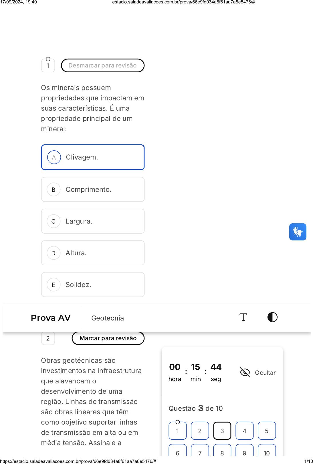 <p>A</p><p>B</p><p>C</p><p>D</p><p>E</p><p>1 Desmarcar para revisão</p><p>Os minerais possuem</p><p>propriedades que impactam em</p><p>suas características. É uma</p><p>propriedade principal de um</p><p>mineral:</p><p>Clivagem.</p><p>Comprimento.</p><p>Largura.</p><p>Altura.</p><p>Solidez.</p><p>2 Marcar para revisão</p><p>Obras geotécnicas são</p><p>investimentos na infraestrutura</p><p>que alavancam o</p><p>desenvolvimento de uma</p><p>região. Linhas de transmissão</p><p>são obras lineares que têm</p><p>como objetivo suportar linhas</p><p>de transmissão em alta ou em</p><p>média tensão. Assinale a</p><p>00</p><p>hora</p><p>: 15</p><p>min</p><p>: 44</p><p>seg</p><p>Ocultar</p><p>Questão 3 de 10</p><p>1 2 3 4 5</p><p>6 7 8 9 10</p><p>Prova AV Geotecnia</p><p>17/09/2024, 19:40 estacio.saladeavaliacoes.com.br/prova/66e9fd034a8f61aa7a8e5476/#</p><p>https://estacio.saladeavaliacoes.com.br/prova/66e9fd034a8f61aa7a8e5476/# 1/10</p><p>A</p><p>B</p><p>C</p><p>configuração que faz sentido a</p><p>respeito da montagem e do</p><p>material que eles possuem:</p><p>Postes de madeira</p><p>são formados por</p><p>pequenas peças que</p><p>são pregadas uma na</p><p>outra.</p><p>Torres de transmissão</p><p>são estruturas</p><p>metálicas grandes</p><p>formadas da</p><p>montagem de várias</p><p>peças metálicas</p><p>menores</p><p>aparafusadas.</p><p>Postes de concreto</p><p>são leves e fáceis de</p><p>serem transportados.</p><p>Respondidas �10� Em branco �0�</p><p>Finalizar prova</p><p>17/09/2024, 19:40 estacio.saladeavaliacoes.com.br/prova/66e9fd034a8f61aa7a8e5476/#</p><p>https://estacio.saladeavaliacoes.com.br/prova/66e9fd034a8f61aa7a8e5476/# 2/10</p><p>D</p><p>E</p><p>Torres de</p><p>transmissão, em</p><p>virtude de sua leveza,</p><p>são geralmente</p><p>transportadas e</p><p>montadas inteiriças</p><p>no local de sua</p><p>instalação.</p><p>Postes metálicos já</p><p>foram muito utilizados</p><p>em tempos mais</p><p>antigos, em virtude</p><p>principalmente de seu</p><p>pequeno peso de</p><p>instalação.</p><p>3 Marcar para revisão</p><p>Obras geotécnicas são</p><p>investimentos na infraestrutura</p><p>que alavancam o</p><p>desenvolvimento de uma</p><p>região. A construção de túneis</p><p>é um avanço que encurta</p><p>distâncias, dando passagem</p><p>direta através de certos</p><p>obstáculos, que podem ser</p><p>elevações, rios, canais e áreas</p><p>densamente povoadas. Uma</p><p>sequência possível para uma</p><p>escavação em rocha para um</p><p>túnel:</p><p>17/09/2024, 19:40 estacio.saladeavaliacoes.com.br/prova/66e9fd034a8f61aa7a8e5476/#</p><p>https://estacio.saladeavaliacoes.com.br/prova/66e9fd034a8f61aa7a8e5476/# 3/10</p><p>A</p><p>B</p><p>C</p><p>D</p><p>E</p><p>Perfuração da frente</p><p>de escavação -</p><p>carregamento dos</p><p>furos com explosivos</p><p>- detonação dos</p><p>explosivos</p><p>Escoramento para o</p><p>teto do túnel -</p><p>remoção da água de</p><p>infiltração -</p><p>detonação dos</p><p>explosivos</p><p>Detonação dos</p><p>explosivos -</p><p>Carregamento dos</p><p>furos com explosivos</p><p>- Perfuração da frente</p><p>de escavação</p><p>Limpeza dos detritos</p><p>e da poeira -</p><p>Carregamento dos</p><p>furos com explosivos</p><p>- Remoção da água</p><p>de infiltração</p><p>Colocação do</p><p>revestimento -</p><p>Colocação do</p><p>escoramento para o</p><p>teto - Remoção da</p><p>água de infiltração</p><p>17/09/2024, 19:40 estacio.saladeavaliacoes.com.br/prova/66e9fd034a8f61aa7a8e5476/#</p><p>https://estacio.saladeavaliacoes.com.br/prova/66e9fd034a8f61aa7a8e5476/# 4/10</p><p>A</p><p>B</p><p>C</p><p>D</p><p>E</p><p>A</p><p>B</p><p>4 Marcar para revisão</p><p>As rochas sedimentares se</p><p>formam da compactação e</p><p>consolidação de sedimentos</p><p>sob elevadas pressões. É uma</p><p>rocha sedimentar:</p><p>Arenito.</p><p>Gnaisse.</p><p>Xisto.</p><p>Basalto.</p><p>Mármore.</p><p>5 Marcar para revisão</p><p>As rochas podem ser</p><p>enquadradas em diferentes</p><p>classificações. É uma rocha</p><p>metamórfica:</p><p>Granito.</p><p>Gnaisse.</p><p>17/09/2024, 19:40 estacio.saladeavaliacoes.com.br/prova/66e9fd034a8f61aa7a8e5476/#</p><p>https://estacio.saladeavaliacoes.com.br/prova/66e9fd034a8f61aa7a8e5476/# 5/10</p><p>C</p><p>D</p><p>E</p><p>A</p><p>B</p><p>C</p><p>D</p><p>E</p><p>Gabro.</p><p>Basalto.</p><p>Calcário.</p><p>6 Marcar para revisão</p><p>As estruturas de contenção</p><p>fornecem estabilidade para a</p><p>obra. É um tipo de obra que</p><p>não utiliza estrutura de</p><p>contenção:</p><p>Gabião-caixa</p><p>Muro de concreto</p><p>armado</p><p>Retaludamento</p><p>Solo-pneu</p><p>Muro de solo-cimento</p><p>7 Marcar para revisão</p><p>Diferentes tipos de dispositivos</p><p>podem ser empregados na</p><p>17/09/2024, 19:40 estacio.saladeavaliacoes.com.br/prova/66e9fd034a8f61aa7a8e5476/#</p><p>https://estacio.saladeavaliacoes.com.br/prova/66e9fd034a8f61aa7a8e5476/# 6/10</p><p>A</p><p>B</p><p>C</p><p>D</p><p>E</p><p>estabilização e contenção de</p><p>taludes.</p><p>Na figura abaixo, o dispositivo</p><p>marcado é um (uma):</p><p>Fonte: MORALES, Paulo</p><p>Roberto Dias. Curso de</p><p>Drenagem Urbana e Meio</p><p>Ambiente. Instituto Militar de</p><p>Engenharia. �2003, pág.34,</p><p>adaptado)</p><p>Valeta</p><p>Tirante</p><p>Sarjeta</p><p>Dreno</p><p>Revestimento vegetal</p><p>17/09/2024, 19:40 estacio.saladeavaliacoes.com.br/prova/66e9fd034a8f61aa7a8e5476/#</p><p>https://estacio.saladeavaliacoes.com.br/prova/66e9fd034a8f61aa7a8e5476/# 7/10</p><p>A</p><p>B</p><p>C</p><p>D</p><p>E</p><p>8 Marcar para revisão</p><p>As obras que utilizam</p><p>estruturas de contenção</p><p>podem ser classificadas em</p><p>ativas e passivas. É uma obra</p><p>de contenção ativa:</p><p>Muro de gravidade</p><p>Muro de concreto</p><p>armado</p><p>Retaludamento</p><p>Cortina atirantada</p><p>Reforço de maciço</p><p>9 Marcar para revisão</p><p>Na Gestão Ambiental, a</p><p>g