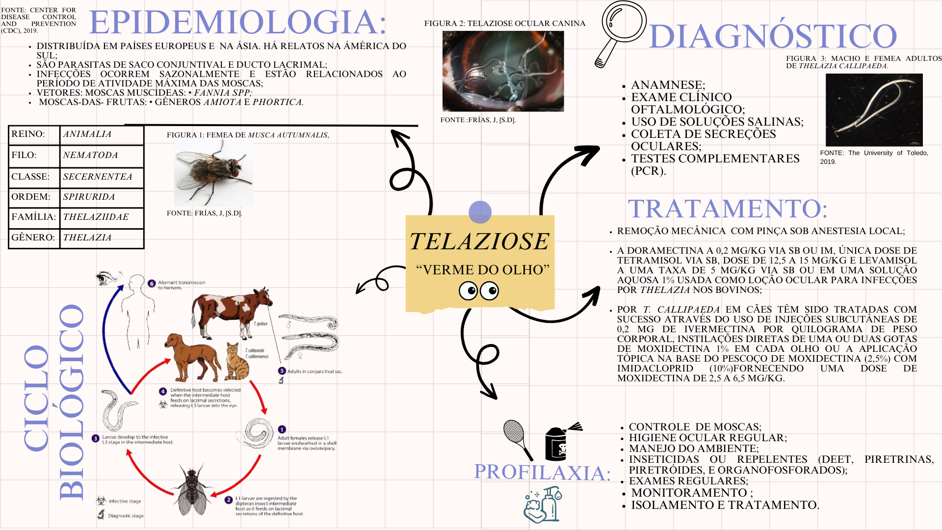 <p>FONTE: CENTER FOR DISEASE CONTROL AND PREVENTION EPIDEMIOLOGIA FIGURA 2: TELAZIOSE OCULAR CANINA (CDC). 2019. DIAGNÓSTICO DISTRIBUÍDA EM PAÍSES EUROPEUS E NA RELATOS NA DO SUL: FIGURA 3: MACHO E FEMEA ADULTOS SÃO PARASITAS DE SACO E DUCTO LACRIMAL: DE THELAZIA INFECÇÕES OCORREM SAZONALMENTE E ESTÃO RELACIONADOS AO DE ATIVIDADE MÁXIMA DAS MOSCAS: ANAMNESE: VETORES: MOSCAS MOSCAS-DAS- FRUTAS: AMIOTA E EXAME CLÍNICO FONTE J. [S.D]. USO DE SOLUÇÕES SALINAS: REINO: ANIMALIA FIGURA 1: FEMEA DE MUSCA COLETA DE SECREÇÕES FILO: NEMATODA FONTE: The University of Toledo, TESTES COMPLEMENTARES 2019. CLASSE: SECERNENTEA (PCR). SPIRURIDA FAMÍLIA: FONTE: [S.D]. TRATAMENTO: REMOÇÃO MECÂNICA COM SOB ANESTESIA LOCAL: GÊNERO: THELAZIA TELAZIOSE A DORAMECTINA A 0,2 MG/KG VIA SB OU ÚNICA DOSE DE TETRAMISOL VIA SB. DOSE DE 12,5 A 15 MG/KG E LEVAMISOL "VERME DO OLHO" A UMA TAXA DE 5 MG/KG VIA SB OU EM UMA SOLUÇÃO Aberrant transmission AQUOSA 1% USADA COMO LOÇÃO OCULAR PARA INFECÇÕES to humans POR THELAZIA NOS BOVINOS: POR T. CALLIPAEDA EM CÃES TÊM SIDO TRATADAS COM SUCESSO ATRAVÉS DO USO DE DE 0,2 MG DE IVERMECTINA POR QUILOGRAMA DE PESO DIRETAS DE UMA DUAS GOTAS DE MOXIDECTINA 1% EM CADA OLHO OU A TOPICA NA BASE DO PESCOÇO DE MOXIDECTINA (2,5%) COM Adults conjunctiva IMIDACLOPRID (10%)FORNECENDO UMA DOSE DE I MOXIDECTINA DE 2,5 A 6,5 MG/KG. Definitive host becomes infected when the intermediate host feeds on secretions releasing L larvae into the eye 1 CONTROLE DE MOSCAS: 3 Larvae develop to the infective Adult females release L1 HIGIENE OCULAR L3 stage in the intermediate host larvae ensheathed shel membrane via MANEJO DO INSETICIDAS OU REPELENTES (DEET, PIRETRINAS, PROFILAXIA: E ORGANOFOSFORADOS) EXAMES MONITORAMENTO ; stage 2 are ingested by the dipteran insect intermediate ISOLAMENTO E TRATAMENTO. host asit feeds on lacrimal Diagnostic stage secretions of the definitive host</p>