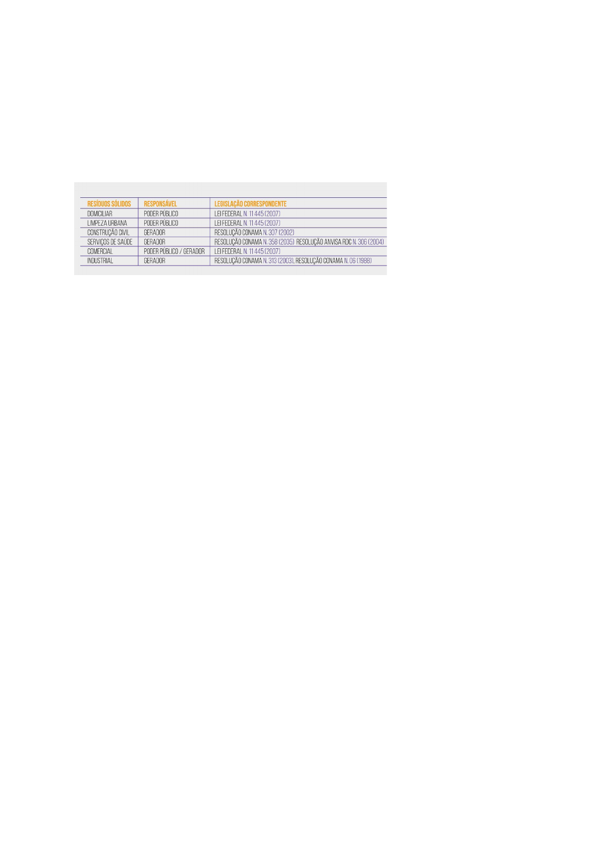 <p>Você foi contratado pelo poder público municipal para auxiliar na organização do sistema</p><p>de gestão dos resíduos sólidos, de forma a atender aos critérios técnicos que constam</p><p>em normas e legislações.</p><p>Para tanto, o trabalho inicial é elencar as principais tipologias de resíduos sólidos quanto</p><p>à sua origem e aos responsáveis pelo seu manejo, lembrando que deve haver um</p><p>embasamento legal para que o trabalho de fato seja posto em prática.</p>