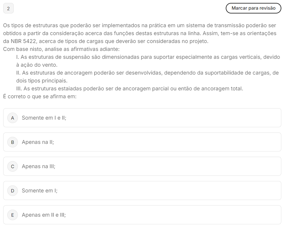 <p>2 Marcar para revisão Os tipos de estruturas que poderão ser implementados na prática em um sistema de transmissão poderão ser obtidos a partir da consideração acerca das funções destas estruturas na linha. Assim, tem-se as orientações da NBR 5422, acerca de tipos de cargas que deverão ser consideradas no projeto. Com base nisto, analise as afirmativas adiante: I. As estruturas de suspensão são dimensionadas para suportar especialmente as cargas verticais, devido à ação do vento. II. As estruturas de ancoragem poderão ser desenvolvidas, dependendo da suportabilidade de cargas, de dois tipos principais. III. As estruturas estajadas poderão ser de ancoragem parcial ou então de ancoragem total. É correto que se afirma em: A Somente em e II; B Apenas na II; C Apenas na III; D Somente em I; E Apenas em e III;</p>