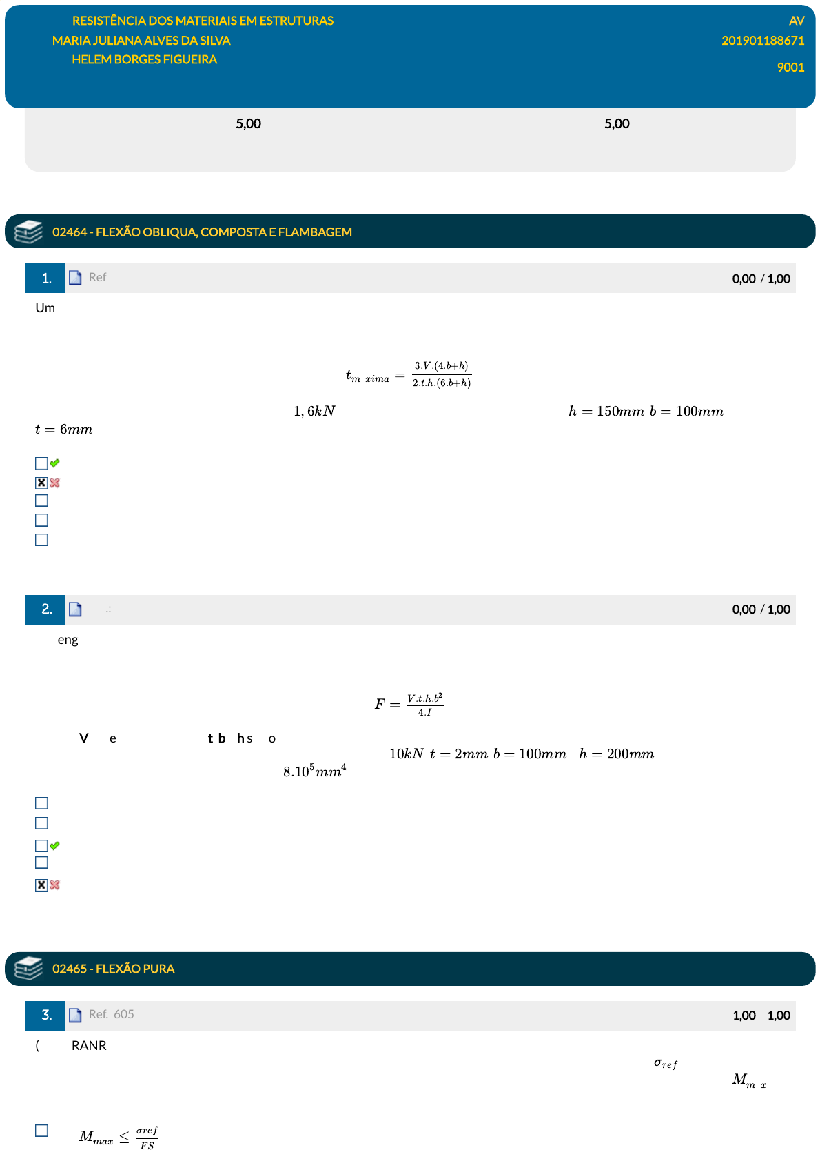 <p>RESISTÊNCIA DOS MATERIAIS EM ESTRUTURAS AV MARIA JULIANA ALVES DA SILVA 201901188671 HELEM BORGES FIGUEIRA 9001 5,00 5,00 02464 - FLEXÃO OBLIQUA, COMPOSTA E FLAMBAGEM 1. Ref 0,00 / 1,00 Um tm = 2.t.h.(6.b+h) 1, 6kN h= 150mm b 100mm t = 6mm 2. eng e 10kNt=2mmb=100mmh 200mm 02465 - FLEXÃO PURA 3. Ref. 605 1,00 1,00 ( RANR M m a Mmax max</p>