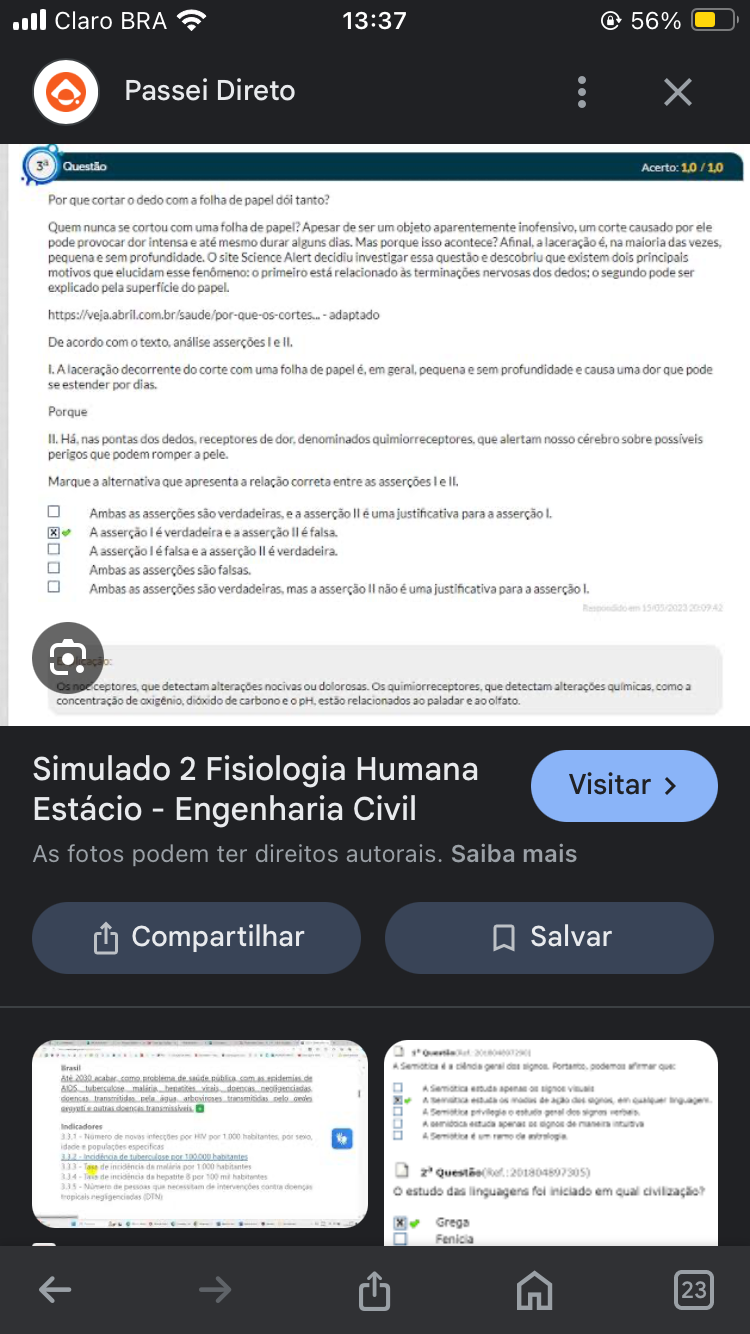 <p>Claro BRA 13:37 56% Passei Direto X Questão Acerto: 1.0 Por que cortar dedo com a folha de papel tanto? Quem nunca se cortou com uma folha de papel? Apesar de ser um objeto aparentemente um corte causado por ele pode provocar dor intensa e até mesmo durar alguns Mas porque isso acontece? a laceração na maioria das pequena e sem profundidade. site Science Alert decidiu investigar essa questão e descobriu que existem dois principais motivos que elucidam esse primeiro está relacionado às terminações nervosas dos segundo pode ser explicado pela do adaptado De acordo com texto. asserções le II. A laceração decorrente do corte com uma folha de papel em pequena e sem profundidade e causa uma dor que pode se estender por Porque II. nas pontas dos receptores de dor. denominados que alertam nosso cérebro sobre possíveis perigos que podem romper a pele. Marque a alternativa que apresenta a relação correta entre as asserções le II. Ambas as asserções são e a asserção II é uma justificativa para a asserção A asserção I é verdadeira e a asserção é A asserção I é falsa e a asserção II é Ambas as asserções são Ambas as asserções são mas a asserção II não é uma justificativa para a asserção que detectam alterações nocivas ou Os que detectam alterações como a concentração de dióxido de carbono e pH. estão relacionados ao paladar e Simulado 2 Fisiologia Humana Visitar > Estácio - Engenharia Civil As fotos podem ter direitos autorais. Saiba mais Compartilhar Salvar Até 2030 como de de tuberculose pela transmitidas pelo of Indicadores a de de novas por por por de idade populações especificas de tuberculose habitantes de por habitantes de 8 100 335 de que de intervenções contra estudo das linguagens foi iniciado em qual tropicals Grega Fenicia 23</p>