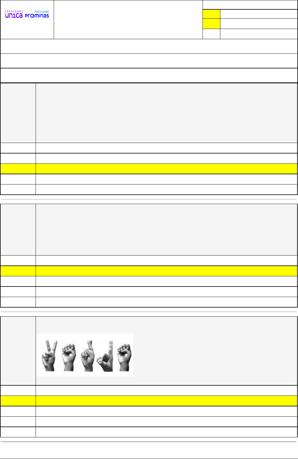 <p>Pincel Atômico - 26/09/2024 13:11:55 1/3</p><p>NAYARA TATIANA DA</p><p>SILVA CRUZ</p><p>Exercício Caminho do Conhecimento - Etapa 10 (23098)</p><p>Atividade finalizada em 26/09/2024 13:11:37 (2677374 / 1)</p><p>LEGENDA</p><p>Resposta correta na questão</p><p># Resposta correta - Questão Anulada</p><p>X Resposta selecionada pelo Aluno</p><p>Disciplina:</p><p>LIBRAS: ASPECTOS DA ESTRUTURA GRAMATICAL [1267417] - Avaliação com 8 questões, com o peso total de 3,33 pontos [capítulos - 5]</p><p>Turma:</p><p>Segunda Graduação: Licenciatura em Educação Especial para Licenciados - Grupo: SETEMBRO/2024 - SGice0A130824 [139587]</p><p>Aluno(a):</p><p>91662144 - NAYARA TATIANA DA SILVA CRUZ - Respondeu 4 questões corretas, obtendo um total de 1,67 pontos como nota</p><p>[359900_164689]</p><p>Questão</p><p>001</p><p>PROGEP- FURG – 2019 – adaptada Na Libras, são parâmetros para a formação de</p><p>sinais as alternativas abaixo:</p><p>I- Datilologia.</p><p>II- Movimento.</p><p>III- Expressão facial e corporal.</p><p>IV- Orientação.</p><p>Assinale a alternativa correta:</p><p>II e IV.</p><p>I, II, III e IV.</p><p>X II, III e IV.</p><p>I e IV.</p><p>I e III.</p><p>[359902_152465]</p><p>Questão</p><p>002</p><p>COPEVE - UFAL – 2019 - adaptada</p><p>Há na Libras, assim como nas demais línguas naturais, processos semânticos de</p><p>categorização. Um sinal como INSETOS pode englobar diversos outros sinais como</p><p>FORMIGA, BARATA, BORBOLETA, etc.</p><p>Neste caso, podemos classificar INSETO em relação a estes sinais como um:</p><p>Sinônimo.</p><p>X Hiperônimo.</p><p>Parônimo.</p><p>Hipônimo.</p><p>Merônimo</p><p>[359901_152464]</p><p>Questão</p><p>003</p><p>VUNESP - 2019</p><p>Observe a palavra a seguir:</p><p>Assinale a alternativa que contém o significado da datilologia apresentada.</p><p>X Verme.</p><p>Verde.</p><p>Vezes.</p><p>Meses.</p><p>Fezes.</p><p>Pincel Atômico - 26/09/2024 13:11:55 2/3</p><p>[359902_152466]</p><p>Questão</p><p>004</p><p>INSTITUTO AOCP – 2016 – adaptada</p><p>A arbitrariedade na língua de sinais aplica-se à forma, significado e à grande parte</p><p>da sua estrutura gramatical. Assinale a alternativa que corresponde somente a sinais</p><p>arbitrários.</p><p>Pato – Sapo – Tartaruga.</p><p>Zebra – Cavalo – Boi.</p><p>X Cinza – Roxo – Lilás.</p><p>Macaco – Leão – Insetos.</p><p>Laranja – Claro – Branco.</p><p>[359900_152461]</p><p>Questão</p><p>005</p><p>INSTITUTO AOCP – 2020 – adaptada</p><p>Assinale as alternativas em que todos os sinais são realizados na testa.</p><p>X Insetos – Porco – Macaco.</p><p>Coelho – Galinha – Vaca.</p><p>Boi – Onça – Ovelha.</p><p>Pato – Girafa – Cavalo.</p><p>Urso – Peixe – Zebra.</p><p>[359901_152463]</p><p>Questão</p><p>006</p><p>Podem ser considerados pares mínimos:</p><p>cinza e prateado.</p><p>boi e vaca.</p><p>sapo e pato.</p><p>X amarelo e dourado.</p><p>porco e rinoceronte.</p><p>[359900_152459]</p><p>Questão</p><p>007</p><p>FADESP- 2021 – adaptada</p><p>Gonçalves (2016), em seu estudo, reflete que é necessário compreender que os</p><p>sujeitos Surdos, em especial, os sinalizadores, se comunicam de forma viso-espacial</p><p>e têm como referência a configuração das mãos, o movimento, o ponto de</p><p>articulação, a orientação e a expressão facial e corporal. Em relação à configuração</p><p>de mão, marque a opção que corresponde, respectivamente, a sequência dos sinais</p><p>realizados/finalizados com as seguintes configurações:</p><p>X PEIXE – NAMORAR – GATO – RINOCERONTE – TARTARUGA.</p><p>VERDE – ZEBRA – ROSA – EXEMPLO – ÁGUA.</p><p>ESCORPIÃO – ÁGUA – MACACO - AZUL – OVELHA.</p><p>LILÁS – DOURADO – MOSQUITO – VACA – CINZA.</p><p>VERDE – AMARELO – ROSA – BOI – PORCO.</p><p>Pincel Atômico - 26/09/2024 13:11:55 3/3</p><p>[359900_152460]</p><p>Questão</p><p>008</p><p>FEPESE- 2018 – adaptada</p><p>Na descrição do sinal “configuração da mão dominante em C; locação da mão</p><p>dominante no dorso da mão de apoio; orientação da palma da mão de apoio para</p><p>baixo”, temos o sinal em Libras de</p><p>cinza.</p><p>coelho.</p><p>cavalo.</p><p>X roxo.</p><p>claro.</p>