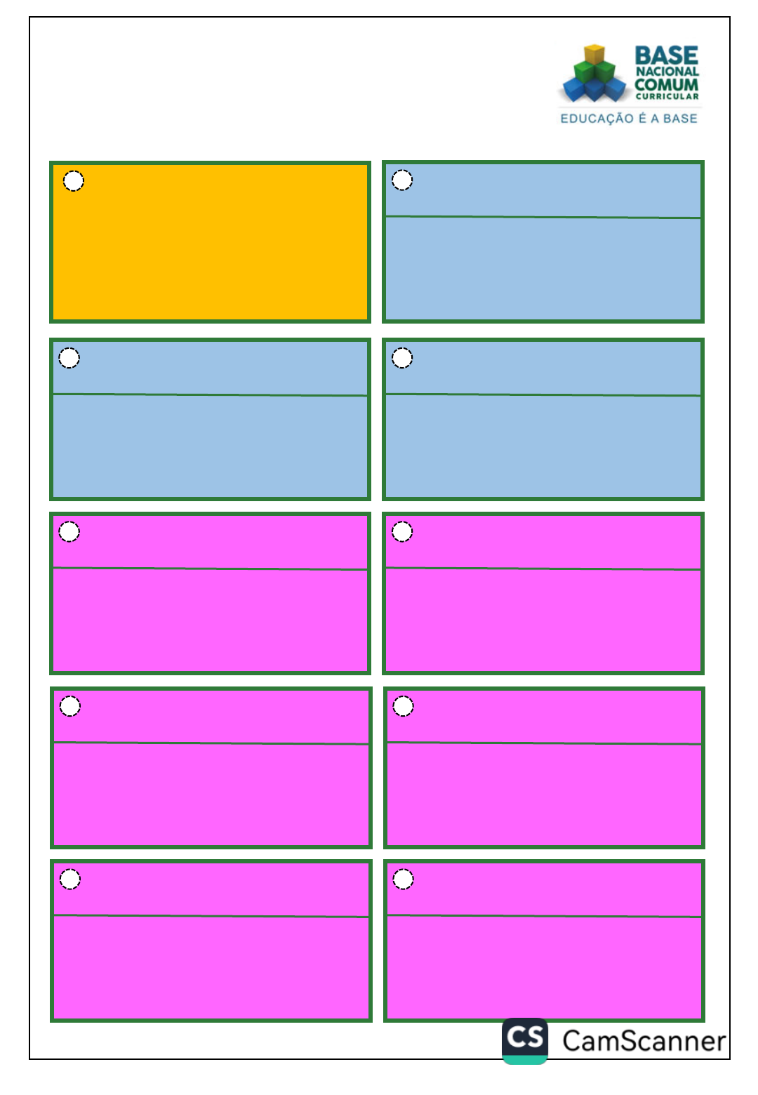 <p>BNCC - MATERNAL</p><p>FAIXA ETÁRIA</p><p>Bebês</p><p>(zero a 1 ano e 6 meses)</p><p>(EI01TS01) - Explorar sons produzidos</p><p>com o próprio corpo e com objetos do</p><p>ambiente.</p><p>TRAÇOS, SONS, CORES E FORMAS</p><p>(EI01TS02) - Traçar marcas gráficas, em</p><p>diferentes suportes, usando instrumentos</p><p>riscantes e tintas.</p><p>TRAÇOS, SONS, CORES E FORMAS</p><p>(EI01TS03) - Explorar diferentes fontes</p><p>sonoras e materiais para acompanhar</p><p>brincadeiras cantadas, canções, músicas e</p><p>melodias.</p><p>TRAÇOS, SONS, CORES E FORMAS</p><p>(EI01EO01) - Perceber que suas ações têm</p><p>efeitos nas outras crianças e nos adultos.</p><p>O EU, O OUTRO E O NÓS</p><p>(EI01EO02) - Perceber as possibilidades e</p><p>os limites de seu corpo nas brincadeiras e</p><p>interações das quais participa.</p><p>O EU, O OUTRO E O NÓS</p><p>(EI01EO03) - Interagir com crianças da</p><p>mesma faixa etária e adultos ao explorar</p><p>espaços, materiais, objetos, brinquedos.</p><p>O EU, O OUTRO E O NÓS</p><p>(EI01EO04) - Comunicar necessidades,</p><p>desejos e emoções, utilizando gestos,</p><p>balbucios, palavras.</p><p>O EU, O OUTRO E O NÓS</p><p>(EI01EO05) - Reconhecer seu corpo e</p><p>expressar suas sensações em momentos de</p><p>alimentação, higiene, brincadeira e</p><p>descanso.</p><p>O EU, O OUTRO E O NÓS</p><p>(EI01EO06) - Interagir com outras</p><p>crianças da mesma faixa etária e adultos,</p><p>adaptando-se ao convívio social.</p><p>O EU, O OUTRO E O NÓS</p><p>BNCC - MATERNAL</p><p>(EI01CG02) - Experimentar as</p><p>possibilidades corporais nas brincadeiras e</p><p>interações em ambientes acolhedores e</p><p>desafiantes.</p><p>CORPO, GESTOS E MOVIMENTOS</p><p>(EI01CG03) - Imitar gestos e movimentos</p><p>de outras crianças, adultos e animais.</p><p>CORPO, GESTOS E MOVIMENTOS</p><p>(EI01CG04) - Participar do cuidado do seu</p><p>corpo e da promoção do seu bem-estar.</p><p>CORPO, GESTOS E MOVIMENTOS</p><p>(EI01CG05) - Utilizar os movimentos de</p><p>preensão, encaixe e lançamento,</p><p>ampliando suas possibilidades de</p><p>manuseio de diferentes materiais e objetos.</p><p>CORPO, GESTOS E MOVIMENTOS</p><p>(EI01EF01) - Reconhecer quando é</p><p>chamado por seu nome e reconhecer os</p><p>nomes de pessoas com quem convive.</p><p>ESCUTA, FALA, PENSAMENTO E</p><p>IMAGINAÇÃO</p><p>(EI01EF02) - Demonstrar interesse ao</p><p>ouvir a leitura de poemas e a apresentação</p><p>de músicas.</p><p>ESCUTA, FALA, PENSAMENTO E</p><p>IMAGINAÇÃO</p><p>(EI01EF03) - Demonstrar interesse ao</p><p>ouvir histórias lidas ou contadas,</p><p>observando ilustrações e os movimentos de</p><p>leitura do adulto-leitor (modo de segurar o</p><p>portador e de virar as páginas).</p><p>ESCUTA, FALA, PENSAMENTO E</p><p>IMAGINAÇÃO</p><p>(EI01EF04) - Reconhecer elementos das</p><p>ilustrações de histórias, apontando-os, a</p><p>pedido do adulto-leitor.</p><p>ESCUTA, FALA, PENSAMENTO E</p><p>IMAGINAÇÃO</p><p>(EI01EF05) - Imitar as variações de</p><p>entonação e gestos realizados pelos</p><p>adultos, ao ler histórias e ao cantar.</p><p>ESCUTA, FALA, PENSAMENTO E</p><p>IMAGINAÇÃO</p><p>(EI01CG01) - Movimentar as partes do</p><p>corpo para exprimir corporalmente</p><p>emoções, necessidades e desejos.</p><p>CORPO, GESTOS E MOVIMENTOS</p><p>BNCC - MATERNAL</p><p>(EI01EF07) - Conhecer e manipular</p><p>materiais impressos e audiovisuais em</p><p>diferentes portadores (livro, revista, gibi,</p><p>jornal, cartaz, CD, tablet etc.).</p><p>ESCUTA, FALA, PENSAMENTO E</p><p>IMAGINAÇÃO</p><p>(EI01EF08) - Participar de situações de</p><p>escuta de textos em diferentes gêneros</p><p>textuais (poemas, fábulas, contos, receitas,</p><p>quadrinhos, anúncios etc.).</p><p>ESCUTA, FALA, PENSAMENTO E</p><p>IMAGINAÇÃO</p><p>(EI01EF09) - Conhecer e manipular</p><p>diferentes instrumentos e suportes de</p><p>escrita.</p><p>ESCUTA, FALA, PENSAMENTO E</p><p>IMAGINAÇÃO</p><p>(EI01ET01) - Explorar e descobrir as</p><p>propriedades de objetos e materiais (odor,</p><p>cor, sabor, temperatura).</p><p>ESPAÇOS, TEMPOS, QUANTIDADES,</p><p>RELAÇÕES E TRANSFORMAÇÕES</p><p>(EI01ET02) - Explorar relações de causa e</p><p>efeito (transbordar, tingir, misturar, mover e</p><p>remover etc.) na interação com o mundo</p><p>físico.</p><p>ESPAÇOS, TEMPOS, QUANTIDADES,</p><p>RELAÇÕES E TRANSFORMAÇÕES</p><p>(EI01ET03) - Explorar o ambiente pela</p><p>ação e observação, manipulando,</p><p>experimentando e fazendo descobertas.</p><p>ESPAÇOS, TEMPOS, QUANTIDADES,</p><p>RELAÇÕES E TRANSFORMAÇÕES</p><p>(EI01ET04) - Manipular, experimentar,</p><p>arrumar e explorar o espaço por meio de</p><p>experiências de deslocamentos de si e dos</p><p>objetos.</p><p>ESPAÇOS, TEMPOS, QUANTIDADES,</p><p>RELAÇÕES E TRANSFORMAÇÕES</p><p>(EI01ET05) - Manipular materiais diversos</p><p>e variados para comparar as diferenças e</p><p>semelhanças entre eles.</p><p>ESPAÇOS, TEMPOS, QUANTIDADES,</p><p>RELAÇÕES E TRANSFORMAÇÕES</p><p>(EI01ET06) - Vivenciar diferentes ritmos,</p><p>velocidades e fluxos nas interações e</p><p>brincadeiras (em danças, balanços,</p><p>escorregadores etc.).</p><p>ESPAÇOS, TEMPOS, QUANTIDADES,</p><p>RELAÇÕES E TRANSFORMAÇÕES</p><p>(EI01EF06) - Comunicar-se com outras</p><p>pessoas usando movimentos, gestos,</p><p>balbucios, fala e outras formas de</p><p>expressão.</p><p>ESCUTA, FALA, PENSAMENTO E</p><p>IMAGINAÇÃO</p><p>BNCC - MATERNAL</p><p>FAIXA ETÁRIA</p><p>Crianças bem pequenas</p><p>(1 ano e 7 meses a 3 anos e</p><p>11 meses)</p><p>(EI02TS01) - Criar sons com materiais,</p><p>objetos e instrumentos musicais, para</p><p>acompanhar diversos ritmos de música.</p><p>TRAÇOS, SONS, CORES E FORMAS</p><p>(EI02TS02) - Utilizar materiais variados</p><p>com possibilidades de manipulação (argila,</p><p>massa de modelar), explorando cores,</p><p>texturas, superfícies, planos, formas e</p><p>volumes ao criar objetos tridimensionais.</p><p>TRAÇOS, SON