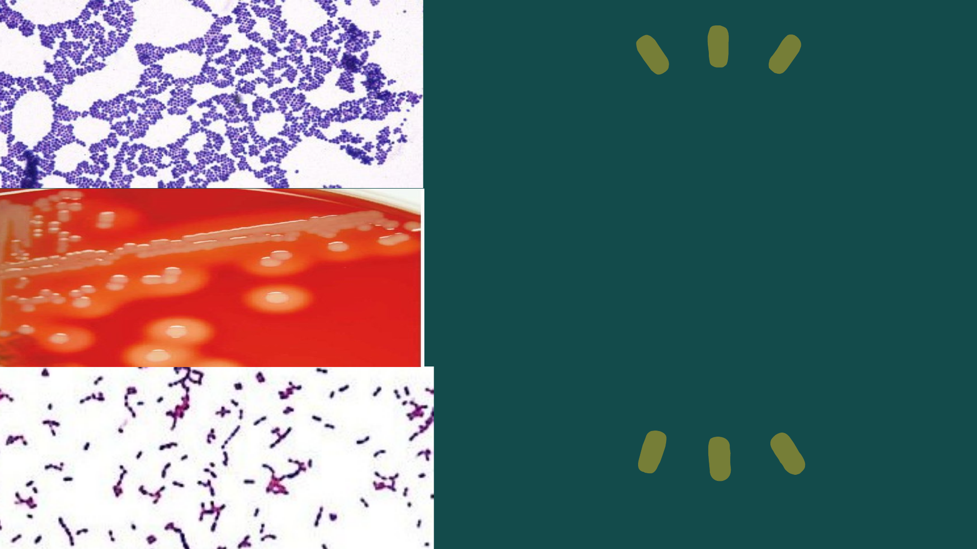 <p>COCOS GRAM POSITIVOS</p><p>IMPORTÂNCIA NA BACTERIOLOGIA CLÍNICA</p><p>IDENTIFICAÇÃO</p><p>SENA, KXFR</p><p>2024</p><p>Determinar os aspectos clínicos e laboratoriais dos principais cocos Gram positivos de Importância</p><p>OBJETIVOS:</p><p>Gênero Staphylococcus S. aureus</p><p>S. epidermidis</p><p>S. saprophyticcus</p><p>Gênero Streptococcus Strep. pyogenes</p><p>Strep. agalactiae</p><p>Streptococcus pneumoniae</p><p>Streptococcus grupo viridans</p><p>Streptococcus grupo CFG</p><p>Gênero Enterococcus</p><p>Gênero Micrococcus</p><p>‹#›</p><p>Gênero Staphylococcus</p><p>O gênero Staphylococcus inicialmente foi classificado na família Micrococcaceae</p><p>2009</p><p>família Staphylococcaceae</p><p>(validação em 2010)</p><p>Coloração de Gram</p><p>Cocos Gram positivos arranjados em forma de cachos (predominância)</p><p>células isoladas</p><p>em pares</p><p>em cadeias curtas ou</p><p>agrupados irregulares,</p><p>Devido sua divisão celular ocorrer em três planos perpendiculares.</p><p>Características gerais</p><p>Crescimento</p><p>Crescimento rápido em condições aeróbicas ou microaerófilas. São anaeróbios facultativos.</p><p>Cor</p><p>Variando do Branco ao Amarelo</p><p>As colônias de S. aureus são acinzentadas a amarelo dourado, podendo apresentar β hemólise.</p><p>As colônias de S.epidermidis apresentam coloração de cinza a branca.</p><p>São relativamente resistentes a ressecamento, calor (suportam temperatura de 5OºC durante 30 min.) e cloreto de sódio a 9%.</p><p>‹#›</p><p>‹#›</p><p>Staphylococcus aureus</p><p>COLONIZAÇÃO</p><p>Fossas nasais</p><p>Pele</p><p>Períneo</p><p>Diferentes tipos de infecções</p><p>infecções cutâneas Bacteriemias</p><p>relativamente benignas (fatais)</p><p>Causam:</p><p>A)INFECÇÕES AGUDAS – invasão direta e destruição tecidual. Podem ser:</p><p>Primárias – desenvolvimento do microrganismo na porta de entrada</p><p>Ex.: celulite, infecções pós cirúrgicas, piodermites, abscessos.</p><p>Secundárias – por disseminação hematogênica ou linfática</p><p>Ex.: enterocolite, meningite, endocardite, septicemia, osteomielite.</p><p>B) TOXEMIAS – manifestações clínicas são decorrentes da ação de toxinas.</p><p>Ex.: Síndrome da pele escaldada</p><p>Síndrome do choque tóxico</p><p>Intoxicação alimentar estafilocócica</p><p>PRODUÇÃO DE ENZIMAS</p><p>Catalase, Coagulase, protease, hialuronidase, lipase, estafiloquinase são enzimas extracelulares que permitem a penetração e invasão nos diferentes tecidos. A produção dessas enzimas está relacionada ao alto grau de patogenicidade do Staphylococcus aureus.</p><p>FATORES DE VIRULÊNCIA</p><p>A produção de catalase pode atuar inativando o peróxido de hidrogênio e radicais livres tóxicos formados pelo sistema da mieloperoxidase no interior das células fagocíticas após a ingestão dos microrganismos.</p><p>Catalase</p><p>Forma radicais livres e substâncias oxidantes com atividade antimicrobiana.</p><p>COAGULASE</p><p>PRODUZIDA</p><p>PRODUTO LIVRE</p><p>LIGADA A PAREDE BACTERIANA</p><p>Precipitação da fibrina na superfície dos Staphylococcus aureus impedindo a sua destruição ou digestão por células fagocitárias..</p><p>Ativam a protrombina em trombina que consequentemente converte o fibrinogênio em fibrina estimulando a coagulação .</p><p>Reage com uma substância presente no plasma (Fator de reação da coagulase-CRF) para formar um complexo que reage com o fibrinogênio, formando fibrina.</p><p>LIPASE</p><p>As lipases hidrolisam lipídios e asseguram a sobrevivência dos Staphylococcus nas áreas sebáceas do corpo.</p><p>A enzima hialuronidase cliva o ácido hialurônico durante a infecção, facilitando a propagação local da infecção para tecidos adjacentes</p><p>HIALURONIDASE</p><p>‹#›</p><p>NUCLEASE</p><p>Conseguem driblar as armadilhas dos neutrófilos, hidrolisam o DNA e modulam a formação de biofilme. Esta enzima tem sido usada como marcador para detecção direta de Staphylococcus aureus</p><p>PROTEASES</p><p>Fatores de virulência (clivam proteínas de superfície estafilocócicas, modulam a resposta imune e promovem a degradação do tecido do hospedeiro).</p><p>- Estafiloquinase</p><p>Ação semelhante a estreptoquinase, resultando em fibrinólise.</p><p>Facilitam a disseminação da infecção para os tecidos adjacentes.</p><p>FATORES DE VIRULENCIA IMPORTANTES</p><p>POLISSACARÍDEOS CAPSULARES</p><p>Mais de 90% de S. aureus produzem exopolissacarídios que atuam para promover a aderência dos microrganismos às células hospedeiras e a dispositivos de prótese e impedir a fagocitose do microrganismo por células polimorfonucleares.</p><p>Os polissacarídios capsulares são importantes componentes dos biofillmes, que consistem em agrupamentos de microrganismos fixados à superfície, envolvidos por matriz polimérica extracelular que consiste em exopolissacarídios, ácidos teicoicos, material proteináceo e DNA extracelular.</p><p>Staphylococcus aureus</p><p>BIOFILME</p><p>ADESINA INTERCELULAR</p><p>POLISSACARÍDICA</p><p>(PIA)</p><p>ADESÃO PRIMÁRIA</p><p>PROLIFERAÇÃO DE CÉLULAS EM AGRUPAMENTO DE MULTICAMADAS</p><p>Adesão</p><p>Proliferação celular</p><p>A adesina intercelular polissacarídica (PIA), também conhecida como poli-Nacetil-glicosamina, é o exopolissacarídeo relacionado ao biofilme no gênero</p><p>Staphylococcus.</p><p>OBSERVAÇÕES:</p><p>O biofilme geralmente prolonga a fase inflamatória de feridas crônicas, sendo neste caso mais resistentes aos antibióticos do que as células planctônicas e geralmente são polimicrobianos, o que explica a pouca atuação de antibióticos, ou seu uso limitado em feridas crônicas.</p><p>Os biofilmes podem ser encontrados em todas as feridas agudas ou crônicas, no entanto a razão das feridas crônicas não cicatrizarem em tempo hábil é a virulência e a patogenicidade do biofilme.</p><p>(ZHAO et al., 2013) (Percival; McCarty; L