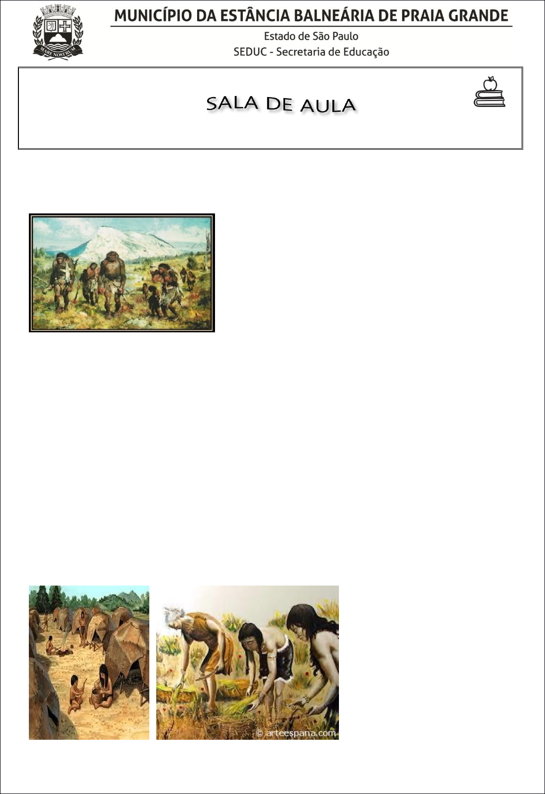 <p>Do nomadismo ao sedentarismo</p><p>Nomadismo - É a forma de vida dos povos</p><p>nômades, isto é, povos que não têm habitação</p><p>fixa. Eles não permanecem em um único local. Os</p><p>nômades são do tipo caçador-coletores, ou seja,</p><p>vivem da caça, pesca e da coleta de alimentos.</p><p>Quando há necessidade, deslocam-se para procurar</p><p>melhores condições de vida. Os homens desse</p><p>período ainda não eram capazes de transformar a</p><p>natureza em que viviam, eram apenas parte integrante dessa natureza.</p><p>O nomadismo foi abandonado por volta de 10 mil anos atrás (Era Neolítica)</p><p>quando o ser humano aprendeu a plantar. Com a agricultura, os povos não</p><p>precisavam mais de ir à busca de outros lugares quando os recursos de uma área</p><p>acabavam, o que levou os homens a estocarem alimentos. Consequentemente, a</p><p>população começou a aumentar, pois agora havia alimentos para todos. Começaram a</p><p>surgir as primeiras vilas e, depois, as cidades. A vida do homem começava a deixar de</p><p>ser simples para tornar-se complexa. Sendo necessária a organização da sociedade que</p><p>surgia.</p><p>Para contabilizar a produção de alimentos, o homem habilmente desenvolveu a</p><p>escrita. No início a escrita tinha função contábil, ou seja, servia para contar e controlar a</p><p>produção dos alimentos. Além disso, no Neolítico houve um amplo desenvolvimento</p><p>cultural aumento da riqueza e finalmente da qualidade de vida.</p><p>O Início da Organização Social (grupos sedentários)</p><p>O ser humano não se</p><p>sedentarizou imediatamente.</p><p>Antes disso um fator de suma</p><p>importância foi a divisão de</p><p>trabalho entre os membros do</p><p>grupo. Na maioria desses</p><p>grupos a divisão foi feita de</p><p>acordo com o sexo: os</p><p>homens caçavam e as</p><p>mulheres faziam a coleta de</p><p>alimentos e cuidavam das crianças. Posteriormente, o produto do trabalho era dividido</p><p>entre os membros do grupo.</p><p>SEMANAS 5 e 6</p><p>Disciplina: História 5º ano do Ensino Fundamental</p><p>Responda as questões em seu caderno:</p><p>1. O que é nomadismo?</p><p>________________________________________________________________________</p><p>________________________________________________________________________</p><p>2. Quando o nomadismo terminou?</p><p>________________________________________________________________________</p><p>________________________________________________________________________</p><p>3. O que a agricultura proporcionou aos homens?</p><p>________________________________________________________________________</p><p>________________________________________________________________________</p><p>4. Qual foi a consequência do surgimento da agricultura?</p><p>________________________________________________________________________</p><p>________________________________________________________________________</p><p>5. Qual foi a criação realizada nesse período para contabilizar e controlar a produção de</p><p>alimentos?</p><p>________________________________________________________________________</p><p>________________________________________________________________________</p><p>6. Como era feita a divisão de trabalho nos grupos sedentários?</p><p>________________________________________________________________________</p><p>________________________________________________________________________</p><p>Para saber mais:</p><p> O Domínio da Agricultura e Pecuária - A História da Civilização Pré-História</p><p>https://www.youtube.com/watch?v=trxtcdsbbFo</p><p> Do nomadismo à sedentarização</p><p>https://www.youtube.com/watch?v=WrdS-JXToQI&t=28s</p><p>Referências</p><p>https://www.historiadomundo.com.br/pre-historia/nomadismo.htm</p><p>https://reflexoesdehistoria.wordpress.com/2011/01/19/emergencia-do-homem-e-da-civilizacao-parte-2/</p><p>https://www.youtube.com/watch?v=trxtcdsbbFo</p><p>https://www.youtube.com/watch?v=WrdS-JXToQI&t=28s</p><p>https://www.historiadomundo.com.br/pre-historia/nomadismo.htm</p><p>https://reflexoesdehistoria.wordpress.com/2011/01/19/emergencia-do-homem-e-da-civilizacao-parte-2/</p>