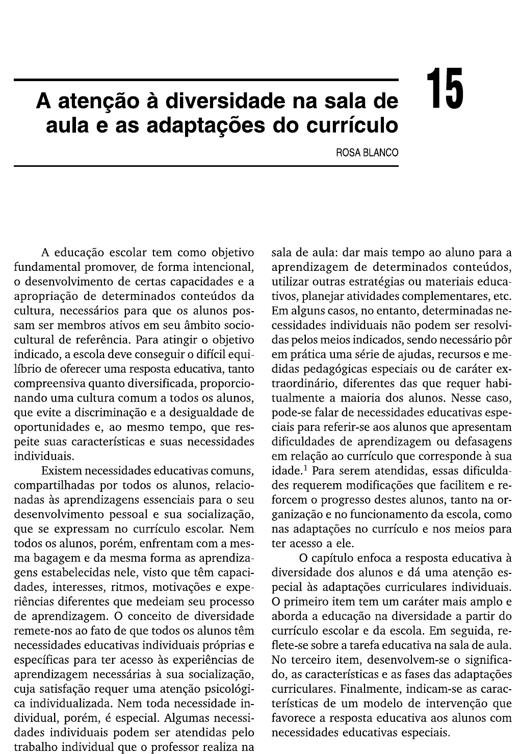 <p>A atenção à diversidade na sala de 15 aula e as adaptações do currículo ROSA BLANCO A educação escolar tem como objetivo sala de aula: dar mais tempo ao aluno para a fundamental promover, de forma intencional, aprendizagem de determinados conteúdos, o desenvolvimento de certas capacidades e a utilizar outras estratégias ou materiais educa- apropriação de determinados conteúdos da tivos, planejar atividades complementares, etc. cultura, necessários para que os alunos pos- Em alguns casos, no entanto, determinadas ne- sam ser membros ativos em seu âmbito socio- cessidades individuais não podem ser resolvi- cultural de referência. Para atingir o objetivo das pelos meios indicados, sendo necessário pôr indicado, a escola deve conseguir o difícil equi- em prática uma série de ajudas, recursos e me- líbrio de oferecer uma resposta educativa, tanto didas pedagógicas especiais ou de caráter ex- compreensiva quanto diversificada, proporcio- traordinário, diferentes das que requer habi- nando uma cultura comum a todos os alunos, tualmente a maioria dos alunos. Nesse caso, que evite a discriminação e a desigualdade de pode-se falar de necessidades educativas espe- oportunidades e, ao mesmo tempo, que res- ciais para referir-se aos alunos que apresentam peite suas características e suas necessidades dificuldades de aprendizagem ou defasagens individuais. em relação ao currículo que corresponde à sua Existem necessidades educativas comuns, Para serem atendidas, essas dificulda- compartilhadas por todos os alunos, relacio- des requerem modificações que facilitem e re- nadas às aprendizagens essenciais para o seu forcem o progresso destes alunos, tanto na or- desenvolvimento pessoal e sua socialização, ganização e no funcionamento da escola, como que se expressam no currículo escolar. Nem nas adaptações no currículo e nos meios para todos os alunos, porém, enfrentam com a mes- ter acesso a ele. ma bagagem e da mesma forma as aprendiza- capítulo enfoca a resposta educativa à gens estabelecidas nele, visto que têm capaci- diversidade dos alunos e dá uma atenção es- dades, interesses, ritmos, motivações e expe- pecial às adaptações curriculares individuais. riências diferentes que medeiam seu processo O primeiro item tem um caráter mais amplo e de aprendizagem. conceito de diversidade aborda a educação na diversidade a partir do remete-nos ao fato de que todos os alunos têm currículo escolar e da escola. Em seguida, re- necessidades educativas individuais próprias e flete-se sobre a tarefa educativa na sala de aula. específicas para ter acesso às experiências de No terceiro item, desenvolvem-se o significa- aprendizagem necessárias à sua socialização, do, as características e as fases das adaptações cuja satisfação requer uma atenção psicológi- curriculares. Finalmente, indicam-se as carac- ca individualizada. Nem toda necessidade in- terísticas de um modelo de intervenção que dividual, porém, é especial. Algumas necessi- favorece a resposta educativa aos alunos com dades individuais podem ser atendidas pelo necessidades educativas especiais. trabalho individual que o professor realiza na</p><p>DESENVOLVIMENTO PSICOLÓGICO E EDUCAÇÃO, V. 291 A EDUCAÇÃO NA DIVERSIDADE que permite tomar decisões refletidas e ajus- tadas às diferentes realidades sociais, culturais A resposta à diversidade e individuais, mas não é uma condição suficien- no currículo escolar te. Além disso, a resposta à diversidade impli- ca um currículo amplo e equilibrado quanto Tradicionalmente, a escola centrou-se na ao tipo de capacidades e conteúdos que con- satisfação das necessidades educativas comuns, templa. Os currículos tradicionais centraram- que se expressavam em objetivos traçados em se no desenvolvimento de capacidades de tipo função do enganoso e inexistente "aluno mé- cognoscitivo e no de conteúdos de tipo concei- dio", sem preocupar-se com as necessidades in- tual, em detrimento de outro tipo de capaci- dividuais. Dessa perspectiva, os alunos que não dades e de conteúdos, que também são essen- conseguem alcançar os objetivos estabelecidos ciais para o desenvolvimento integral e a in- são segregados das mais variadas formas: serção na sociedade. Esse enfoque deu lugar criando grupos dentro da turma para os mais ao desenvolvimento de currículos paralelos para lentos ou atrasados; classes especiais para aten- os alunos de educação especial que incluíam ob- der os alunos com dificuldades de aprendiza- jetivos, áreas e conteúdos diferentes do currícu- gem ou de conduta; ou enviando os alunos para lo comum, com um enfoque mais reabilitador. escolas especiais. A esse tipo de medidas subjaz O conceito de necessidades educativas a ideia de que os problemas de aprendizagem especiais implica que os grandes objetivos da têm sua origem em variáveis ou fatores indivi- educação devem ser os mesmos para todos os duais, motivo pelo qual se tomam medidas alunos, de modo a assegurar a igualdade de centradas nos alunos, em vez de rever e modi- oportunidades e a futura inserção na socieda- ficar os aspectos da prática educativa que po- de. Portanto, se no currículo se expressam as dem gerar ou acentuar suas dificuldades. Essa aprendizagens consideradas essenciais para concepção, no âmbito curricular, deu lugar a serem membros da sociedade, este deve ser o propostas rígidas e homogeneizadoras, nas referencial da educação de todos os alunos, quais o planejamento educacional estabelece fazendo as adaptações que sejam necessárias e nos mínimos detalhes as decisões sobre o quê, proporcionado-lhes as ajudas e os recursos que como e quando ensinar e avaliar, sem levar em favoreçam a obtenção das aprendizagens nele conta que os processos de ensino e de aprendi- estabelecidas. zagem ocorrem em contextos bastante diver- sos, o que gera muitas dificuldades de aprendi- zagem, repetências, absenteísmo e fracass