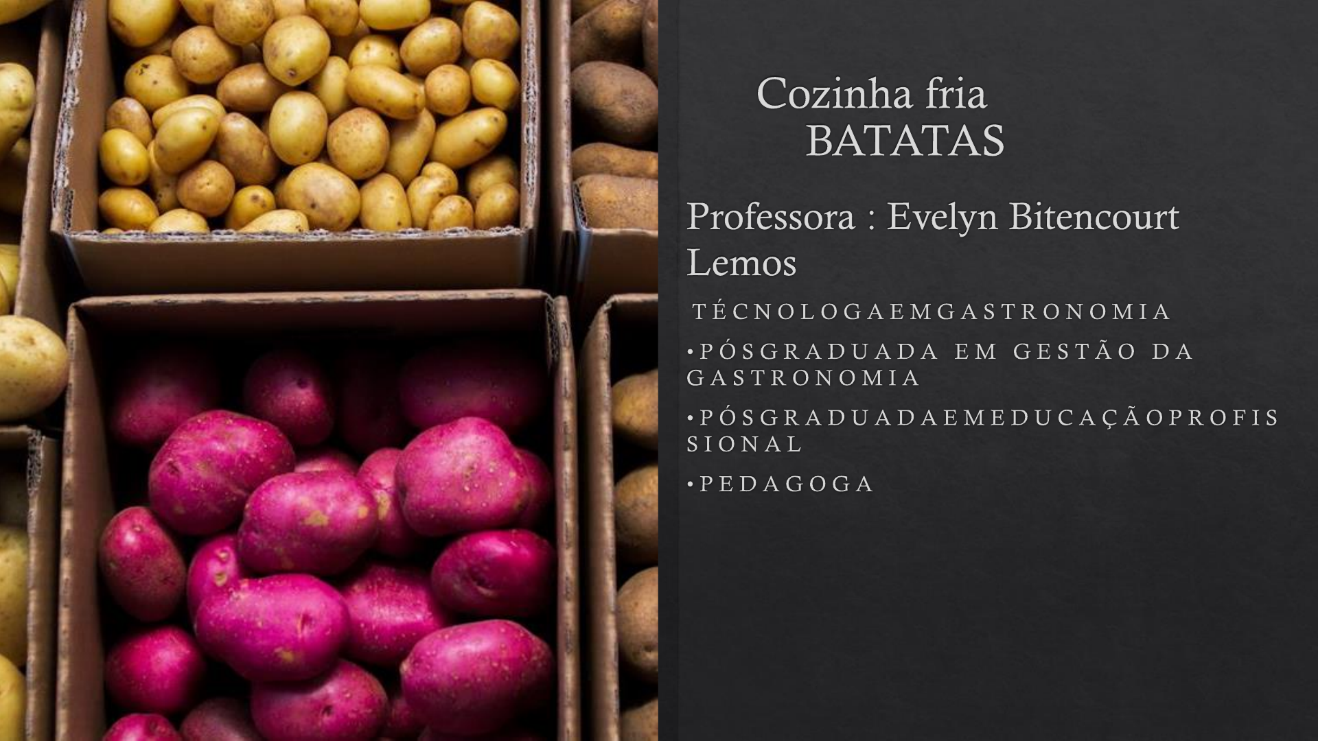 <p>Cozinha fria</p><p>BATATAS</p><p>Professora : Evelyn Bitencourt</p><p>Lemos</p><p>T É C N O L O G A E M G A S T R O N O M I A</p><p>• P Ó S G R A D U A D A E M G E S T Ã O D A</p><p>G A S T R O N O M I A</p><p>• P Ó S G R A D U A D A E M E D U C A Ç Ã O P R O F I S</p><p>S I O N A L</p><p>• P E D A G O G A</p><p>História</p><p>A batata é originária do Peru, onde foi cultivada desde as eras imemoriais pelo povo Inca.</p><p>Em razão do seu alto rendimento e sua grande capacidade de adaptação, o cultivo foi</p><p>largamente espalhado pelo mundo.</p><p>A batata pode ser plantada em uma grande variedade de climas. Os maiores produtores de</p><p>batata no mundo são: Polônia, China, Estados Unidos, Alemanha e Índia.</p><p>História</p><p>Consumo na Europa→</p><p>Antoine Augustin Parmentier- agrônomo e</p><p>higienista francês- que ficou preso durante a</p><p>Guerra dos sete anos se alimentando apenas</p><p>por batatas e, voltando à França fraco, mas</p><p>ainda vivo, pesquisou sobre a qualidade</p><p>nutritiva da batata.</p><p>História</p><p>O ponto mais alto da acção</p><p>promocional de Parmentier foi o jantar</p><p>que ofereceu ao rei e à rainha em 1785.</p><p>Nesta dita refeição todos os pratos eram</p><p>à base de batata.</p><p>A partir de então, a utilização da batata</p><p>como alimento expandiu-se de forma</p><p>progressiva pela França e pelos</p><p>restantes países da Europa e mais tarde</p><p>pelo mundo. A batata tornou-se</p><p>rapidamente um fator essencial na</p><p>alimentação diária.</p><p>Valor nutricional</p><p>É rica em carboidratos;</p><p>Sais minerais;</p><p>Vitamina C</p><p>Vitaminas do complexo B.</p><p>Preparação</p><p>A primeira receita que se conhece é</p><p>alemã e data de 1581, trata-se de uma</p><p>receita muito similar à do Rösti (prato</p><p>típico Suíço). Conhecem-se outras</p><p>maneiras de preparação mais</p><p>saborosas provenientes de Liège no</p><p>decurso do século XVII.</p><p>Tipos de batatas</p><p>Tipos</p><p>ATLANTIC</p><p>Formato redondo, grande, uniforme. A pele branca</p><p>recoberta por escamas (russet) , que dependendo</p><p>do tipo de solo plantado pode</p><p>variar um pouco a cor externa dos tubérculos. A</p><p>polpa é branca.</p><p>Uso: Indicada para processamento no corte palito,</p><p>porém curto por ter a forma arredondada</p><p>È indicada para produção de chips por apresentar</p><p>alto teor de amido e pelo formato da batata</p><p>Tipos</p><p>BARAKA</p><p>Origem holandesa.</p><p>Forma: Oval</p><p>São ótimas para fritar por</p><p>conterem menos água (a</p><p>"culpada" por deixar as fritas</p><p>murchas). Também ficam</p><p>boas cozidas.</p><p>Tipos</p><p>BINJE</p><p>Forma: Alongada</p><p>Cor: Amarela Clara</p><p>Uso: Execelente para frituras, por possuir alto</p><p>teor de amido.</p><p>Boa para cozinhar, sendo também indicada para</p><p>saladas.</p><p>Após fritura apresenta ótima coloração, firmeza</p><p>crocancia e pouca absorção de óleo.</p><p>Tipos</p><p>ELVIRA ou BATATA</p><p>BAROA</p><p>Forma: Alongada;</p><p>Coloração :polpa e casca são</p><p>amarelas.;</p><p>Ótima para cozinhar e assar;</p><p>Apresenta baixo teor de</p><p>amido</p><p>Tipos</p><p>ÁGATA:</p><p>Essa batata é muito fácil de</p><p>ser encontrada, pois é a mais</p><p>consumida.</p><p>Formato :oval;</p><p>Coloração: casca amarela e</p><p>polpa clara.</p><p>Ótima para saladas e sopas;</p><p>Sabor fraco</p><p>Ótima para cozinhar e assar.</p><p>Tipos</p><p>ASTERIX:</p><p>Formato oval</p><p>Coloração: casca</p><p>avermelhada e polpa</p><p>amarela;</p><p>Essa batata é grande fonte de</p><p>energia;</p><p>Contém sais minerais e</p><p>vitamina C;</p><p>Ótima para frituras;</p><p>Resistente ao congelamento</p><p>Tipos</p><p>MONALISA:</p><p>Formato oval e alongado;</p><p>Perde a cor após o</p><p>cozimento.</p><p>Melhor aproveitada em purês</p><p>e saladas;</p><p>Consistência firme após o</p><p>cozimento.</p><p>Achados científicos</p><p>Batatas fritas:</p><p>Conforme estudos feitos pela</p><p>Universidade Técnica de</p><p>Munique-Alemannha , tanto</p><p>as industrializadas quanto as</p><p>caseiras podem conter uma</p><p>substancia cancerígena</p><p>chamada glicidamina.</p><p>Achados científicos</p><p>Achava-se que a glicinamida era uma substancia</p><p>produzida pelo fígado metabolizar a acrilamida, outro</p><p>substancia cancerígena encontrada nas batatas fritas e em</p><p>todos os alimentos fritos em alta temperatura.</p><p>O estudo alemão confirmou o que especialistas</p><p>suspeitavam: a glicinamida também é gerada pelo</p><p>processo de fritura em altas temperaturas e não pelo</p><p>processo de metabolização das gorduras em altas</p><p>temperaturas.</p><p>Conservação</p><p>Guardar sempre em lugares escuros,</p><p>frescos e arejados;</p><p>Nunca na geladeira, pois o frio as torna</p><p>adocicadas;</p><p>Lavar bem as batatas antes de descasca-</p><p>las;</p><p>Ao descasca-las algum tempo antes do</p><p>uso deixa-las de molho em água, pois</p><p>escurecem se deixadas ao ar.</p><p>Usos culinários</p><p>1 Kg de batata rende cerca de:</p><p>400 gramas de batata frita;</p><p>1,5 Kg de purê;</p><p>1,1 Kg de batata cozida;</p><p>750 gramas de batata assada;</p><p>Geralmente calcula-se em média 2 unidades por</p><p>pessoa.</p><p>Slide 1: Cozinha fria BATATAS</p><p>Slide 2: História</p><p>Slide 3: História</p><p>Slide 4: História</p><p>Slide 5: Valor nutricional</p><p>Slide 6: Preparação</p><p>Slide 7: Tipos de batatas</p><p>Slide 8: Tipos</p><p>Slide 9: Tipos</p><p>Slide 10: Tipos</p><p>Slide 11: Tipos</p><p>Slide 12: Tipos</p><p>Slide 13: Tipos</p><p>Slide 14: Tipos</p><p>Slide 15: Achados científicos</p><p>Slide 16: Achados científicos</p><p>Slide 17: Conservação</p><p>Slide 18: Usos culinários</p>