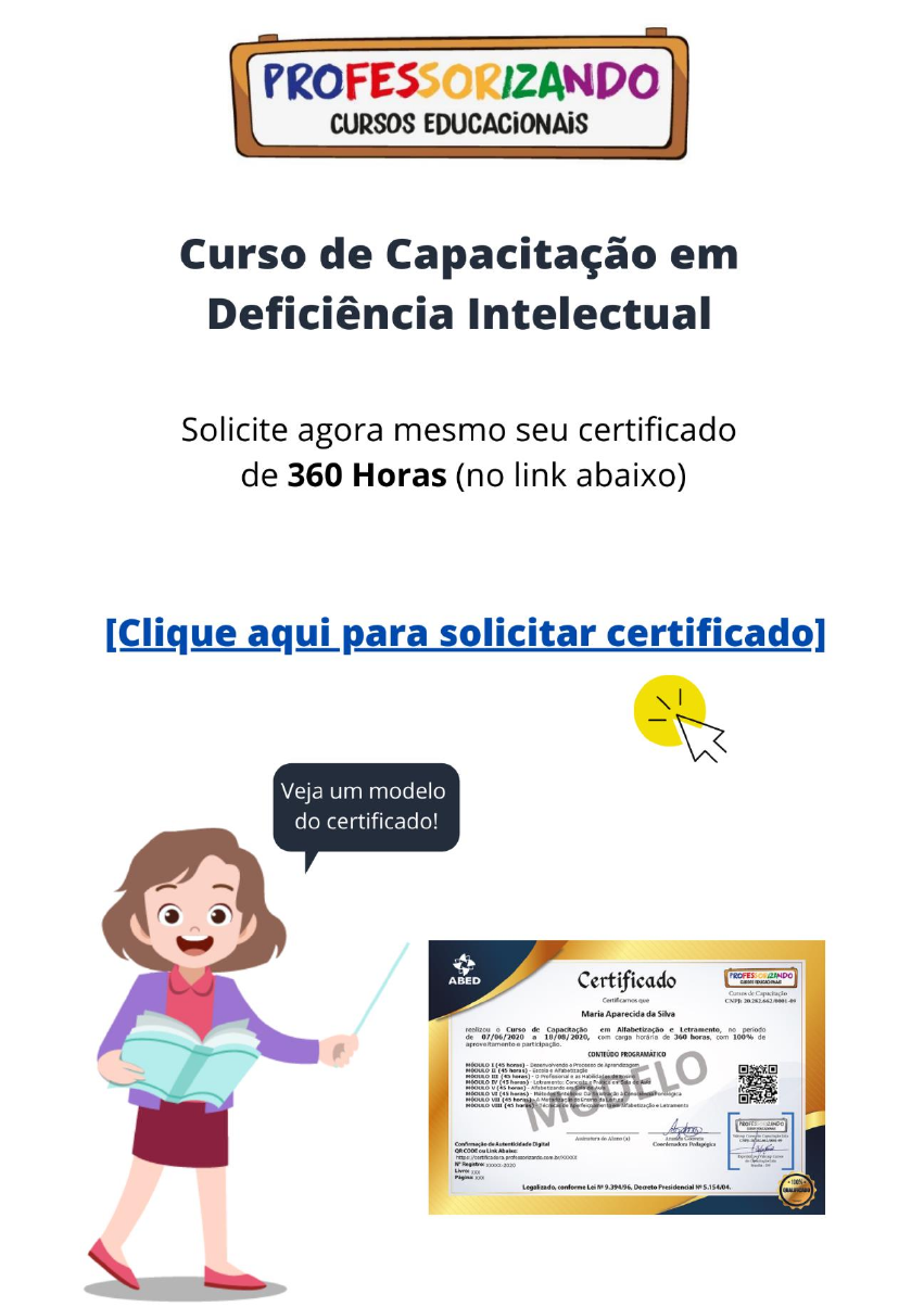 https://pay.hotmart.com/T39359752O?off=o7re857j&checkoutMode=10 Sumário 1 Entendendo a Deficiência Intelectual .............................................................. 5 1.2 Histórico da Deficiência Intelectual ........................................................... 7 1.3 Deficiência Intelectual No Brasil .............................................................. 12 2 Deficiência Intelectual: Suas Causas e Sintomas ......................................... 17 2.1 Graus da Deficiência Intelectual.............................................................. 21 2.3 Recursos Terapêuticos Para a Deficiência Intelectual ............................ 24 2.3 Prevenção ............................................................................................... 26 3 Síndromes Que Cursam Com A Deficiência Intelectual ................................ 28 3.1 Autismo ................................................................................................... 28 3.2 SÍNDROME ALCOÓLICA-FETAL (SAF) OU TRANSTORNOS DO ESPECTRO ALCOÓLICO FETAL ................................................................ 28 3.3 ERROS INATOS DO METABOLISMO (EIM) .......................................... 29 3.4 SÍNDROME DO X FRÁGIL (SXF) 15,16,20 ............................................ 30 3.5 Síndrome de Down ................................................................................. 31 3.6 Síndrome de Anlgeman .......................................................................... 32 3.7 Síndrome de Cri du chat ......................................................................... 32 3.8 Síndrome de Prader-Willi ........................................................................ 32 3.9 Síndrome Williams .................................................................................. 32 4 A Deficiência Intelectual Nas Escolas ........................................................... 33 4.1 A Comunicação Alternativa na Deficiência Intelectual ............................ 34 4.2 O Papel do Professor com o Aluno Deficiente Intelectual ....................... 35 5 Atividades para alunos com deficiência intelectual ....................................... 38 Referências Bibliográficas ................................................................................ 45 Anexo I - A escolarização de alunos com deficiência intelectual: uma análise da aplicação do Plano de Desenvolvimento Educacional Individualizado (1) ....... 47 Resumo ......................................................................................................... 47 Introdução ..................................................................................................... 49 Deficiência intelectual: dimensões sobre a sua escolarização ...................... 52 Considerações Finais .................................................................................... 57 Referências ................................................................................................... 59 1 Entendendo a Deficiência Intelectual A inteligência do ser humano é a capacidade que temos de agir intencionalmente afim de resolver problemas simples ou complexos, e que essas ações gerem aprendizado contínuo. O funcionamento intelectual é resultado de um intrincado mecanismo de conexões neuronais, que se sobrepõe hierarquicamente, funcionando de modo síncrono. O desequilíbrio desse delicado sistema ocasionará um mau funcionamento com consequente perdas de funções intelectuais. Pessoas com deficiência intelectual (DI) são vítimas de preconceito da sociedade. Dentre as pessoas com necessidades especiais, são as que têm menos oportunidades de emprego, e muitas vezes são apenas considerados preguiçosos ou malandros. Estudos indicam que de 2%-4% da população tenha funcionamento intelectual abaixo da média. O Transtorno do Desenvolvimento Intelectual ou Deficiência Intelectual já foi conhecida por outras denominações, como por exemplo, idiotia e retardo mental. Essas habilidades estão ligadas à inteligência, atividades que envolvem raciocínio, resolução de problemas e planejamento, entre outras. A inteligência é avaliada por meio do Quociente de Inteligência (QI) obtido por testes padronizados. O resultado de uma pessoa com Transtorno de Desenvolvimento Intelectual nessa avaliação situa-se em 75 ou menos. A principal característica da deficiência intelectual são as limitações no funcionamento mental, que causam aprendizagem e desenvolvimento mais lentos. https://www.focoeducacaoprofissional.com.br/blog/curso-online-deficiencias-multiplas https://www.focoeducacaoprofissional.com.br/blog/curso-online-deficiencias-multiplas https://www.focoeducacaoprofissional.com.br/blog/curso-online-deficiencias-multiplas Deficiência intelectual é uma menor capacidade de compreender, aprender e aplicar informações e tarefas novas ou complexas. Pessoas com deficiência intelectual têm um funcionamento mental abaixo da média esperada para a idade, o que provoca um atraso na aprendizagem e no desenvolvimento desses indivíduos. Em geral, a criança tem mais dificuldade para interpretar conteúdos abstratos, o que exige estratégias diferenciadas por parte do professor Pessoas com deficiência intelectual ou cognitiva costumam apresentar dificuldades para resolver problemas, compreender ideias abstratas (como as metáforas, a noção de tempo e os valores monetários), estabelecer relações sociais, compreender e obedecer a regras, e realizar atividades cotidianas - como, por exemplo, as ações de autocuidado. A capacidade de argumentação desses alunos também pode ser afetada e precisa ser devidamente estimulada para facilitar o processo de inclusão e fazer com que a pessoa adquira independência em suas relações com o mundo. O retardo mental, denominado mais recentemente como deficiência intelectual (DI), é um transtorno neurológico comum na in