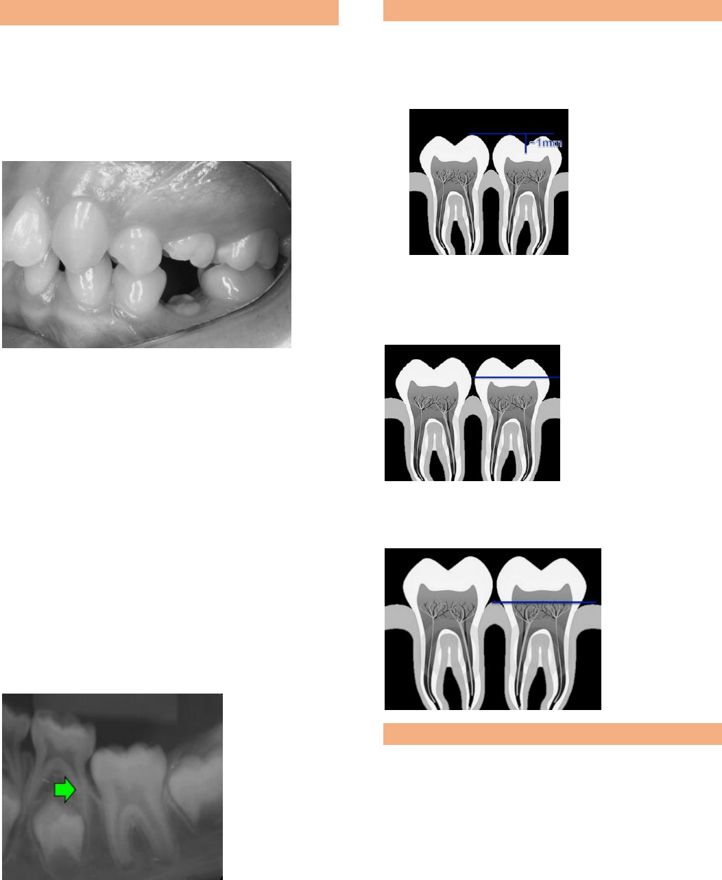 <p>ANQUILOSE DENTÁRIA:</p><p>É um processo de reabsorção por substituição do</p><p>ligamento periodontal pelo osso alveolar que se</p><p>fusiona à dentina e ao cemento.</p><p>Em uma condição clínica para estabelecer se é</p><p>uma anquilose, deve-se avaliar a infraoclusão</p><p>em uma radiografia não há lâmina dura, e o</p><p>dente pode ter anquilose em áreas diferente, não</p><p>em todo o ligamento.</p><p>Etiologia:</p><p> Idiopatia</p><p> Trauma</p><p> Fatores genéticos</p><p> Distúrbios locais no mecanismo de</p><p>erupção</p><p>Radiografia periapical é o meio utilizado para</p><p>determinar se há anquilose é avaliar nível da crista</p><p>óssea alveolar.</p><p>Lâmina dura desaparece, com defeito ósseo vertical</p><p>Com o dente anquilosado o rebordo fica baixo,</p><p>sendo um problema para colocação de um</p><p>implante.</p><p>CLASSIFICAÇÃO DA ANQUILOSE DENTÁRIA:</p><p> Grau leve: superfície oclusal</p><p>aproximadamente 1mm abaixo da</p><p>superfície oclusal do dente adjacente</p><p> Grau moderado: Seperficie oclusal ao</p><p>nível do ponto de contato dos dentes</p><p>adjacentes</p><p> Grau severo: Seperficie oclusal abaixo do</p><p>tecido gengival interproximal</p><p>IMPLICAÇÕES CLÍNICAS:</p><p>1. Diminuição do perímetro do arco</p><p>2. Extrusão dos dentes antagonistas</p><p>3. Inclinação axial incorreta dos dentes</p><p>adjacentes</p><p>4. Redução no crescimento vertical do processo</p><p>alveolar</p><p>5. Hábitos de interposição de língua</p><p>6. Desvio da linha média</p><p>TRATAMENTO:</p><p>PROSERVAÇÃO: não seria feito nenhum tratamento</p><p>somente acompanhamento, observando a progressão</p><p>do defeito ósseo vertical. Esta é uma opção quando a</p><p>infraoclusão é suave</p><p>REPRODUZIR CONTATO COM ANTAGONISTA: por</p><p>meio de restaurações com resina composta ou até</p><p>mesmo confecções de coroas unitárias.</p><p>SUBLUXAÇÃO/ORTODONTIA: o tratamento</p><p>ortodôntico seguido da luxação pode ser uma</p><p>abordagem que possui fatores de risco como: a</p><p>fratura, a recidiva de anquilose e a necessidade de</p><p>tratamento endodôntico. É utilizado para forçar a</p><p>irrupção do dente em infraoclusão. Indicado para grau</p><p>moderado/grave</p><p>OSTEOTOMIA SEGMENTAR: é um procedimento</p><p>cirúrgico em que o osso alveolar incluindo dente</p><p>afetado é seccionado e reposicionado. Este é indicado</p><p>em casos de infraoclusao leve.</p><p>REMOÇÃO CIRURGICA: Indicado em infraoclusão</p><p>severa e inclinação dos dentes adjacentes, e é</p><p>frequentemente indicada quando a extrusão do molar</p><p>anquilosado não surtiu efeito.se a infraoclusão for</p><p>inferior a 5 mm.</p><p>TUMORES ODONTOMA:</p><p>Os Odontomas são tumores odontogênicos mistos</p><p>pois são compostos de tecido dentário mineralizado</p><p>tanto de origem epitelialquanto mesenquimal.</p><p>Em alguns casos eles impedem a erupção do</p><p>dente permanente. Caso o odontoma for retirado</p><p>com raiz em estágio avançado de formação é</p><p>necessário o tracionamento.</p><p>Proedimento clínico – Excisão cirúrgica</p><p>Existem vários procedimentos de tracionamento</p><p>dentário, uma delas é com aplaca de Hawley.</p><p>Esse movimento deve ser feito com uma força</p><p>leve evitando reabsorção da raiz.</p><p>FREIO LABIAL</p><p>Diagnóstico é feito basicamente através de três sinais</p><p>clínicos: inserção baixana margem gengival ou na</p><p>papila palatina, isquemia da papila palatina quando o</p><p>freio é tracionado e diastema interincisal mediano</p><p>O protocolo é que aguarde que o canino chegue</p><p>ao arco dentário, pois ele fechará o diastema,</p><p>caso o diastema não feche após a chegada dos</p><p>caninos deve ser feita a cirurgia.</p>
