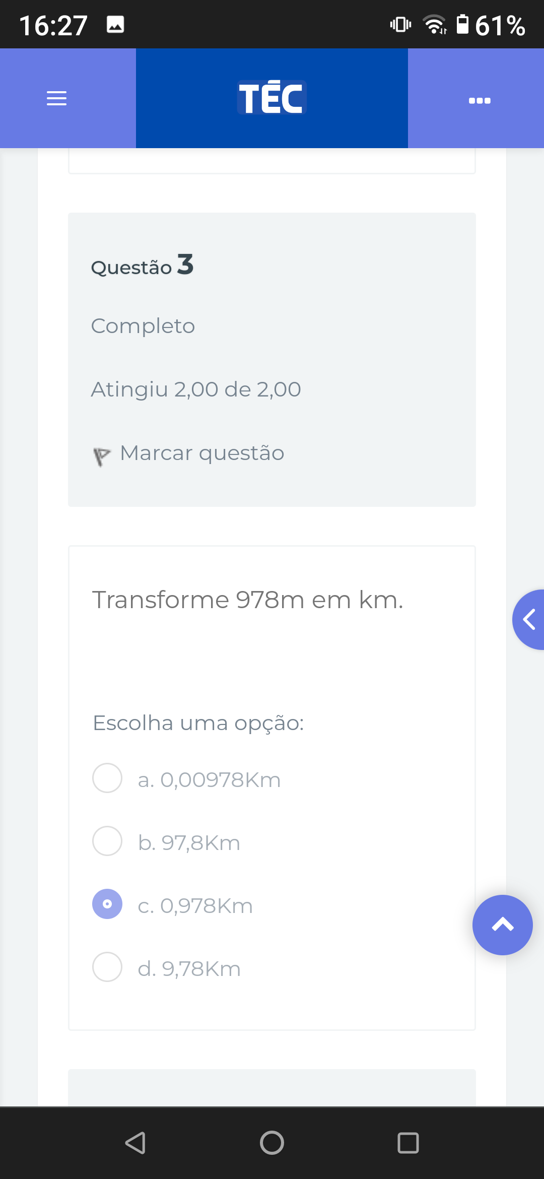<p>16:27 - 61% Questão 3 Completo Atingiu 2,00 de 2,00 Marcar questão Transforme 978m em km. Escolha uma opção: a. 0,00978Km b. 97,8Km C. 0,978Km ^ d. 9,78Km</p>