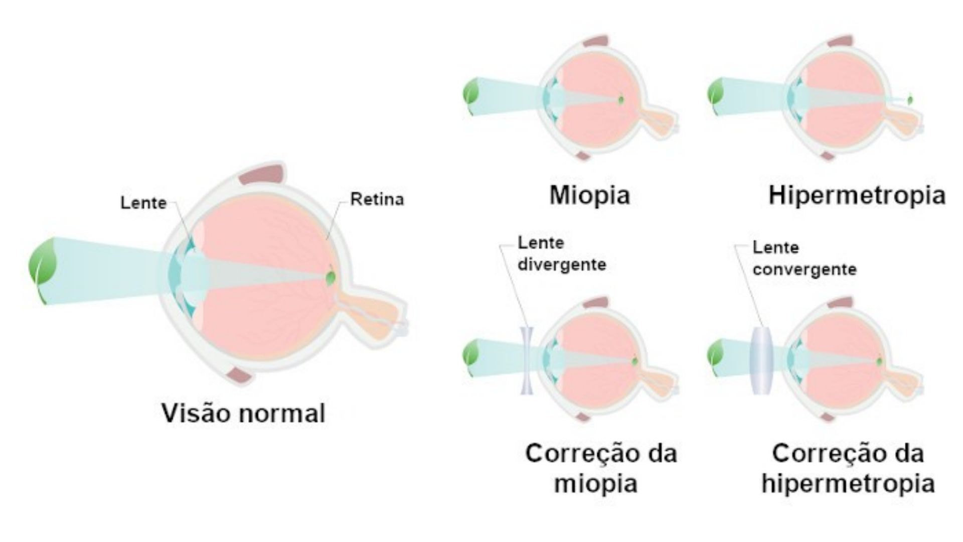 <p>Questão 1</p><p>(UFG-GO) Ao realizar exames oftalmológicos em um ambiente pouco iluminado, os jovens J1 e J2 descobriram que o diâmetro do corpo vítreo de seus olhos é de 18 mm. Nesse exame, descobriu-se que, para J1, as imagens dos objetos são formadas 13 mm após o cristalino, enquanto que, para J2, o diagnóstico atestou que ele não visualiza nitidamente objetos a 25 cm do olho. Conforme o exposto, quais são, respectivamente, os tipos de lentes corretivas que J1 e J2 devem utilizar e quais células responderam mais eficientemente ao estímulo luminoso?</p><p>a) Divergente e convergente, e bastonetes na córnea.</p><p>b) Divergente e divergente, e bastonetes na retina.</p><p>c) Convergente e divergente, e cones na córnea.</p><p>d) Divergente e divergente, e cones na retina.</p><p>e) Divergente e convergente, e bastonetes na retina.</p><p>Questão 2</p><p>(UCB-DF) Certo paciente recebe uma receita do oftalmologista para correção visual determinando uma lente de –4,00 dioptrias para ambos os olhos. Essa situação hipotética indica que as lentes apresentadas são:</p><p>a) divergentes, com distância focal de –0,25 m e, provavelmente, o paciente é míope.</p><p>b) convergentes, com distância focal de 0,40 m e, provavelmente, o paciente é hipermetrope.</p><p>c) divergentes, com distância focal de 1,25 m e, provavelmente, o paciente possui astigmatismo.</p><p>d) convergentes, com distância focal de 0,75 m e, provavelmente, o paciente é hipermetrope.</p><p>e) divergentes, com distância focal de –0,40 m e, provavelmente, o paciente é míope.</p><p>Questão 3</p><p>Um paciente, ao receber a receita de seus óculos, viu as seguintes informações:</p><p>OD : 2,5 di</p><p>OE: - 2,0 di</p><p>O problema de visão que provavelmente esse paciente possui em cada olho é:</p><p>a) Miopia no olho direito (OD) e astigmatismo no olho esquerdo (OE).</p><p>b) Estrabismo no olho direito (OD) e astigmatismo no olho esquerdo (OE).</p><p>c) Glaucoma nos dois olhos.</p><p>d) Hipermetropia no olho direito (OD) e miopia no olho esquerdo (OE).</p><p>e) Hipermetropia no olho direito (OD) e astigmatismo no olho esquerdo (OE).</p><p>Questão 4</p><p>Marque a alternativa correta a respeito dos problemas de visão.</p><p>a) A miopia caracteriza-se pela dificuldade em enxergar de perto, e é corrigida por meio do uso de lentes convergentes.</p><p>b) A hipermetropia caracteriza-se pela dificuldade em enxergar de perto, e é corrigida pelo uso de lentes divergentes.</p><p>c) O glaucoma é caracterizado pela opacidade do cristalino.</p><p>d) O astigmatismo pode ser corrigido com o uso de lentes prismáticas.</p><p>e) A miopia caracteriza-se pela dificuldade em enxergar de longe, e é corrigida por meio do uso de lentes divergentes.</p><p>image1.jpeg</p>