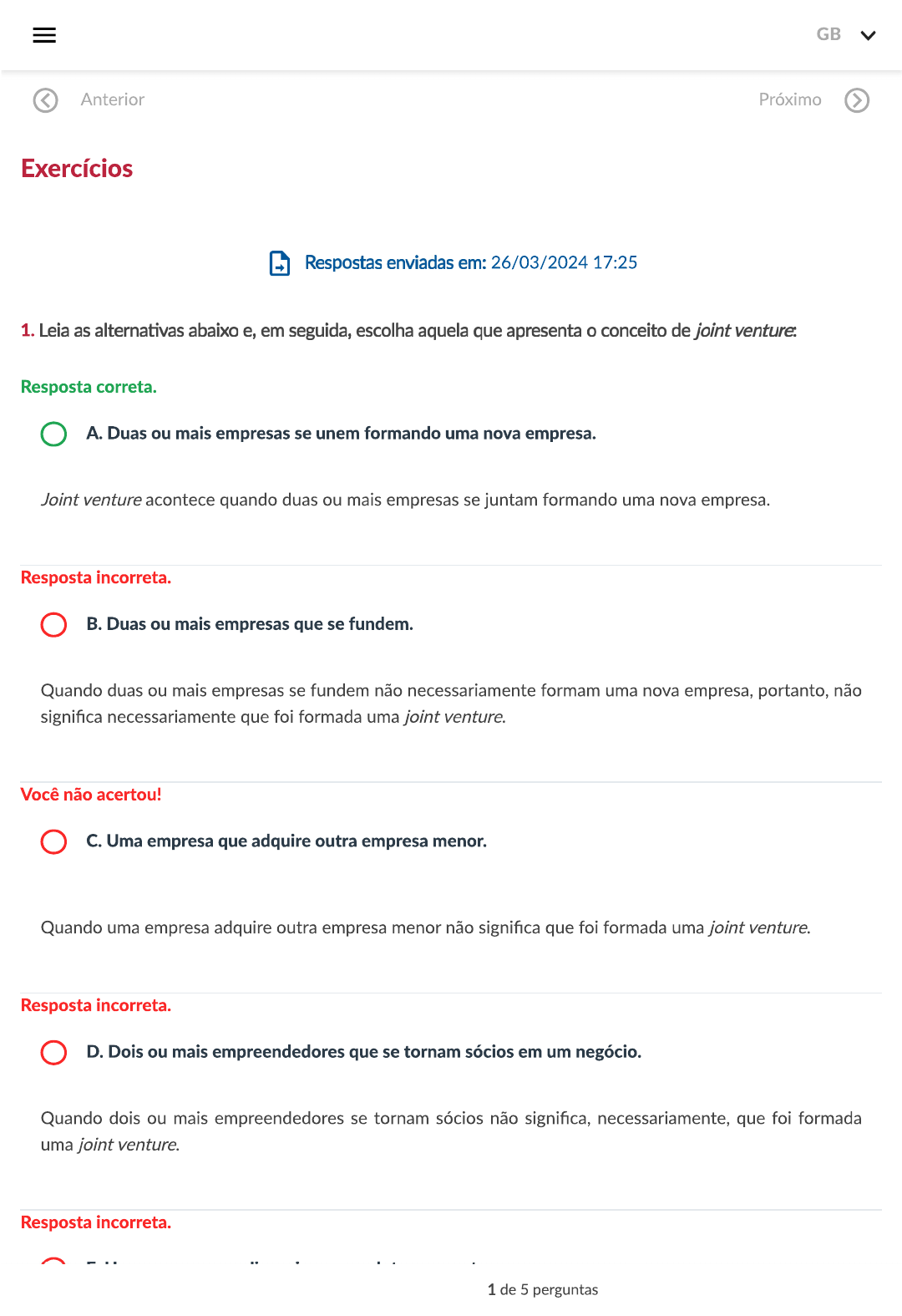 <p>GB Anterior Próximo Exercícios Respostas enviadas em: 26/03/2024 17:25 1. Leia as alternativas abaixo e, em seguida, escolha aquela que apresenta o conceito de joint Resposta correta. A. Duas ou mais empresas se unem formando uma nova empresa. Joint venture acontece quando duas ou mais empresas se juntam formando uma nova empresa. Resposta incorreta. B. Duas ou mais empresas que se fundem. Quando duas ou mais empresas se fundem não necessariamente formam uma nova empresa, portanto, não significa necessariamente que foi formada uma joint venture. Você não acertou! C. Uma empresa que adquire outra empresa menor. Quando uma empresa adquire outra empresa menor não significa que foi formada uma joint venture. Resposta incorreta. D. Dois ou mais empreendedores que se tornam sócios em um negócio. Quando dois ou mais empreendedores se tornam sócios não significa, necessariamente. que foi formada uma joint venture. Resposta incorreta. 1 de 5 perguntas</p><p>GB Próximo > 1 de 5 perguntas</p>