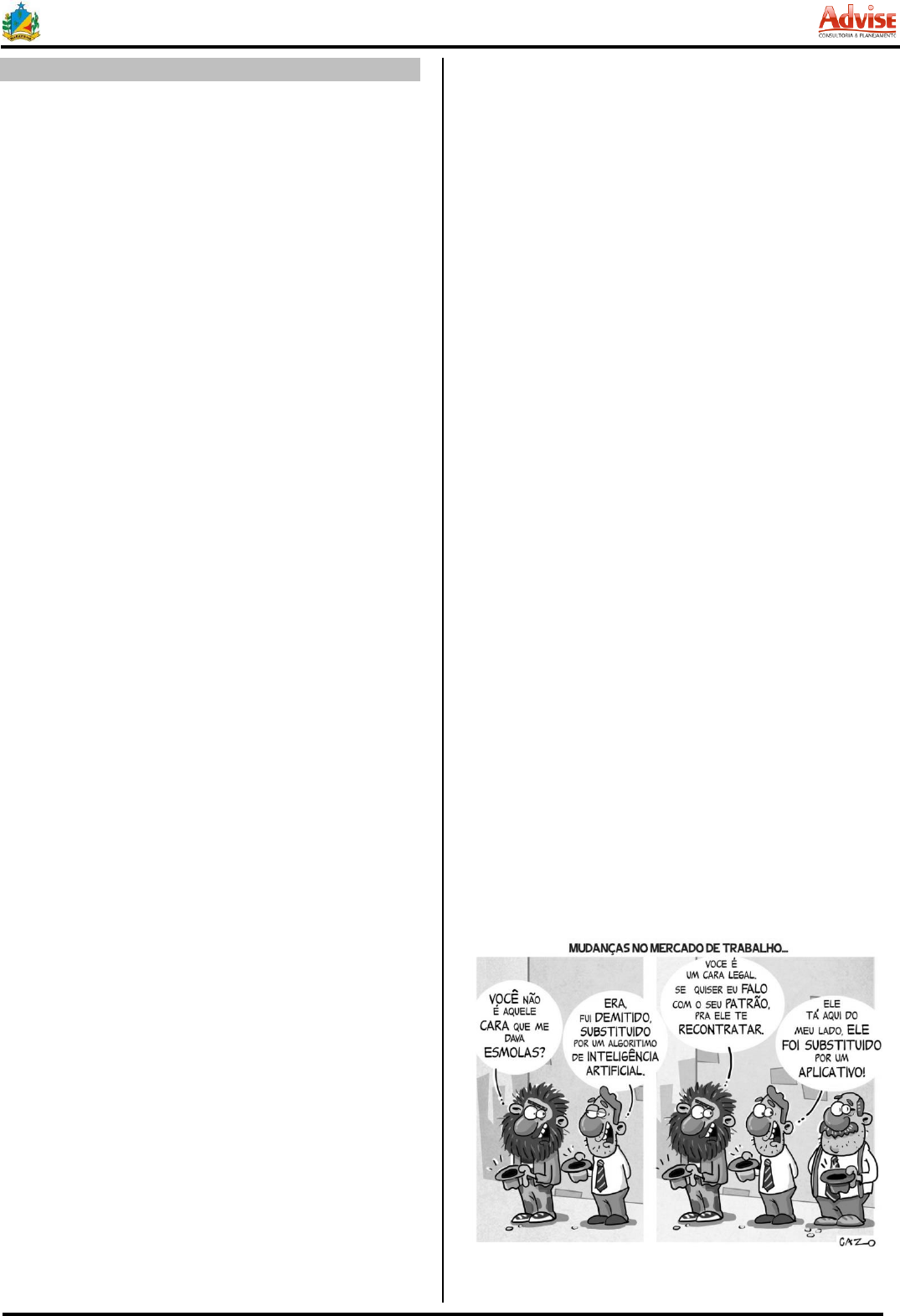 <p>PREFEITURA DO MUNICÍPIO DE MARAVILHA (AL)</p><p>CARGO: AUXILIAR DE SERVIÇOS GERAIS 1</p><p>PORTUGUÊS</p><p>Leia o texto a seguir para responder as questões de 01 a</p><p>06.</p><p>UMA ANEDOTA</p><p>Dois primos vão cervir o Exército. Chegando lá,</p><p>são entrevistados pelo sargento:</p><p>- Qual é o seu nome? - pergunta ao primeiro.</p><p>- É Tonho.</p><p>- Negativo. De agora em diante você será “Antô-</p><p>nio”. E o que você está fazendo aqui?</p><p>- Me alistei.</p><p>- Negativo. Você está servindo à pátria. E o que é</p><p>aquilo? - pergunta apontando para a Bandeira do Bra-</p><p>sil.</p><p>- É a bandeira.</p><p>- Negativo. De agora em diante ela é a sua mãe.</p><p>Vira-se para o segundo e pergunta:</p><p>- Qual é o seu nome?</p><p>- É Carlos.</p><p>- E o que você está fazendo aqui?</p><p>- Servindo à pátria.</p><p>- E o que é aquilo? - apontando para a bandeira.</p><p>- É minha tia, mãe de Tonho.</p><p>(Versão adaptada de original extraído do seguinte sítio</p><p>da internet: https://sites.google.com/site/sindicatoservi-</p><p>doresjanauba/piadas-1/piadas/as-5)</p><p>01. Entende-se da anedota acima que:</p><p>A) O humor dela está no fato de Tonho ter errado o</p><p>nome da própria mãe.</p><p>B) O sargento tem predileção pelo Tonho em detri-</p><p>mento de Carlos.</p><p>C) Carlos entendeu literalmente a última informa-</p><p>ção fornecida a Tonho pelo sargento.</p><p>D) Tonho se interpôs entre Carlos e o sargento por-</p><p>que tinha relação consanguínea com o primeiro.</p><p>E) O sargento dizia coisas sem sentido.</p><p>02. Assinale a alternativa que apresenta as palavras em</p><p>ordem alfabética, de acordo com suas primeiras letras</p><p>consonantais.</p><p>A) Sargento – Tonho – Carlos.</p><p>B) Carlos – Sargento – Tonho.</p><p>C) Tonho – Carlos – Sargento.</p><p>D) Tonho – Sargento – Carlos.</p><p>E) Carlos – Tonho – Sargento.</p><p>03. Analise:</p><p>“É minha tia, mãe de Tonho.”.</p><p>Exerce a função de pronome na frase acima:</p><p>A) É</p><p>B) minha</p><p>C) tia</p><p>D) mãe</p><p>E) de</p><p>04. Sabe-se que uma das palavras da narrativa acima foi</p><p>incorretamente escrita. Assinale a alternativa em que ela</p><p>aparece.</p><p>A) Cervir – Dois.</p><p>B) Primos – Vão.</p><p>C) Exército – Chegando.</p><p>D) Entrevistados – Qual.</p><p>E) Servindo – Pergunta.</p><p>05. Marque a alternativa que apresenta duas palavras tris-</p><p>sílabas:</p><p>A) Brasil – Sua.</p><p>B) Pergunta – Primeiro.</p><p>C) Negativo – Agora.</p><p>D) Diante – Será.</p><p>E) Antônio – Você.</p><p>06. Marque a alternativa que apresenta duas palavras em</p><p>que ocorre encontro consonantal:</p><p>A) Nome – Agora.</p><p>B) Diante – Será.</p><p>C) Está – Fazendo.</p><p>D) Aqui – Tia.</p><p>E) Pátria – Mãe.</p><p>Analise a charge a seguir para responder as questões 07</p><p>e 08.</p><p>(A charge acima foi extraída do seguinte sítio da internet:</p><p>https://www.tribunaribeirao.com.br/site/charge-30-de-abril-e-1o-de-</p><p>maio-de-2023/)</p><p>PREFEITURA DO MUNICÍPIO DE MARAVILHA (AL)</p><p>CARGO: AUXILIAR DE SERVIÇOS GERAIS 2</p><p>07. A charge acima ironiza:</p><p>A) O efeito positivo da informática na empregabili-</p><p>dade.</p><p>B) Os efeitos da pandemia nas reações humanas.</p><p>C) A hierarquia das grandes empresas no mundo</p><p>moderno.</p><p>D) Os efeitos do mundo digital na dinâmica laboral.</p><p>E) As relações afetivas entre chefes, clientes e su-</p><p>bordinados.</p><p>08. Assinale a alternativa em que as palavras abaixo es-</p><p>tão em ordem alfabética, tendo em vista as primeiras vo-</p><p>gais de cada uma:</p><p>A) Aplicativo – Inteligência – Artificial.</p><p>B) Inteligência – Artificial – Aplicativo.</p><p>C) Inteligência – Aplicativo – Artificial.</p><p>D) Artificial – Aplicativo – Inteligência.</p><p>E) Aplicativo – Artificial – Inteligência.</p><p>Leia o texto a seguir para responder as questões de 09 a</p><p>15.</p><p>O Retrato da Mulher</p><p>Uma jovem senhora foi diagnosticada com uma do-</p><p>ença terminal e é informada pelo médico que tem dois</p><p>meses de vida. Então, ela decide ir a um pintor para fa-</p><p>zer-se retratar e assim deixar uma linda lembrança para</p><p>sua família. No dia em que combinaram, o ar-</p><p>tista chega, ela se senta para posar e o pintor começa a</p><p>retratá-la. Depois de alguns minutos ela diz a ele:</p><p>- Por favor, você poderia pintar uma tiara de dia-</p><p>mantes na minha cabeça?</p><p>- Sim, senhora, certamente.</p><p>Depois de alguns minutos:</p><p>- E um colar de pérolas no pescoço?</p><p>- Claro, madame.</p><p>E ela pede que ele pinte tambem um anel com uma</p><p>esmeralda, uma pulseira de ouro etc. Depois de algumas</p><p>horas o retrato está pronto e a senhora parece uma rai-</p><p>nha toda coberta de joias.</p><p>O pintor diz a ela:</p><p>- Com licença, senhora, mas por que queria que eu</p><p>a pintasse com tantas joias?</p><p>- Muito simples, para que a próxima mulher com</p><p>quem meu marido se case enlouquessa, procurando por</p><p>elas.</p><p>(A anedota acima é uma adaptação de original extraído</p><p>do seguinte sítio da internet: https://www.tudopore-</p><p>mail.com.br/content.aspx?emailid=17438).</p><p>09. Assinale a alternativa que contém duas palavras do</p><p>texto acima, as quais apresentam, ambas, um encontro</p><p>vocálico e encontro consonantal em cada uma.</p><p>A) Diagnosticada – Doença.</p><p>B) Terminal – Informada.</p><p>C) Médico – Decide.</p><p>D) Pintor – Retratar.</p><p>E) Lembrança – Família.</p><p>10. Assinale a alternativa em que as sílabas da palavra</p><p>estão incorretamente separadas.</p><p>A) Pin-te.</p><p>B) A-nel.</p><p>C) Ra-inha.</p><p>D) Pul-sei-ra.</p><p>E) Pri-mei-ro.</p><p>11. É um antônimo de “terminal”:</p><p>A) Última.</p><p>B) Derradeira.</p><p>C) Extrema.</p><p>D) Inicial.</