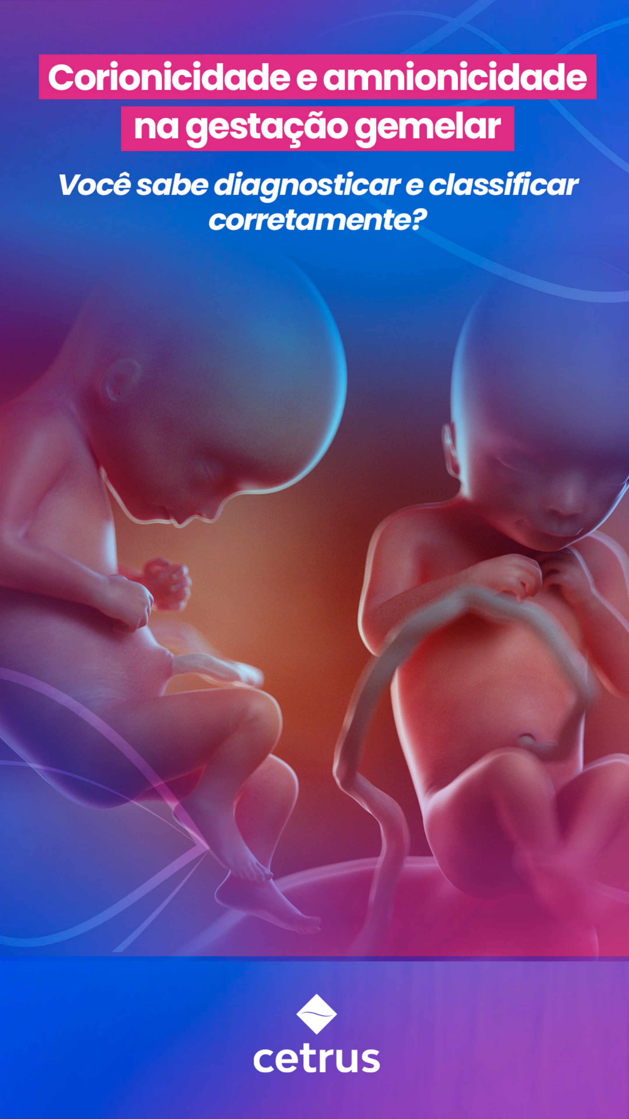 <p>Sumário</p><p>Sobre a autoraSobre a autora ............................................................................. .............................................................................pág. 03pág. 03</p><p>Introdução .................................................................................... ....................................................................................pág. 04</p><p>Corionicidade, amnionicidade e zigozidade pág. 06</p><p>Como diagnosticar e classificar .............................. ..............................pág. 08</p><p>Conclusão .......................................................................................... ..........................................................................................pág. 14</p><p>Confira nosso guia e clique para ir</p><p>para a página que você quer</p><p>Sobre a autora</p><p>Larrie Laporte</p><p>Médica pela Escola Bahiana de Medicina e</p><p>Saúde Pública. Estatística pela Universidade</p><p>Salvador. Formação em pesquisa clínica</p><p>pela Harvard T.H. Chan School of Public</p><p>Health. Possui interesse em medicina</p><p>intensiva, cuidados paliativos, bioestatística</p><p>e metodologia científica.</p><p>Introdução</p><p>A importância de uma boa avaliação na gestação gemelar</p><p>A gestação gemelar é uma condição cada</p><p>vez mais comum na obstetrícia moderna.</p><p>Embora as gravidezes múltiplas sejam</p><p>um grande desafio para os profissionais</p><p>de saúde, a avaliação adequada</p><p>da corionicidade e amnionicidade é</p><p>fundamental para a gestão clínica eficaz</p><p>desses casos.</p><p>A corionicidade é determinada pelo número</p><p>de membranas coriônicas (placentas)</p><p>que envolvem os fetos em uma gravidez</p><p>múltipla. Gravidez monocoriônica significa</p><p>que todos os gêmeos compartilham</p><p>apenas uma membrana, já na gravidez</p><p>dicoriônica temos duas membranas</p><p>e na gravidez tricoriônica, temos três</p><p>membranas.</p><p>Por sua vez, a amnionicidade é o número</p><p>de âmnios (membranas internas) que</p><p>envolvem os fetos em uma gravidez</p><p>múltipla. Gravidez monoamniótica é</p><p>quando temos um âmnio, gravidez</p><p>diamniótica é quando temos dois âmnios e</p><p>gravidez triamniótica é quando temos três</p><p>âmnios.</p><p>Entender a amniocidade e corionicidade</p><p>é fundamental na gestão de gestações</p><p>gemelares porque gêmeos monocoriônicos</p><p>compartilham a mesma circulação</p><p>fetoplacentária. Isso aumenta o risco de</p><p>complicações graves como a síndrome</p><p>de transfusão feto-fetal, anemia</p><p>policitemia dos gêmeos, restrição</p><p>seletiva do crescimento fetal e perfusão</p><p>arterial reversa dos gêmeos. Além disso,</p><p>gêmeos monoamnióticos estão em risco</p><p>de enovelamento do cordão umbilical</p><p>e serem siameses. Por causa dessas</p><p>complicações, gestações monocoriônicas e</p><p>monoamnióticas são monitoradas de forma</p><p>diferente do que gestações dicoriônicas.</p><p>Para ajudar, elaboramos esse eBook, para</p><p>que sirva como um guia nessa classificação</p><p>e na melhor condução de gestações</p><p>gemelares.</p><p>Corionicidade,</p><p>amnionicidade e</p><p>zigozidade</p><p>Os pares de gêmeos dizigóticos, ou</p><p>“fraternos”, são gerados a partir da</p><p>ovulação e fertilização de dois óvulos,</p><p>resultando em duas placentas distintas e</p><p>uma placenta dicoriônica/diaminiótica.</p><p>Por outro lado, os gêmeos monozigóticos,</p><p>ou “idênticos”, surgem da ovulação e</p><p>fertilização de um único óvulo, seguida</p><p>de divisão do zigoto. A placentação é</p><p>geralmente determinada pelo momento</p><p>da divisão do óvulo. Para facilitar, confira</p><p>o esquema abaixo:</p><p>Fonte: George Nikolopoulos Clinic</p><p>Fluxograma retirado do protocolo “Rotinas Assistenciais</p><p>da Maternidade-Escola da UFRJ”</p><p>Como diagnosticar</p><p>e classificar</p><p>A corionicidade e amniocidade podem</p><p>ser determinadas com precisão por</p><p>ultrassonografia no primeiro trimestre entre</p><p>7 a 14 semanas, com uma sensibilidade</p><p>superior a 98%. A amnionicidade</p><p>especificamente pode ser estabelecida a</p><p>partir de 8 semanas.</p><p>A precisão é menor, mas ainda aceitável,</p><p>no início do segundo trimestre, com uma</p><p>sensibilidade superior a 90%. No terceiro</p><p>trimestre, a avaliação ultrassonográfica</p><p>das membranas fetais é mais difícil e</p><p>menos precisa, especialmente em casos de</p><p>oligoidrâmnio.</p><p>Primeiramente, a identificação de duas</p><p>placentas ou sacos gestacionais separados</p><p>é um indicador altamente confiável de</p><p>gêmeos dicoriônicos. É importante ressaltar</p><p>que esse parâmetro é mais útil no início</p><p>da gestação, pois as placentas separadas</p><p>podem aparecer fundidas mais tarde. No</p><p>entanto, a presença de uma única massa</p><p>placentária não é diagnóstica de uma</p><p>gravidez monocoriônica, pois placentas</p><p>separadas podem aparecer fundidas no</p><p>início da gestação. Em casos raros, uma</p><p>placenta monocoriônica com lobo bilobado</p><p>ou succenturiado pode dar a aparência de</p><p>duas placentas separadas.</p><p>Gestação gemelar dicoriônica/diamniótica com duas</p><p>placentas separadas</p><p>Fonte: Constantine, Sarah & Wilkinson, Chris. (2012). Double</p><p>Trouble: “There is NO diagnosis of twins”</p><p>Monocoriônico/monoamniótico</p><p>O diagnóstico de gêmeos monocoriônicos/</p><p>monoamnióticos é feito pela visualização de</p><p>cordões umbilicais entrelaçados em modo M,</p><p>com duas frequências cardíacas diferentes</p><p>em voltas adjacentes do cordão.</p><p>Gêmeos monocoriônicos/monoamnióticos com</p><p>emaranhamento de cordão. Fonte: Radiopaedia</p><p>Gêmeos monocoriônicos/monoamnióticos com</p><p>emaranhamen