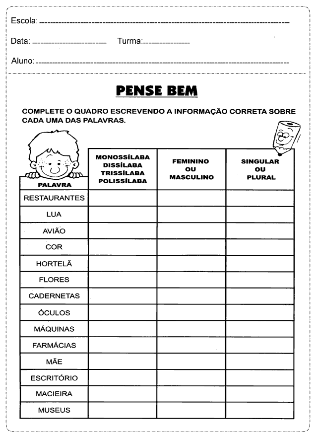 <p>Escola: Data Turma Aluno: PENSE BEM COMPLETE QUADRO ESCREVENDO A INFORMAÇÃO CORRETA SOBRE CADA UMA DAS MONOSSILABA FEMININO SINGULAR ou ou MASCULINO PLURAL PALAVRA RESTAURANTES LUA AVIÃO COR FLORES CADERNETAS ÓCULOS MÁQUINAS FARMÁCIAS MÃE ESCRITÓRIO MACIEIRA MUSEUS</p>