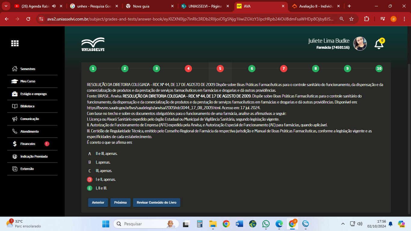 <p>(26) Agenda Rabi unhex Pesquisa Goc Nova UNIASSELVI Página x AVA Avaliação II Individu + Juliete Lima Budke Farmácia (7450116) UNLASSELVI Semestres 1 2 3 4 5 6 7 8 9 10 Meu Curso RESOLUÇÃO DA DIRETORIA COLEGIADA RDC 44, DE 17 DE AGOSTO DE 2009 Dispõe sobre Boas Práticas Farmacêuticas para controle sanitário do funcionamento, da dispensação e da comercialização de produtos e da prestação de serviços farmacêuticos em farmácias e drogarias e dá outras providências Estágio e Fonte BRASIL Anvisa RESOLUÇÃO DA DIRETORIA COLEGIADA RDC 44, DE 17 DE AGOSTO DE 2009. Dispõe sobre Boas Práticas Farmacêuticas para controle sanitário do da dispensação e da comercialização de produtos e da prestação de serviços farmacêuticos em farmácias e drogarias e dá outras providências. Disponível em: Biblioteca em: 17 jul. 2024. Com base no trecho e sobre os documentos obrigatórios para funcionamento de uma farmácia, analise as afirmativas a Comunicação Licença ou Alvará Sanitário expedido pelo órgão Estadual ou Municipal de Vigilância Sanitária, segundo legislação vigente. Autorização de Funcionamento de Empresa (AFE) expedida pela Anvisa e Autorização Especial de Funcionamento (AE) para aplicável. Atendimento III. Certidão de Regularidade Técnica, emitido pelo Conselho Regional de Farmácia da respectiva jurisdição e Manual de Boas Práticas Farmacêuticas, conforme a legislação vigente e as especificidades de cada Financeiro É correto que se afirma em: A II e III, apenas Indicação Premiada B I, apenas Extensão III apenas D I e II, apenas F I. Anterior Próxima Revisar Conteúdo do Livro 32°C 17:56 Parc ensolarado Q Pesquisar 02/10/2024</p>