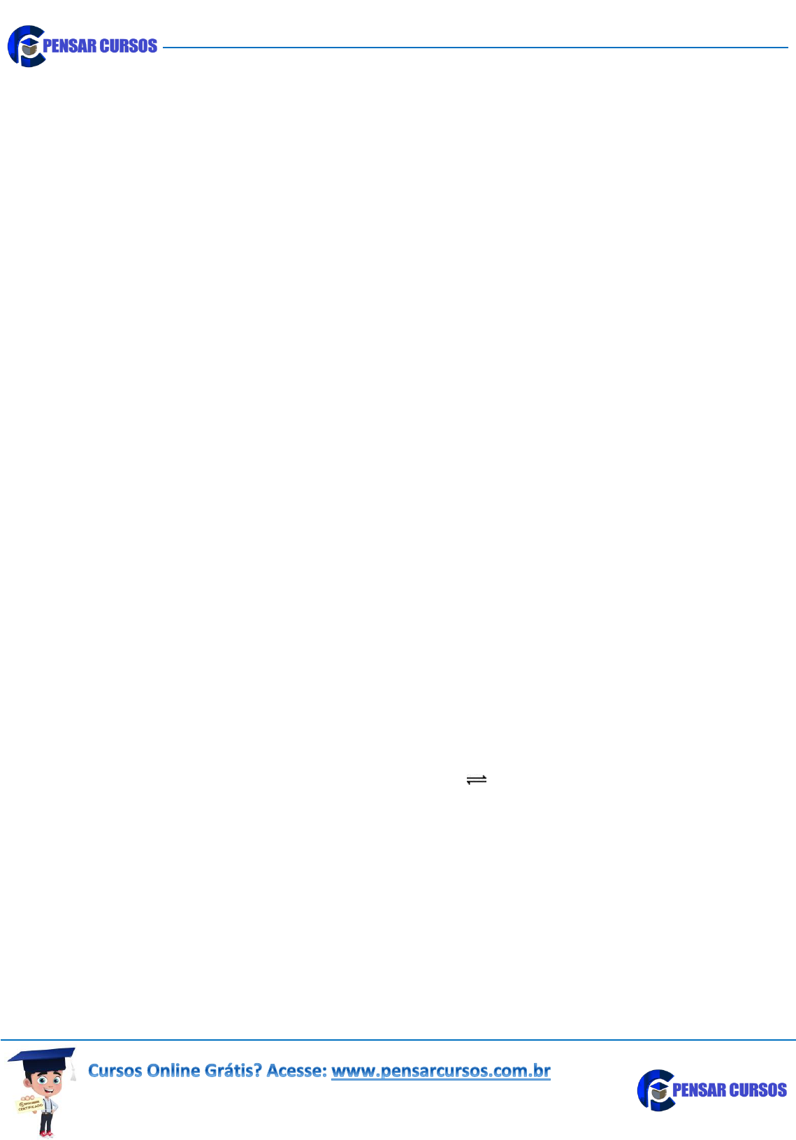 <p>Equações químicas</p><p>As equações químicas são regidas pela Lei da conservação da massa; todas</p><p>as demais propriedades físicas podem variar, porém a massa se mantém a mesma</p><p>antes e após a reação. Esta Lei vale para todas as reações químicas, com exceção</p><p>das reações nucleares, pois, nestas reações, uma parcela da massa é convertida</p><p>em energia, segundo a equação E = m.c².</p><p>As equações químicas são representações gráficas de reações químicas do</p><p>ponto de vista qualitativo e quantitativo, através da utilização de fórmulas químicas.</p><p>Como estas representações derivam do trabalho de Berzelius, os símbolos químicos</p><p>também apresentam um resultado quantitativo; desta forma, quando escrevemos</p><p>Ouro como Au, também indicamos 197g deste elemento, e não apenas o elemento</p><p>em si.</p><p>A equação,</p><p>4Fe + 3O2 → 2Fe2O3</p><p>significa que seis moléculas de Oxigênio estão reagindo com duas moléculas</p><p>de Ferro para formar Óxido de Ferro III. Isto também quer dizer que 96g de</p><p>Oxigênio (16x6) se combinam com 111,6g de Ferro (55,8x2) para formar 207,6g de</p><p>Óxido de Ferro III.</p><p>Nas equações químicas também é costume colocar uma flecha com duplo</p><p>sentido indicando um equilíbrio dinâmico, onde certo número de moléculas segue</p><p>certo rumo da flecha, enquanto um número proporcional ruma para o lado oposto;</p><p>isto implica que a reação atingiu o equilíbrio e não que ela tenha acabado. A flecha</p><p>dupla também serve para informar que uma reação é reversível.</p><p>1N2 + 3H2 2NH3</p><p>Classificação das Reações Químicas</p><p>De maneira genérica, as reações químicas (em se tratando de química</p><p>inorgânica) podem ser agrupadas em apenas seis tipos.</p><p>• Reações de síntese (ou de adição)</p><p>Em uma reação de síntese, duas ou mais substâncias reagem produzindo</p><p>uma única substância.</p><p>file:///D:/Meus%20Negocios/Pensar%20Cursos/www.pensarcursos.com.br</p><p>Exemplos: 2Na + Cl2 → 2NaCl 4Al + 3O2 → 2Al2O3</p><p>CaO + H2O → Ca(OH)2</p><p>OBS: Para se obtiver um determinado produto, pode ser preciso efetuar uma</p><p>sequência de reações de síntese. O ácido sulfúrico (H2SO4), por exemplo, usado na</p><p>fabricação de corantes, detergentes, produtos químicos, plásticos, adubos, etc., é</p><p>fabricado em três etapas, sendo todas elas reações de síntese.</p><p>1ª Etapa: S + O2 → SO2</p><p>2ª Etapa: 2SO2 + O2 → 2SO3</p><p>3ª Etapa: SO3 + H2O → H2SO4</p><p>• Reações de decomposição (ou de análise)</p><p>Essas reações são opostas às de síntese, ou seja, ocorrem quando temos</p><p>apenas um reagente que se separa (decompõe) em duas ou mais substâncias</p><p>(simples ou compostas) quando submetido a algum tipo de energia, como calor,</p><p>eletricidade ou luz, por exemplo.</p><p>Exemplos: 2AgBr → 2Ag + Br2 (fotólise)</p><p>2KClO3 → 2KCl + 3O2 (pirólise)</p><p>Certas reações de análise ou de decomposição recebem nomes especiais,</p><p>como:</p><p>- Pirólise: decomposição pelo calor (na indústria é chamada também de</p><p>calcinação);</p><p>- Fotólise: decomposição pela luz;</p><p>- Eletrólise: decomposição pela eletricidade;</p><p>• Reações de simples troca (ou de deslocamento ou de substituição)</p><p>Nessas reações temos um elemento livre (substância simples) reagindo com</p><p>um composto (substância composta – substância constituída por diferentes</p><p>elementos). O elemento livre desloca (ou seja, substitui) outro elemento do</p><p>composto. Para que isso ocorra, é necessário que o elemento livre seja mais reativo</p><p>do que o elemento a ser deslocado do composto. Em outras palavras, trata-se da</p><p>file:///D:/Meus%20Negocios/Pensar%20Cursos/www.pensarcursos.com.br</p><p>reação entre uma substância simples e uma substância composta, produzindo</p><p>também uma substância simples e uma substância composta.</p><p>Exemplos:Zn + 2HCl → ZnCl2 + H2</p><p>F2 + 2NaCl → 2NaF + Cl2</p><p>Comportamento dos metais</p><p>Os metais têm sempre tendência para ceder elétrons; consequentemente, os</p><p>metais se oxidam e agem como redutores. Os químicos, comparando vários metais,</p><p>conseguiram determinar quais são os metais que têm maior tendência e quais os</p><p>que têm menor tendência para ceder elétrons, segundo a Fila da Reatividade ou Fila</p><p>de Tensões Eletrolíticas, apresentados a seguir.</p><p>Qualquer metal dessa fila pode ceder elétrons, ou seja, reduzir cátions de</p><p>outro metal colocado à sua direita na fila. Desse modo, estamos prevendo a</p><p>ocorrência ou não de reações de deslocamento entre metais.</p><p>Outros Exemplos:Zn + HgSO4 → ZnSO4 + Hg</p><p>Ag + Al(NO3)3 → Não ocorre (pois a Ag vem depois do Al na fila de</p><p>reatividade)</p><p>Reações de Metais com ácidos</p><p>Exemplos: Zn + 2HCl → ZnCl2 + H2↑ Fe + H2SO4 → FeSO4 + H2↑</p><p>Au + HCl → Não ocorre (pois o Au vem depois do H na fila de reatividade)</p><p>Comportamento dos não metais</p><p>Os não metais têm sempre tendência para receber elétrons;</p><p>consequentemente, os não metais se reduzem e agem como oxidantes. Podemos</p><p>também arrumar os não metais em uma fila de reatividade.</p><p>file:///D:/Meus%20Negocios/Pensar%20Cursos/www.pensarcursos.com.br</p><p>Qualquer não metal dessa fila pode “receber elétrons” ou “oxidar”, ou seja,</p><p>“deslocar” qualquer outro não metal que venha mais adiante na fila. Exemplos: F2 +</p><p>2NaBr → 2NaF + Br2</p><p>Cl2</p><p>+ Na</p><p>2S → 2NaCl + S</p><p>I2 + NaCl → Não ocorre (pois o I vem depois do Cl na fila de reatividade).</p><p>Reações de Metais com água</p><p>Os metais alcalinos e alcalino-terrosos reagem com água à temperatura</p><p>ambiente (a única exceção é o magnésio, que só reage com água quente),</p><p>f