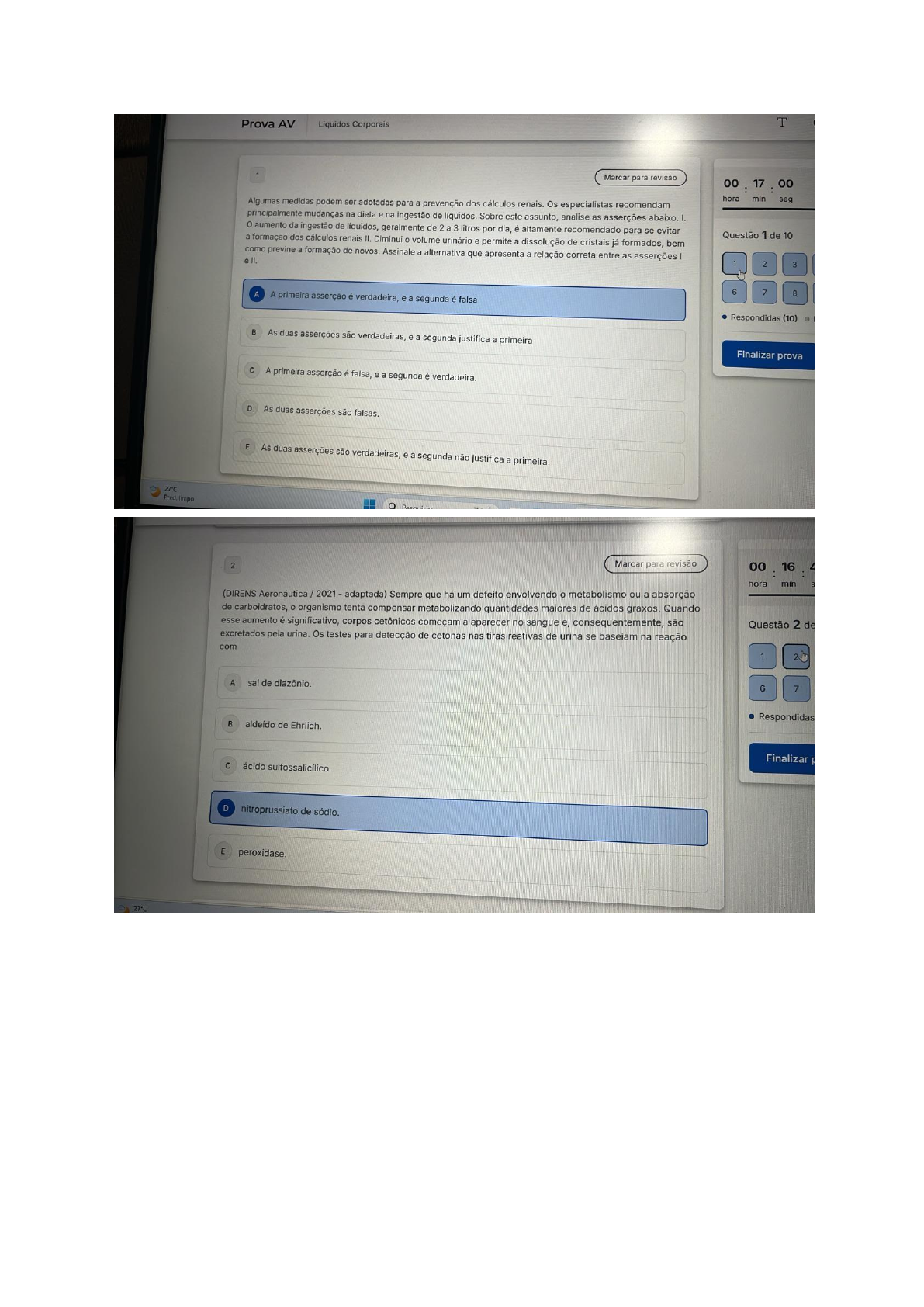 <p>T Prova AV Liquidos Corporais 1 Marcar para revisão 00 17 00 : : hora min seg Algumas medidas podem ser adotadas para a prevenção dos cálculos renais. Os especialistas recomendam principalmente mudanças na dieta e na ingestão de líquidos. Sobre este assunto, analise as asserções abaixo: o aumento da ingestão de líquidos, geralmente de 2 a 3 litros por dia, é altamente recomendado para se evitar Questão 1 de 10 a formação dos cálculos renais II. Diminui o volume urinário e permite a dissolução de cristais já formados, bem como previne a formação de novos. Assinale a alternativa que apresenta a relação correta entre as asserções I 1 2 3 e II. 6 7 8 A A primeira asserção é verdadeira, e a segunda é falsa Respondidas (10) B As duas asserções são verdadeiras, e a segunda justifica a primeira Finalizar prova A primeira asserção é falsa, e a segunda é verdadeira. As duas asserções são falsas. E As duas asserções são verdadeiras, e a segunda não justifica a primeira. 27°C limpo Marcar para revisão 2 00 16 : 4 hora min S (DIRENS / 2021 - adaptada) Sempre que há um defeito envolvendo metabolismo ou a absorção de carboidratos, o organismo tenta compensar metabolizando quantidades maiores de ácidos graxos. Quando esse aumento é significativo, corpos cetônicos começam a aparecer no sangue e, consequentemente, são Questão 2 de excretados pela urina. Os testes para detecção de cetonas nas tiras reativas de urina se baseiam na reação com 1 2 A sal de 6 7 Respondidas B de Ehrlich. Finalizar C ácido D nitroprussiato de E peroxidase. 27°C</p><p>3 Marcar para revisão 00 16 43 : hora min se (AEEAR / 2021 adaptada) "A medicina laboratorial teve sua origem a partir de uma análise de urina; há referências sobre urina nos desenhos feitos por nossos primeiros ancestrais e em hieróglifos egípcios. Os médicos da antiguidade baseavam-se, na maioria das vezes, apenas na análise da urina do paciente para obter Questão 3 de 1 um diagnóstico; este era baseado na observação da turvação, odor, volume, con e até presença ou não de na urina." STRASINGER, S.K.; DI LORENZO, M.S. Urianalysis and Body Fluids. ed. Philadelphia. F.A. 1 2 Davis Company, 2014. Atualmente, o exame de urina é dividido em física, análise química e sedimentoscopia, que representa a última etapa da fase analítica do exame de urina. Marque a alternativa que apresenta os elementos observados nessa fase da 6 7 Respondidas (1 A Finalizar B Células epiteliais. Cetonas. D Hemoglobina. E 27°C Pred limpo Marcar para revisão 00 16 37 4 : hora min seg Um paciente do sexo 56 anos, residente em cidade do interior foi procurar atendimento médico após sentir fortes dores na região lombar esquerda. Sem apresentar febre e com contagem normal de leucócitos o paciente apenas relatou que está com dificuldades para urinar. Por se tratar de uma unidade Questão 4 de 1 básica de saúde no interior, o médico não dispunha de equipamentos de ultrassonografia e tomografia. Suspeitando de cálculo renal, médico então solicitou um exame de urina (EAS) que poderia ser realizado por 1 2 um técnico da unidade de saúde. Marque a alternativa que apresenta os principais achados que o técnico pode encontrar. 6 7 Respondidas (1 A Cristais de ácido úrico e bactérias Finalizar B Hematúria e presença de cristais C Bactérias e hematúria D Leucócitos e cristais de ácido úrico E Leucócitos e bactérias 27°C Pred limpo</p><p>Marcar para revisão 5 00 16 3 : hora min S Durante a avaliação macroscópica de um líquido pleural foi observado que esse apresentava um aspecto hemorrágico com valor do hematócrito 50% maior que o valor do hematócrito realizado na amostra de sangue periférico. Nesse caso qual é o possível diagnóstico do paciente? Questão 5 de 1 2 A 6 7 B Pleurite Respondidas C Finalizar p D Processo inflamatório obstrutivo com vazamento de linfa. E 6 27°C Marcar para revisão Marcar para revisão 00 16 2 6 : hora min se A identificação correta do agente causador de efusões pericárdicas é crucial para o manejo clinico adequado e o prognóstico dos pacientes. Qual a importância na detecção de M. tuberculosis no líquido pericárdico? Questão 6 de A tuberculose é uma doença rara e pouco relevante no contexto das efusões pericárdicas, portanto, 1 2 A sua detecção não influencia significativamente manejo dos pacientes. 7 B A tuberculose é uma das principais causas de efusão pericárdica exsudativa, sendo fundamental Respondidas descartá-la devido à sua importância epidemiológica e à necessidade de um tratamento específico. Finalizar C A detecção de M. tuberculosis não é importante, sendo usado apenas como critério de exclusão em casos de pesquisa D Devido à baixa incidência de TB na população causados M. tuberculosis, todos os materiais clínicos devem ser testados para TB. E bacilo gran-negativo M. tuberculosis raramente ocasiona derrame pericárdico sendo sua detecção importante em estudos de caso específicos. 27°C Pred</p><p>7 Marcar para revisão 00 16 2 : hora min S (Adaptado de Instituto AOCP - Prefeitura de João Pessoa/ 2021) Um Paciente de 75 anos internado no Hospital Universitário de referência da cidade do Rio de Janeiro teve um quadro de consolidação em segmento superior do lobo inferior direito. Assim, foi realizado lavado broncoalveolar mas o médico suspeitou que a Questão 7 de coleta do material foi inadequada e encaminhou para laboratório para análise com essa ressalva no pedido médico. Durante a análise no laboratório, é possível o analista a partir da contagem de células, confirmar a 1 2 suspeita de coleta inadequada. Assim, assinale a alternativa que indica qual de coleta inadequada do lavado broncoalveolar, que confirma a suspeita de coleta inadequada pela equipe médica. 6 A Linfócitos 6% a Respondidas B Macrófagos 85% a Finalizar C Eosinófilos D Elevado número de células epiteliais (>5%). E