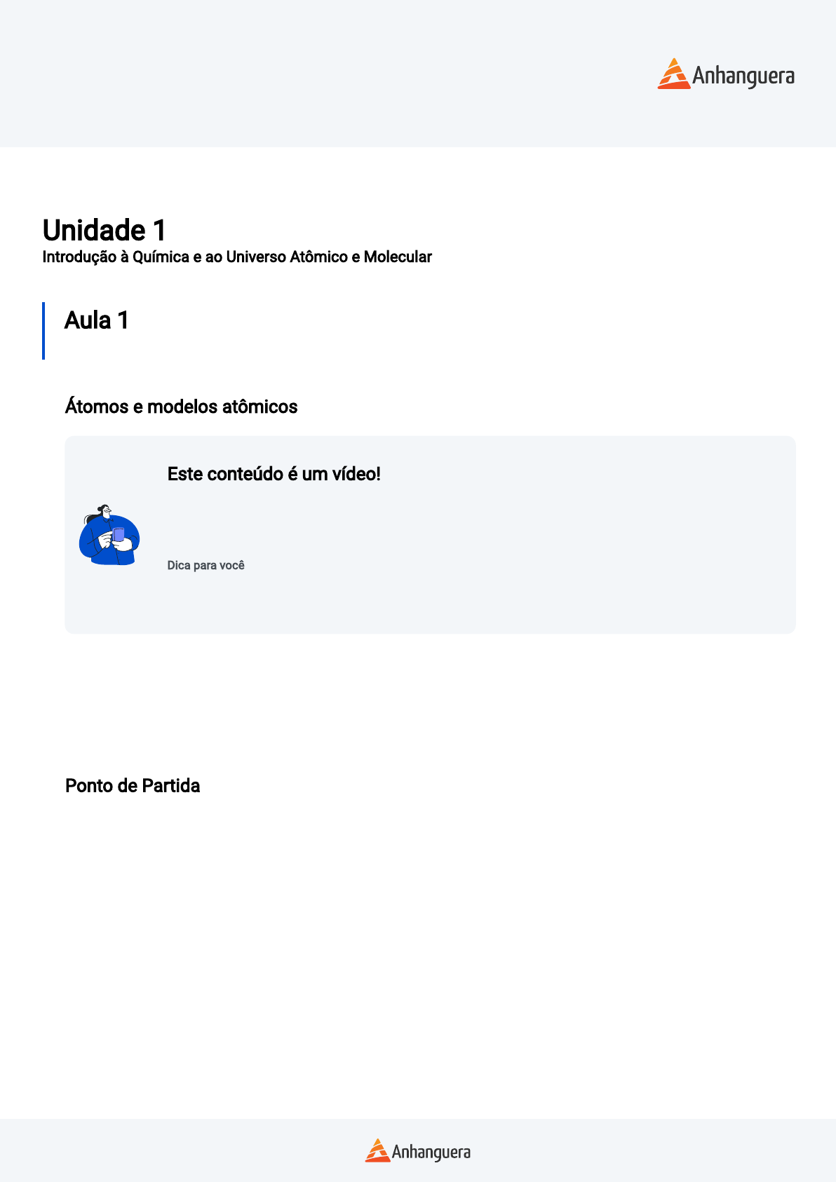 <p>Disciplina</p><p>QUÍMICA GERAL</p><p>Unidade 1</p><p>Introdução à Química e ao Universo Atômico e Molecular</p><p>Aula 1</p><p>Átomos e Modelos Atômicos</p><p>Átomos e modelos atômicos</p><p>Este conteúdo é um vídeo!</p><p>Para assistir este conteúdo é necessário que você acesse o AVA pelo computador ou pelo</p><p>aplicativo. Você pode baixar os vídeos direto no aplicativo para assistir mesmo sem conexão à</p><p>internet.</p><p>Dica para você</p><p>Aproveite o acesso para baixar os slides do vídeo, isso pode deixar sua aprendizagem ainda</p><p>mais completa.</p><p>Olá, estudante! Nesta videoaula você irá conhecer a matéria e seus princípios básicos, iniciando nosso estudo</p><p>com os átomos e a evolução dos modelos atômicos, assim como os números quânticos e a distribuição</p><p>eletrônica. Esse conteúdo é importante para a sua prática pro�ssional, pois é crucial para guiar descobertas em</p><p>pesquisa, desenvolvimento de materiais, diagnóstico médico e controle de processos, fundamentando avanços</p><p>nas ciências e tecnologias. Esteja pronto para embarcar nesta jornada de aprendizado! Vamos lá!</p><p>Ponto de Partida</p><p>Aprendemos muito cedo na escola que nosso corpo é feito de células, porém, se olharmos mais de perto,</p><p>veremos que nossas células são feitas de moléculas. Algumas são moléculas grandes, como as proteínas,</p><p>outras pequenas, como a molécula de água ( ). As moléculas que fazem parte do nosso corpo são feitas de</p><p>átomos, em maior proporção por carbono, hidrogênio, oxigênio e nitrogênio, no entanto, existem outros</p><p>elementos que são necessários à vida, como o ferro que está na estrutura da mioglobina, uma proteína que é</p><p>responsável pelo transporte de oxigênio em nosso sangue. Este ferro é o mesmo tipo de átomos de ferro que</p><p>compõem vigas para uma construção.</p><p>Nosso corpo e a viga são feitos de átomos e todos os átomos conhecidos até hoje apresentam a mesma</p><p>estrutura, um núcleo e uma eletrosfera. Nesta aula, você será apresentado ao átomo, ao universo atômico e</p><p>molecular, a como os átomos são compostos, como estas informações são organizadas e quais os princípios</p><p>básicos de reatividade.</p><p>Para aplicar esses conteúdos, você precisará avaliar um processo industrial, onde a remoção de contaminantes é</p><p>uma etapa-chave do processo, melhorando a pureza de diversos produtos, sendo que diferentes técnicas de</p><p>puri�cação podem ser aplicadas. Assim, você irá se colocar no lugar de um professional da engenheira que</p><p>Disciplina</p><p>QUÍMICA GERAL</p><p>trabalha numa fábrica de ração animal. Pelo processo de fabricação, muitos minérios estavam contaminando o</p><p>produto e dani�cando alguns equipamentos. Tentando uma alternativa para o problema, o diretor da empresa lhe</p><p>consultou sobre a compra de um tambor magnético de via úmida. Para saber qual tipo de contaminantes o ímã</p><p>irá remover, você precisa saber quais substâncias apresentam atração por ímãs e assim emitir um parecer sobre</p><p>a compra do equipamento. Bons estudos!</p><p>Vamos Começar!</p><p>A química esteve presente em toda a história da humanidade. No início, a química não era vista como ciência,</p><p>mas como algo utilitarista, isto é, desenvolvia o conhecimento para resolver problemas sociais. Foi assim com o</p><p>desenvolvimento dos primeiros materiais de argila obtidos pelo homem após descobrir o fogo, com o</p><p>surgimento de tintas primitivas e de produtos de cerâmica no �nal do período neolítico e com todo o avanço dos</p><p>egípcios antigos, que desenvolveram os perfumes, alguns remédios, papiros e diversas tintas, entre outras</p><p>coisas. Hoje, a química é uma ciência e seus avanços e descobertas permitiram muitas melhorias no dia a dia,</p><p>estando intrinsicamente relacionados com a melhora da qualidade de vida.</p><p>Quando você tem uma dor de cabeça e toma um analgésico, aquele comprimido foi um avanço da química. Ao</p><p>colocar uma roupa, o material com o qual ela é confeccionada foi um avanço da química. Beber uma água</p><p>tratada que não causa problemas de contaminação ao seu corpo, só é possível pelo avanço da química. A</p><p>tecnologia tem progredido com o avanço da química, a�nal as baterias de seu celular está cada vez durando</p><p>mais, não é mesmo?</p><p>As primeiras considerações cientí�cas sobre a constituição da matéria foram feitas por Robert Boyle (1627-</p><p>1691), em 1661, com a primeira de�nição de elemento químico como um corpo não misturado ou simples, que</p><p>não pode ser feito de outro corpo e que a matéria era composta por várias combinações de diferentes elementos</p><p>(KOTZ et. al., 2014). A partir disso, Dalton realizou experimentos medindo a massa de diversos compostos,</p><p>observando que a quantidade dos elementos permanecia sempre a mesma, desse modo, Dalton propôs um</p><p>modelo para composição da matéria, que seria formada de minúsculas partículas indivisíveis, sendo os átomos</p><p>de cada elemento iguais. Para diferentes elementos, os átomos teriam massas distintas e a combinação química</p><p>ocorreria quando os átomos formassem uma união �rme, sendo que nestas reações os átomos não seriam</p><p>criados e nem destruídos. O modelo atômico de Dalton �cou conhecido como bola de bilhar, por considerar o</p><p>átomo uma bola maciça.</p><p>A partir desse modelo e por meio da realização de experimentos, Thomson, em 1897, identi�cou uma espécie</p><p>subatômica. Esta espécie foi denominada elétron e em 1898. Thomson propôs um novo modelo para o átomo,</p><p>em que havia uma massa positiva encrostada de cargas negativas, este modelo �cou conhecido como pudim de</p><p>passas.</p><p>Os próximos avanços em termos de modelos atômicos, estão relacio