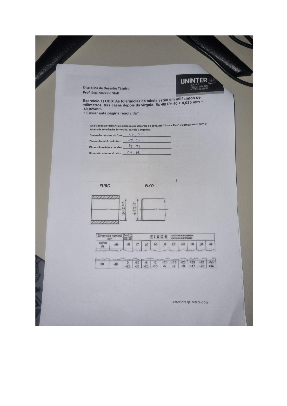 <p>UNINTER CENTRO Disciplina de Desenho Técnico UNIVERSITÁRIO INTERNACIONAL Prof. Esp. Marcelo Staff Exercício 1) OBS: As tolerâncias da tabela estão em milésimos de milímetros, três casas depois da virgula. Ex 40H7= 40 + 0,025 mm = 40,025mm " Enviar esta página resolvida" Analisando as tolerâncias indicadas no desenho do conjunto "Furo X Eixo" e comparando com a tabela de tolerâncias fornecida, calcule o seguinte: Dimensão máxima do furo: Dimensão mínima do furo: Dimensão máxima do eixo: 39,91 Dimensão mínima do eixo: FURO EIXO Furo Dimensão nominal EIXOS afastamento superior mm afastamento inferior acima até H7 f7 g6 h6 j6 k6 de m6 n6 p6 r6 0 -25 -9 0 +11 30 +18 +25 +33 +42 +50 40 +25 -50 -25 -16 -5 +2 +9 +17 +26 +34 Professor Esp. Marcelo Staff</p><p>Disciplina de Desenho Técnico UNINTER CENTRO Prof. Esp. Marcelo Staff UNIVERSITÁRIO INTERNACIONAL Exercício 2). Observe a cotagem do pino de Retenção ECO e determine os valores solicitados. " Enviar esta página resolvida" Ex Afastamento superior = -0,02 mm. Material Código do artigo Forma do corpo Versão D D1 D2 L L1 L2 L3 H básico K0632.001903 Aço endurecida 3 M6x0,75 14 34,5 12 5 10 3,5 A inoxidável D2 a) Determine Dimensão D Forma A Afastamento Superior: -0,02 sem ranhura de engate sem contraporca Afastamento Inferior: -0,04 SW1 12 Dimensão Máxima: Dimensão Mínima: 2,96 H Tolerância: -0,04 D1 b) Determine a dimensão "D2 "= 14 c) Determine o comprimento "L"= d) Determine comprimento "H"= 3,5 e) Determine o comprimento "L3"= 10 Professor Esp. Marcelo Staff</p><p>12 2 30 15 Peça Denominação Qdte Material Peça: Data 01 25/08/2024 Empresa: UNINTER Esc: Unidade: Aluno: M AKAVAN REIS Titulo: UNINTER IDADE PRATICA</p><p>to 15 # 015 2 5 45 45 20 75 25 015 20 75 Peça Denominação Qdte Material Peça: Data 01 25/08/2024 Empresa: UNINTER Esc: Unidade: Aluno: AKAUAN RE15 Titulo: UNINTER CENTRO UNIVERSITÁRIO 4</p><p>30 D 35 15 30 A 4 15 Peça Denominação Qdte Material Peça: Data 01 25/08/2024 Empresa: UNINTER Esc: Unidade: Aluno: RE15 Titulo: UNINTER UNIVERSITARIO ATIVIDADE PRATICA 4</p>