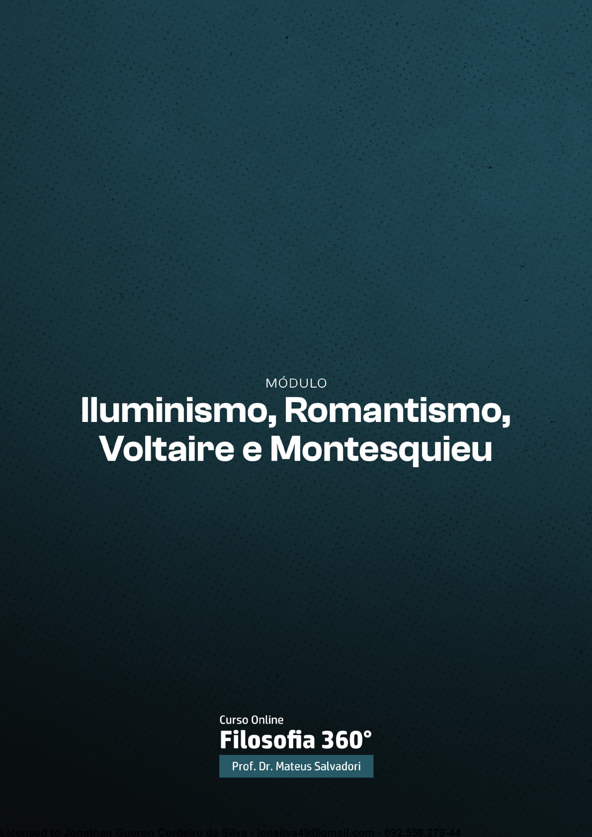<p>Licensed to Jonathan Gueron Cordeiro da Silva - jonsilva49@gmail.com - 092.558.279-44</p><p>1. A RAZÃO NA CULTURA ILUMINISTA (História da Filosofia, vol. 4, de Reale e</p><p>An�seri)</p><p>. O Iluminismo é a filosofia hegemônica da Europa no séc. XVIII:</p><p>- Inserindo-se em tradições diversas e não formando um sistema compacto de</p><p>doutrinas, o Iluminismo se configura como um ar�culado movimento filosófi-</p><p>co, pedagógico e polí�co que captura progressivamente as classes cultas e a</p><p>burguesia em ascensão nos diversos países europeus.</p><p>- A caracterís�ca fundamental do movimento iluminista consiste em uma deci-</p><p>dida CONFIANÇA A RAZÃO HUMANA, cujo desenvolvimento é visto como o</p><p>progresso da humanidade, e em um desinibido uso crí�co da razão dirigido:</p><p>-- (a) à libertação em relação aos dogmas metafísicos, aos pre-conceitos</p><p>morais, às superstições religiosas, às relações desumanas entre os homens, às</p><p>tiranias políticas;</p><p>-- b) à defesa do conhecimento científico e técnico e dos inalienáveis direitos</p><p>naturais do homem e do cidadão. Kant dirá que o lema do Iluminismo é:</p><p>“Sapere aude!”</p><p>. A razão dos iluministas é limitada pela experiência:</p><p>- O lluminismo é uma filosofia o�mista que se empenha e trabalha pelo pro-</p><p>gresso e na base deste progresso espiritual, material e polí�co, os iluministas</p><p>põem o uso crí�co e constru�vo da razão.</p><p>- Todo séc. XVIII não entende mais a razão como o território das “verdades</p><p>eternas” e das “essências” (como ocorria nos grandes sistemas meta�sicos dos</p><p>séculos precedentes). A razão dos iluministas é a do empirista Locke, que en-</p><p>contra o seu paradigma metodológico na �sica de Newton; trata-se, portan-</p><p>to, de uma RAZÃO LIMITADA À EXPERIÊNCIA E CONTROLADA PELA EXPERIÊN-</p><p>CIA, que procura as leis do funcionamento dos fenômenos e as coloca em</p><p>prova. E o uso desta razão é um uso eminentemente público.</p><p>. O racionalismo iluminista se opõe ao conhecimento meta�sico:</p><p>- A razão dos iluministas não está, porém, confinada aos fatos de natureza:</p><p>ela não se fecha a nenhum campo de pesquisa, e olha ao mesmo tempo a na-</p><p>tureza e o homem (princípios do conhecimento, comportamentos é�cos,</p><p>estrutura e ins�tuições polí�cas, sistemas filosóficos, fés religiosas).</p><p>- A RAZÃO ILUMINISTA É CRÍTICA ENQUANTO EMPÍRICA, isto é, enquanto</p><p>1ILUMINISMO, ROMANTISMO,</p><p>VOLTAIRE E MONTESQUIEU</p><p>Licensed to Jonathan Gueron Cordeiro da Silva - jonsilva49@gmail.com - 092.558.279-44</p><p>ligada indu�vamente à experiência, e se opõe ao conhecimento meta�sico lar-</p><p>gamente dedu�vista e sistemá�co.</p><p>- Em tal contexto, a filosofia não é mais separada dos outros conhecimentos,</p><p>mas torna-se o sopro vivificante para a ciência natural, a história, a ciência do</p><p>direito, a polí�ca etc.; e a originalidade filosófica do pensamento iluminista</p><p>está não tanto nos conteúdos, mas no crivo crí�co desses conteúdos e no uso</p><p>deles feito em vista da melhoria do mundo e do homem.</p><p>. A filosofia do deísmo:</p><p>- O Iluminismo é, no conjunto, um movimento leigo no que se refere aos</p><p>“mitos” e às “supers�ções” das religiões posi�vas, mas sua filosofia é substan-</p><p>cialmente uma filosofia do deísmo, isto é, da única religião natural concebí-</p><p>vel pela razão (lockianamente compreendida).</p><p>- E a razão dos deístas admite:</p><p>-- 1) a existência de Deus;</p><p>-- 2) a criação e o governo do mundo por parte de Deus;</p><p>-- 3) a vida futura em que são pagos o bem e o mal.</p><p>- Trata-se de uma religiosidade racional, natural, leiga, à qual se une uma mo-</p><p>ralidade leiga, baseada sobre os princípios morais comuns a todo o gênero</p><p>humano; é em tal perspec�va, portanto, que a tarefa da razão se torna a de ilu-</p><p>minar as trevas das religiões posi�vas, analisando suas origens históricas e</p><p>seus usos sociais, e pondo às claras toda a sua desumanidade absurda. A ten-</p><p>dência ateia e materialista foi, ao contrário, minoritária e se difundiu no Ilumi-</p><p>nismo francês, principalmente depois de Voltaire.</p><p>. A razão na base das normas jurídicas e das teorias econômicas:</p><p>- O lluminismo põe a razão também como fundamento das normas jurídicas,</p><p>das concepções do Estado e das teorias econômicas.</p><p>- O direito natural significa direito racional e, melhor ainda, não-sobrenatural,</p><p>e as leis jurídicas são entendidas como as relações necessárias e imutáveis que</p><p>derivam da natureza das coisas.</p><p>- Sobre a base das ideais jusnaturalistas dos iluministas foi elaborada a doutri-</p><p>na dos direitos naturais e invioláveis do homem e do cidadão: a liberdade, a</p><p>igualdade, a propriedade, a segurança e a resistência à opressão.</p><p>- Esses princípios, expressos nas Declarações dos direitos americana (1776) e</p><p>francesa (1789), estão no fundamento das ordens cons�tucionais dos Estados</p><p>2ILUMINISMO, ROMANTISMO,</p><p>VOLTAIRE E MONTESQUIEU</p><p>Licensed to Jonathan Gueron Cordeiro da Silva - jonsilva49@gmail.com - 092.558.279-44</p><p>democrá�cos de �po ocidental.</p><p>. Os meios usados para a circulação das ideias iluministas:</p><p>- Em linha geral, as classes populares permaneceram estranhas ao movimen-</p><p>to iluminista, enquanto os iluministas conseguiram difundir as novas ideais</p><p>nas classes intelectuais e entre a burguesia avançada de toda a Europa. Os</p><p>meios usados para acelerar a circulação das ideias iluministas foram:</p><p>-- a) as Academias, em que se conseguiu dar maior espaço às ciências naturais,</p><p>�sicas e matemá�cas, à crí�ca da cultura e dos costumes;</p><p>