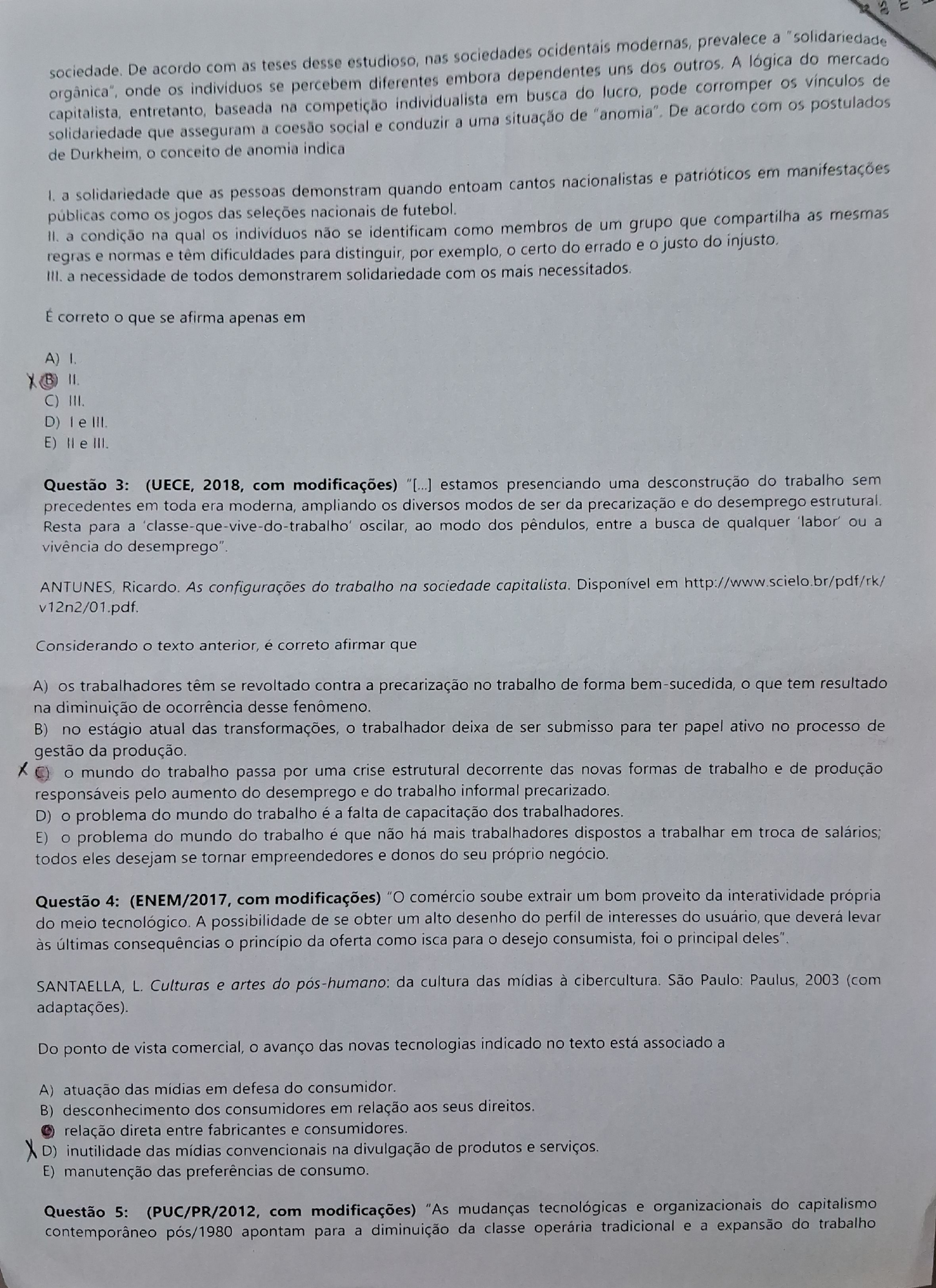 <p>De acordo com as teses desse estudioso, nas sociedades ocidentais uns modernas, dos prevalece A lógica a "solidariedade do mercado sociedade. percebem diferentes embora dependentes corromper os vínculos de onde os individuos baseada se competição individualista em busca do lucro, pode acordo os postulados solidariedade capitalista, entretanto, que asseguram a coesão na social e conduzir a uma situação de "anomia". De com de Durkheim, conceito de anomia indica a solidariedade que as pessoas demonstram quando entoam cantos nacionalistas e em manifestações II. a condição na qual os indivíduos não se identificam como membros de um grupo que compartilha as mesmas públicas como os jogos das seleções nacionais de futebol. regras e normas e têm dificuldades para distinguir, por exemplo, o certo do errado e o justo do injusto. III. a necessidade de todos demonstrarem solidariedade com os mais necessitados. É correto que se afirma apenas em A) C) III. D) e III. E) Questão 3: (UECE, 2018, com modificações) "[...] estamos presenciando uma desconstrução do trabalho sem precedentes em toda era moderna, ampliando os diversos modos de ser da precarização e do desemprego estrutural. Resta para a oscilar, ao modo dos pêndulos, entre a busca de qualquer 'labor' ou a vivência do ANTUNES, Ricardo. As configurações do trabalho na sociedade capitalista. Disponível em http://www.scielo.br/pdf/rk/ Considerando texto anterior, é correto afirmar que A) os trabalhadores têm se revoltado contra a precarização no trabalho de forma bem-sucedida, o que tem resultado na diminuição de ocorrência desse fenômeno. B) no estágio atual das transformações, o trabalhador deixa de ser submisso para ter papel ativo no processo de gestão da produção. mundo do trabalho passa por uma crise estrutural decorrente das novas formas de trabalho e de produção responsáveis pelo aumento do desemprego e do trabalho informal precarizado. D) problema do mundo do trabalho é a falta de capacitação dos trabalhadores. E) problema do mundo do trabalho é que não há mais trabalhadores dispostos a trabalhar em troca de salários; todos eles desejam se tornar empreendedores e donos do seu próprio negócio. Questão 4: (ENEM/2017, com modificações) "O comércio soube extrair um bom proveito da interatividade própria do meio tecnológico. A possibilidade de se obter um alto desenho do perfil de interesses do usuário, que deverá levar às últimas consequências o princípio da oferta como isca para o desejo consumista, foi o principal deles". SANTAELLA, L. Culturas e artes do da cultura das mídias à cibercultura. São Paulo: Paulus, 2003 (com adaptações). Do ponto de vista comercial, o avanço das novas tecnologias indicado no texto está associado a A) atuação das mídias em defesa do consumidor. B) desconhecimento dos consumidores em relação aos seus direitos. relação direta entre fabricantes e consumidores. D) inutilidade das mídias convencionais na divulgação de produtos e serviços. E) manutenção das preferências de consumo. Questão 5: (PUC/PR/2012, com modificações) "As mudanças tecnológicas e organizacionais do capitalismo contemporâneo pós/1980 apontam para a diminuição da classe operária tradicional e a expansão do trabalho</p>