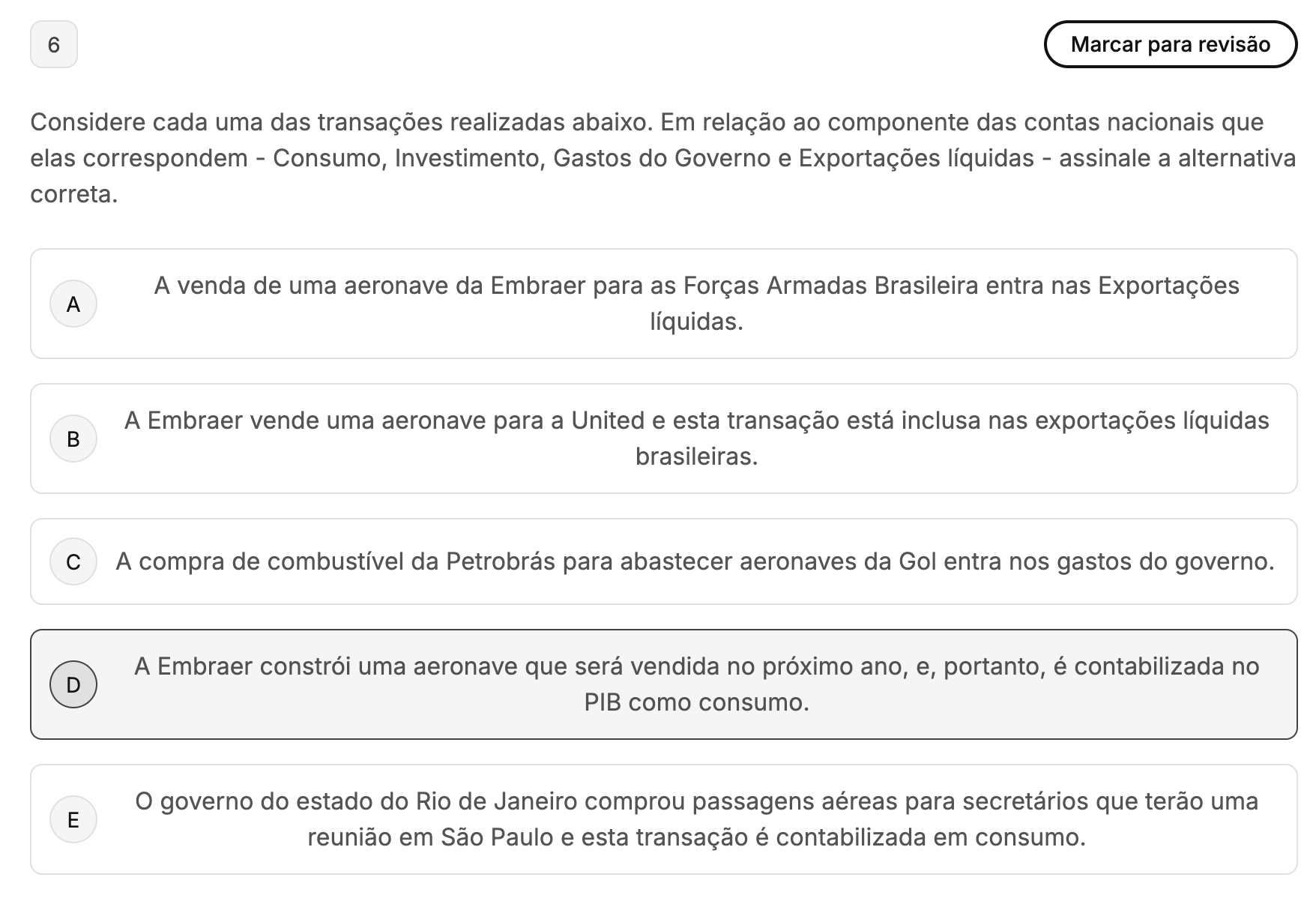 <p>6 Marcar para revisão Considere cada uma das transações realizadas abaixo. Em relação ao componente das contas nacionais que elas correspondem - Consumo, Investimento, Gastos do Governo e Exportações líquidas - assinale a alternativa correta. A venda de uma aeronave da Embraer para as Forças Armadas Brasileira entra nas Exportações A líquidas. A Embraer vende uma aeronave para a United e esta transação está inclusa nas exportações líquidas B brasileiras. C A compra de combustível da Petrobrás para abastecer aeronaves da Gol entra nos gastos do governo. A Embraer constrói uma aeronave que será vendida no próximo ano, e, portanto, é contabilizada no D PIB como consumo. governo do estado do Rio de Janeiro comprou passagens aéreas para secretários que terão uma E reunião em São Paulo e esta transação é contabilizada em consumo.</p>