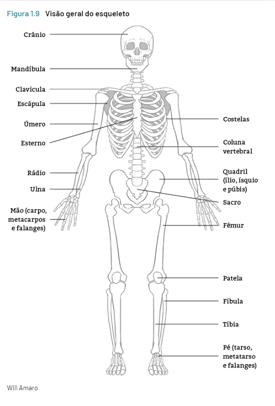 <p>Figura 1.9 Visão geral do esqueleto Crânio Mandíbula Clavícula Costelas Úmero Coluna Esterno vertebral Quadril Rádio (ilio, isquio e púbis) Ulna Sacro Mão (carpo, metacarpos e falanges) Patela Tíbia (tarso, metatarso e falanges) Will Amaro</p>