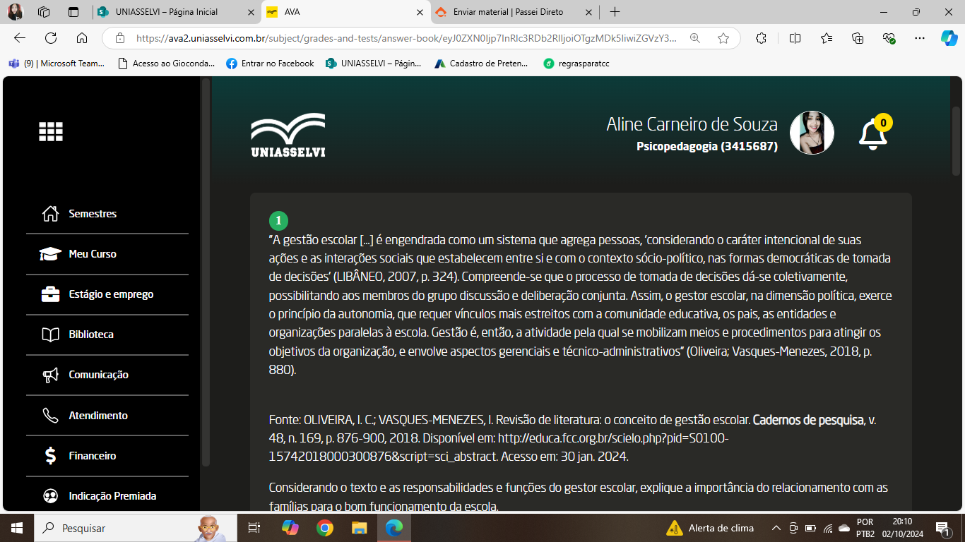 <p>UNIASSELVI - Página Inicial AVA Enviar material Passei Direto + (9) Microsoft Team.. Acesso ao Gioconda... Entrar no Facebook UNIASSELVI Págin.. Cadastro de Preten.. regrasparatco Aline Carneiro de Souza 0 Psicopedagogia (3415687) Semestres 1 "A gestão escolar [...] é engendrada como um sistema que agrega pessoas, caráter intencional de suas Meu Curso ações e as interações sociais que estabelecem entre si e com contexto sócio-político, nas formas democráticas de tomada de 2007, p. Compreende-se que processo de tomada de decisões dá-se coletivamente, Estágio e emprego possibilitando aos membros do grupo discussão e deliberação conjunta. Assim, 0 gestor escolar, na dimensão política, exerce princípio da autonomia, que requer vínculos mais estreitos com a comunidade educativa, os pais, as entidades e Biblioteca organizações paralelas à escola. Gestão é, então, a atividade pela qual se mobilizam meios e procedimentos para atingir os objetivos da organização, e envolve aspectos gerenciais e técnico-administrativos" Vasques-Menezes, 2018, p. Comunicação 880). Atendimento Fonte: OLIVEIRA, I. VASQUES-MENEZES, I. Revisão de literatura: conceito de gestão escolar. Cadernos de pesquisa, V. 48, n. 169, p. 876-900, 2018. Disponível em: $ Acesso em: 30 jan. 2024. Considerando texto e as responsabilidades e funções do gestor escolar, explique a importância do relacionamento com as Indicação Premiada famílias para bom funcionamento da escola POR 20:10 Pesquisar Alerta de clima PTB2 02/10/2024</p>