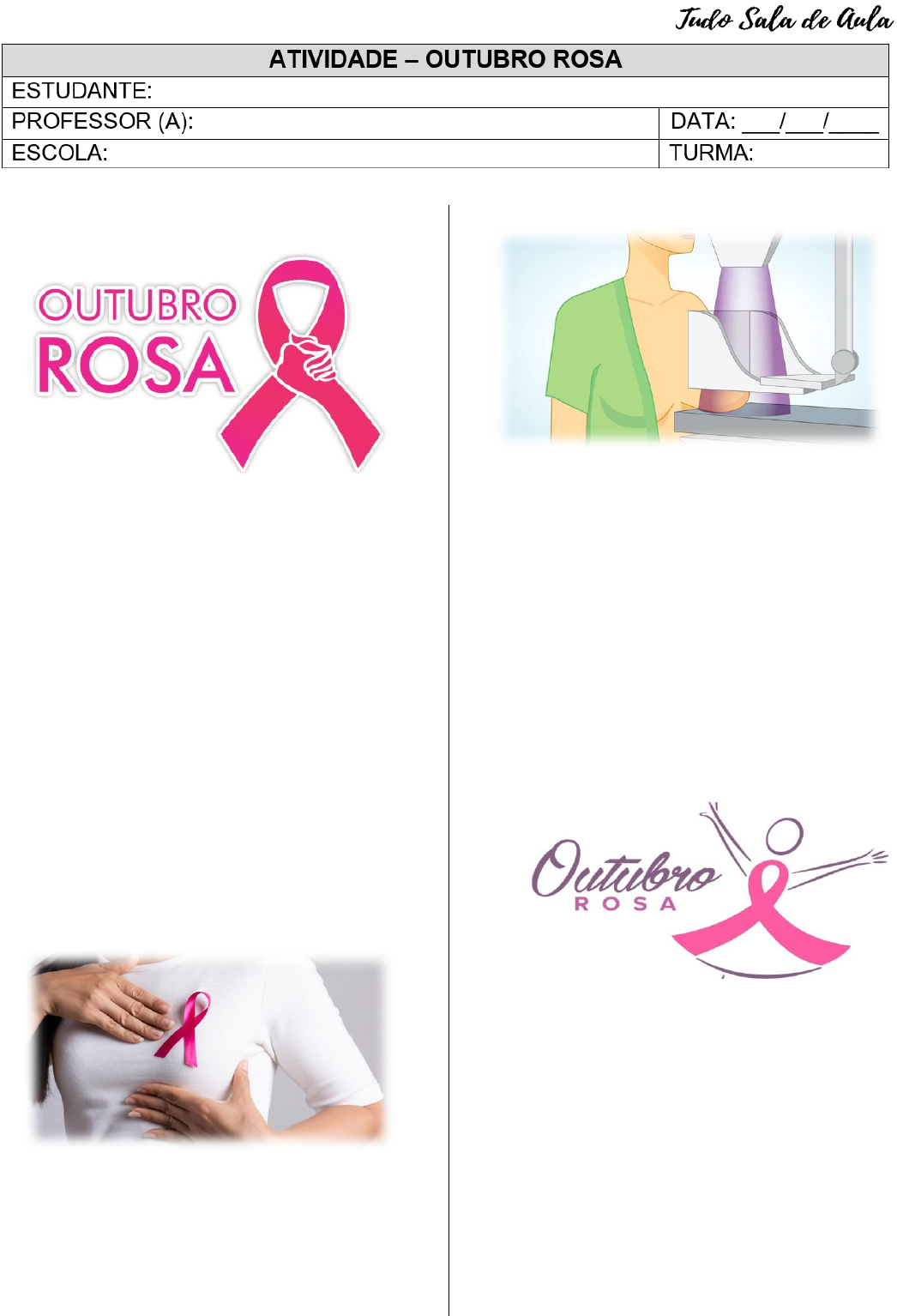 <p>TEMA: OUTUBRO ROSA</p><p>VOCÊ SABE O QUE É OUTUBRO ROSA?</p><p>Outubro Rosa é uma campanha anual realizada</p><p>mundialmente em outubro, com a intenção de</p><p>alertar a sociedade sobre o diagnóstico precoce</p><p>do câncer de mama. A mobilização visa também à</p><p>disseminação de dados preventivos e ressalta a</p><p>importância de olhar com atenção para a saúde,</p><p>além de lutar por direitos como o atendimento</p><p>médico e o suporte emocional, garantindo um</p><p>tratamento de qualidade.</p><p>Durante o mês, diversas instituições abordam o</p><p>tema para encorajar mulheres a realizarem seus</p><p>exames e muitas até os disponibilizam. Iniciativas</p><p>como essa são fundamentais para a prevenção,</p><p>visto que nos estágios iniciais, a doença é</p><p>assintomática.</p><p>SOBRE O CÂNCER DE MAMA</p><p>O câncer de mama é um tumor maligno que ataca</p><p>o tecido mamário e é um dos tipos mais comuns,</p><p>segundo o Instituto Nacional do Câncer – INCA.</p><p>Ele se desenvolve quando ocorre uma alteração</p><p>de apenas alguns trechos das moléculas de DNA,</p><p>causando uma multiplicação das células anormais</p><p>que geram o cisto.</p><p>A IMPORTÂNCIA DA MAMOGRAFIA</p><p>Segundo o Instituto Oncoguia, diagnosticar o</p><p>câncer precocemente aumenta significantemente</p><p>as chances de cura, 95% dos casos identificados</p><p>em estágio inicial têm possibilidade de cura. Por</p><p>isso, a mamografia é imprescindível, sendo o</p><p>principal método para o rastreamento da doença.</p><p>De acordo com a Sociedade Brasileira de</p><p>Mastologia (SBM) das 11,5 milhões de</p><p>mamografias que deveriam ter sido realizadas em</p><p>2020, apenas 2,7 milhões foram feitas. A</p><p>diminuição acentuada do exame é um fator de</p><p>risco para milhares de mulheres e um alerta para</p><p>a importância da campanha.</p><p>HISTÓRIA</p><p>O movimento teve início no ano de 1990 em um</p><p>evento chamado "Corrida pela cura" que</p><p>aconteceu em Nova Iorque, para arrecadar fundos</p><p>para a pesquisa realizada pela instituição Susan</p><p>G. Komen Breast Cancer Foundation. O evento</p><p>ocorria sem que houvessem instituições públicas</p><p>ou privadas envolvidas. A medida em que cresceu,</p><p>outubro foi instituído como o mês de</p><p>conscientização nacional nos Estados Unidos, até</p><p>se espalhar para o resto do mundo. A primeira</p><p>ação no Brasil aconteceu em 2002, no parque</p><p>Ibirapuera, em São Paulo. Com a iluminação cor-</p><p>de-rosa do Obelisco Mausoléu ao Soldado</p><p>Constitucionalista. A partir de 2008, iniciativas</p><p>como essa tornaram se cada vez mais frequentes.</p><p>Diversas entidades relacionadas ao câncer</p><p>passaram a iluminar prédios e monumentos,</p><p>transmitindo a mensagem: a prevenção é</p><p>necessária.</p><p>CONCLUSÃO</p><p>Portanto, o objetivo principal do Outubro Rosa é</p><p>atrair atenção para o câncer de mama, para a</p><p>importância do diagnóstico precoce e para o</p><p>tratamento adequado da doença. Incentivar as</p><p>pessoas que moram com você a ficarem sobre</p><p>alerta, certamente é uma boa oportunidade para</p><p>que essa doença não prejudique a sua família.</p><p>Fonte do texto: www.roche.com.br / Outubro</p><p>Rosa na Roche (Adaptado por Tudo Sala de Aula)</p><p>_______________________________________</p><p>ATIVIDADES SOBRE O QUE VOCÊ APRENDEU</p><p>1. A criação do Outubro Rosa teve como principal</p><p>objetivo:</p><p>a) incentivar o tratamento da doença pelo SUS.</p><p>b) estabelecer metas para o impedimento da</p><p>doença.</p><p>c) atrair a atenção das pessoas sobre o câncer de</p><p>mama.</p><p>d) impedir a manifestação do câncer nas</p><p>mulheres.</p><p>2. Sobre o surgimento do Outubro Rosa no Brasil,</p><p>é possível concluir que a sua fundação está</p><p>relacionada principalmente:</p><p>a) à cura do câncer.</p><p>b) à prevenção do câncer.</p><p>c) aos procedimentos cirúrgicos.</p><p>d) ao acompanhamento da doença.</p><p>3. Não está relacionada à campanha do Outubro</p><p>Rosa:</p><p>a) a informação.</p><p>b) a mobilização.</p><p>c) a publicidade.</p><p>d) a imprudência.</p><p>4. Segundo o texto, o que ocorre durante o</p><p>Outubro Rosa?</p><p>_______________________________________</p><p>_______________________________________</p><p>_______________________________________</p><p>5. O que é o câncer de mama?</p><p>_______________________________________</p><p>_______________________________________</p><p>_______________________________________</p><p>_______________________________________</p><p>6. Segundo o texto, diagnosticar o câncer</p><p>precocemente:</p><p>a) aumenta a possibilidade de atendimento</p><p>hospitalar.</p><p>b) diminui as oportunidades de cura da doença no</p><p>início.</p><p>c) é um método para erradicar essa doença no</p><p>Brasil.</p><p>d) amplia as oportunidades de recuperação da</p><p>doença.</p><p>7. De acordo com o texto, o que tem sido um fator</p><p>de risco para as mulheres brasileiras?</p><p>_______________________________________</p><p>_______________________________________</p><p>_______________________________________</p><p>8. Em que país surgiu a campanha de</p><p>conscientização do câncer de mama?</p><p>_______________________________________</p><p>_______________________________________</p><p>9. A primeira ação de conscientização do combate</p><p>ao câncer de mama no Brasil aconteceu em 2002,</p><p>no parque Ibirapuera, em São Paulo. Que</p><p>atividades foram desenvolvidas que visaram essa</p><p>conscientização?</p><p>_______________________________________</p><p>_______________________________________</p><p>_______________________________________</p><p>_______________________________________</p><p>10. Assinale a alternativa FALSA:</p><p>a) A informação é a melhor arma para o combate</p><p>ao câncer de mama.</p><p>b) Uma alimentação saud