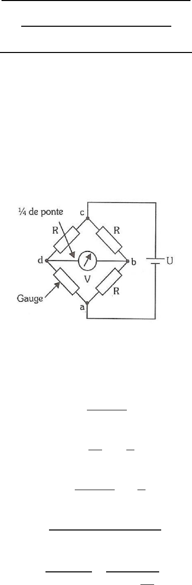 <p>UNIVERSIDADE FEDERAL DE LAVRAS</p><p>GAT121 – INSTRUMENTAÇÃO</p><p>RESOLUÇÃO DA LISTA DE EXERCÍCIOS</p><p>Prof. Felipe Oliveira e Silva</p><p>Medição de Força</p><p>1) Na configuração ¼ ponte, utiliza-se um strain-gauge alinhado na direção da força, dessa</p><p>forma:</p><p>𝑅𝑔𝑎𝑢𝑔𝑒 = 𝑅 + 𝛿𝑅</p><p>𝛿𝑉 = 𝑉𝑎𝑑 − 𝑉𝑎𝑏</p><p>𝑉𝑎𝑑 =</p><p>𝑅 + 𝛿𝑅</p><p>2𝑅 + 𝛿𝑅</p><p>𝑈</p><p>𝑉𝑎𝑏 =</p><p>𝑅</p><p>2𝑅</p><p>𝑈 =</p><p>𝑈</p><p>2</p><p>𝛿𝑉 =</p><p>𝑅 + 𝛿𝑅</p><p>2𝑅 + 𝛿𝑅</p><p>𝑈 −</p><p>𝑈</p><p>2</p><p>𝛿𝑉 = (</p><p>2(𝑅 + 𝛿𝑅) − (2𝑅 + 𝛿𝑅)</p><p>2(2𝑅 + 𝛿𝑅)</p><p>) 𝑈</p><p>𝛿𝑉 =</p><p>𝑈𝛿𝑅</p><p>4𝑅 + 2𝛿𝑅</p><p>=</p><p>𝑈</p><p>4 (𝑅 +</p><p>𝛿𝑅</p><p>2</p><p>)</p><p>𝛿𝑅</p><p>𝛿𝑉 =</p><p>𝑈𝐾</p><p>4 (1 + 𝐾</p><p>𝜀</p><p>2</p><p>)</p><p>𝜀 =</p><p>𝑈𝐾</p><p>4𝐸 (1 +</p><p>𝐾𝜎</p><p>𝐸2</p><p>)</p><p>𝜎 =</p><p>𝑈𝐾</p><p>4𝐸𝐴 (1 +</p><p>𝐾𝐹</p><p>𝐸𝐴2</p><p>)</p><p>𝐹</p><p>𝐹(𝛿𝑉) =</p><p>4𝐸𝐴</p><p>(𝑈 − 2𝛿𝑉)𝐾</p><p>𝛿𝑉</p><p>Na configuração ponte completa, são necessários quatro strain gauges, dois a dois em ramos</p><p>opostos da ponte, sendo um par na direção da aplicação da força, o outro na direção</p><p>perpendicular, acusando o efeito Poisson. Resulta em uma relação linear e com maior</p><p>sensibilidade,</p><p>𝑅𝑔𝑎𝑢𝑔𝑒1 = 𝑅 + 𝛿𝑅</p><p>𝑅𝑔𝑎𝑢𝑔𝑒2 = 𝑅 − 𝑣𝛿𝑅</p><p>𝑅𝑔𝑎𝑢𝑔𝑒3 = 𝑅 + 𝛿𝑅</p><p>𝑅𝑔𝑎𝑢𝑔𝑒4 = 𝑅 − 𝑣𝛿𝑅</p><p>𝛿𝑉 = 𝑉𝑎𝑑 − 𝑉𝑎𝑏</p><p>𝑉𝑎𝑑 =</p><p>𝑅 + 𝛿𝑅</p><p>2𝑅 + (1 − 𝑣)𝛿𝑅</p><p>𝑈</p><p>𝑉𝑎𝑏 =</p><p>𝑅 − 𝑣𝛿𝑅</p><p>2𝑅 + (1 − 𝑣)𝛿𝑅</p><p>𝑈</p><p>𝛿𝑉 = [</p><p>𝑅 + 𝛿𝑅 − 𝑅 + 𝑣𝛿𝑅</p><p>2𝑅 + (1 − 𝑣)𝛿𝑅</p><p>] 𝑈</p><p>𝛿𝑉 =</p><p>(1 + 𝑣)𝛿𝑅</p><p>2𝑅 + (1 − 𝑣)𝛿𝑅</p><p>𝑈</p><p>Fazendo 𝑣 = 1:</p><p>𝛿𝑉 =</p><p>2𝛿𝑅𝑈</p><p>2𝑅</p><p>= 𝑈𝐾𝜀 =</p><p>𝑈𝐾𝜎</p><p>𝐸</p><p>𝛿𝑉 =</p><p>𝑈𝐾</p><p>𝐸𝐴</p><p>𝐹</p><p>𝐹(𝛿𝑉) =</p><p>𝐸𝐴</p><p>𝑈𝐾</p><p>𝛿𝑉</p><p>2) Sendo uma solicitação de tração com configuração ¼ ponte, temos:</p><p>𝐹(𝛿𝑉) =</p><p>4𝐸𝐴</p><p>(𝑈 − 2𝛿𝑉)𝐾</p><p>𝛿𝑉</p><p>𝐴 =</p><p>𝐾𝐹(𝑈 − 2𝛿𝑉)</p><p>4𝐸𝛿𝑉</p><p>𝐴 = 1,09 ∗ 10−8 𝑚²</p><p>3) Sendo uma solicitação de tração com configuração ½ ponte, temos:</p><p>𝛿𝑉 =</p><p>𝑈𝐾𝐹</p><p>2𝐸𝐴</p><p>𝛿𝑉 =</p><p>12 ∗ 3,5 ∗ 10</p><p>2 ∗ 2,0685 ∗ 1011 ∗ 1,2 ∗ 10−5</p><p>𝛿𝑉 = 0,085 𝑚𝑉</p><p>4) Sendo uma solicitação de tração com configuração de ponte completa, temos:</p><p>𝛿𝑉 =</p><p>𝑈𝐾𝐹</p><p>𝐸𝐴</p><p>𝛿𝑉 = 2 ∗ 0,085 𝑚𝑉 = 0,170 𝑚𝑉</p><p>Observa-se que a configuração de ponte completa duplica a sensibilidade do conjunto.</p><p>5) Sendo uma solicitação de flexão com configuração de ponte completa, temos:</p><p>𝛿𝑉 =</p><p>𝑈𝐾𝜎𝑚𝑎𝑥</p><p>𝐸</p><p>𝛿𝑉 =</p><p>6𝑈𝐾𝐿𝐹</p><p>𝐸𝑎𝑏²</p><p>𝑏 = √</p><p>6𝑈𝐾𝐿𝐹</p><p>𝐸𝑎𝛿𝑉</p><p>𝑏 = √</p><p>6 ∗ 10 ∗ 2,0 ∗ 60 ∗ 100</p><p>9,6530 ∗ 1010 ∗ 2 ∗ 4,14 ∗ 10−3</p><p>𝑏 = 3 𝑐𝑚</p><p>6)</p><p>𝛿𝑉 =</p><p>𝑈𝐾𝜏𝑚𝑎𝑥</p><p>4𝐺</p><p>𝛿𝑉 =</p><p>𝑈𝐾</p><p>4𝐺</p><p>16</p><p>𝜋</p><p>𝑀𝑡</p><p>𝐷³</p><p>𝑀𝑡 =</p><p>𝐺𝜋 ∗ 𝐷3 ∗ 𝛿𝑉</p><p>4𝑈𝐾</p><p>𝑀𝑡 =</p><p>4,1370 ∗ 1010 ∗ 𝜋 ∗ (0,2)3 ∗ 0,04 ∗ 10−3</p><p>4 ∗ 15 ∗ 2</p><p>𝑀𝑡 = 346,58 𝑁𝑚</p>