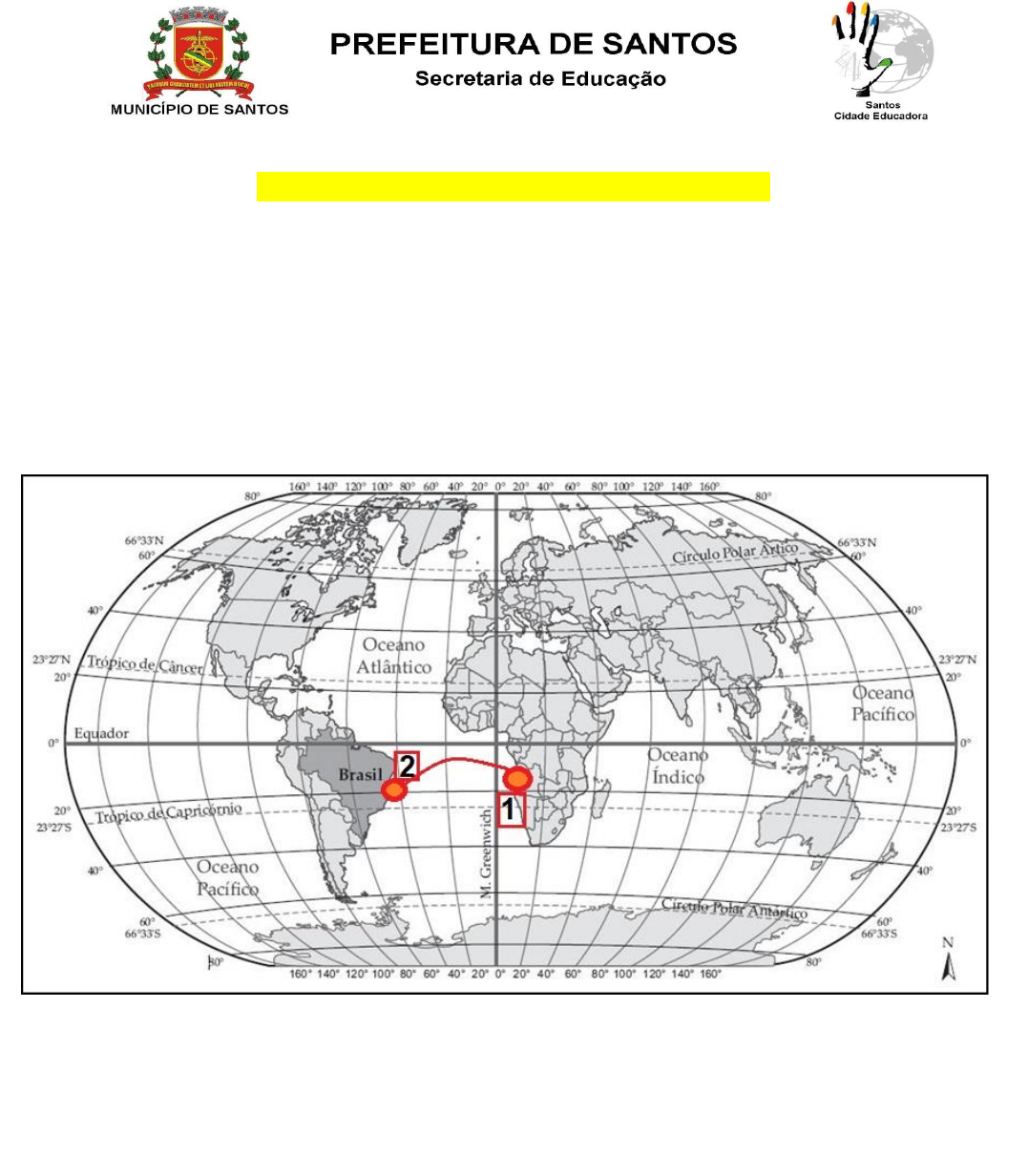 <p>UME CIDADE DE SANTOS</p><p>QUINZENA 3 – DE 06 A 17 DE JULHO</p><p>6º Ano – Geografia - Professoras: Simone</p><p>A travessia oceânica de Amyr Klink</p><p>Amyr Klink, um navegador brasileiro fez uma viagem em 1984,</p><p>cheia de aventuras. Cruzou o oceano Atlântico em um barco a remo,</p><p>entre a África e o Brasil. Depois de realizar essa viagem resolveu</p><p>escrever um livro sobre esses dias. O nome do livro é “Cem dias</p><p>entre o céu e o mar”.</p><p>No mapa abaixo você vê onde o navegador Amyr Klink percorreu.</p><p>Você sabe o que indicam os números 1 e 2 apontados no mapa</p><p>acima?</p><p>O número 1 indica o Local de onde o velejador saiu no dia 10</p><p>de junho de 1984 da cidade de Lüderitz na Namíbia, um país situado</p><p>no continente africano.</p><p>O número 2 indica o local em que o velejador chegou, no dia</p><p>18 de setembro de 1984, na cidade de Salvador na Bahia.</p><p>Amyr Klink foi o primeiro homem a completar, sozinho em um</p><p>barco a remo, a travessia do oceano Atlântico entre o continente</p><p>africano e Brasil.</p><p>Abaixo você observa o barco a remo em que o velejador</p><p>atravessou o oceano.</p><p>UME CIDADE DE SANTOS</p><p>No Globo Terrestre temos 6 linhas imaginárias importantes</p><p>como podemos observar no mapa a seguir. Tanto o continente</p><p>africano quanto o Brasil são cortados pela linha imaginária do</p><p>Equador e do Trópico de Capricórnio.</p><p>O velejador atravessou uma linha imaginária importante,</p><p>chamada de Greenwich. Essas três linhas encontram-se indicadas no</p><p>mapa abaixo.</p><p>Vamos rever a Rosa dos Ventos e os Pontos Cardeais?</p><p>A letra N significa Norte</p><p>A letra s significa Sul</p><p>A letra L significa Leste ou Oriente ou Nascente.</p><p>A letra O significa Oeste ou Poente.</p><p>Notamos então que o velejador viajou de Leste para Oeste, observe:</p><p>UME CIDADE DE SANTOS</p><p>Para fazer esta viagem, Amyr Klynk se</p><p>preparou muito e verificou como estaria as</p><p>condições do tempo para fazer tal travessia.</p><p>Vamos responder às questões agora?</p><p>1) Complete as cruzadinhas:</p><p>a) Continente de onde Amyr Klink saiu em 1984.</p><p>b) Linha imaginária que o velejador atravessou para completar seu</p><p>trajeto.</p><p>c) Linha imaginária que divide a Terra em dois hemisférios e que</p><p>corta tanto a África como o Brasil.</p><p>d) Cidade de chegada do velejador depois de 100 dias entre o céu</p><p>e o mar.</p><p>e) Ponto Cardeal Leste também é conhecido como.</p><p>2) Copie o esquema do Planeta Terra em seu caderno e trace o</p><p>trajeto percorrido por Amyr Klink, indicando a localização</p><p>do Brasil e do Continente Africano.</p><p>UME CIDADE DE SANTOS</p><p>3) Assinale Verdadeiro ou Falso para as frases a seguir, com</p><p>relação ao texto da aula de hoje.</p><p>a) O navegador Amyr Klink, um navegador norte-americano fez</p><p>uma viagem em 1984, cheia de aventuras.</p><p>( ) Verdadeiro ( ) Falso</p><p>b) Para completar seu trajeto, Amyr Klink atravessou uma</p><p>linha imaginária a linha imaginária de Greenwich.</p><p>( ) Verdadeiro ( ) Falso</p><p>c) O Brasil é cortado por duas linhas imaginarias: o Trópico</p><p>de Câncer e o Equador.</p><p>( ) Verdadeiro ( ) Falso</p><p>d) O velejador saiu da África com mais dois velejadores.</p><p>( ) Verdadeiro ( ) Falso</p><p>4) Desenhe a Rosa dos Ventos com os Pontos Cardeais.</p><p>5) Complete as lacunas:</p><p>a) No dia 10 de junho de 1984, o__________ Amyr Klink saiu</p><p>do país___________ em direção a _________ em um barco a</p><p>__________ em uma viagem que durou _____ dias.</p><p>b) A viagem de Klink foi do sentido _______ para _____ e</p><p>atravessou o oceano _________.</p><p>6) Copie o círculo que represente o Globo Terrestre como o es-</p><p>quema e indique os nomes das linhas imaginárias que cortam</p><p>nosso planeta.</p><p>Bom Trabalho!</p><p>Um Beijo!</p><p>Professora Simone</p>