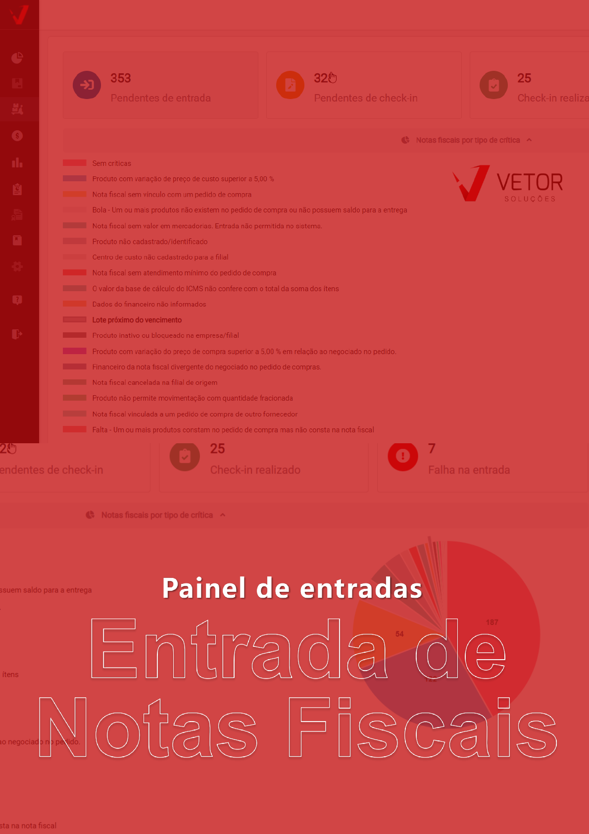<p>1</p><p>1</p><p>2</p><p>2 Treinamento EAD – Entrada de Notas Fiscais Vetor Web</p><p>SUMÁRIO</p><p>INTRODUÇÃO ....................................................................................................... 3</p><p>OBJETIVO ............................................................................................................. 3</p><p>VISUALIZAÇÃO DO CONTEÚDO ............................................................................ 3</p><p>CONHECENDO OS INDICADORES DO PAINEL DE ENTRADA .................................. 4</p><p>ENTRADA DE NOTA FISCAL .................................................................................. 8</p><p>CONSIDERAÇÕES FINAIS ..................................................................................... 40</p><p>3</p><p>3 Treinamento EAD – Entrada de Notas Fiscais Vetor Web</p><p>Introdução</p><p>Seja bem-vindo à plataforma de Cursos EAD da Vetor Soluções. Esta apostila é um material</p><p>de apoio ao Curso EAD – “Entrada de Notas Fiscais Vetor Web”.</p><p>O Curso EAD dispõe de um conjunto de materiais para apresentar todo o conteúdo. Além</p><p>desta apostila ilustrada, você terá acesso às videoaulas explicativas, otimizando o seu tempo e</p><p>facilitando o seu entendimento.</p><p>Ao término do curso você realizará uma avaliação sobre todo o conteúdo ensinado e deverá</p><p>alcançar média igual ou superior a 7,0 para emitir seu certificado de conclusão do curso.</p><p>O curso online ficará disponível por 15 dias, após o prazo o curso será expirado, sendo</p><p>necessário solicitar uma nova matrícula. Dessa forma é recomendável uma dedicação diária</p><p>mínima de 30 minutos para a conclusão no prazo determinado.</p><p>Objetivo</p><p>O objetivo final deste curso é capacitar todas as pessoas responsáveis por realizar a entrada</p><p>de notas fiscais na empresa. O usuário irá conferir de forma eficiente todas as etapas do processo</p><p>de entrada na solução Vetor Web.</p><p>Visualização do conteúdo</p><p>Para concluir o curso será necessário visualizar todos os conteúdos apresentados, bem</p><p>como responder à pesquisa de satisfação e fazer a avaliação final.</p><p>4</p><p>4 Treinamento EAD – Entrada de Notas Fiscais Vetor Web</p><p>Conhecendo os indicadores do Painel de entrada</p><p>Conheça através deste artigo os indicadores responsáveis por apresentar cada etapa do</p><p>processo de entrada de nota fiscal na solução Vetor Web.</p><p>Dica: Para facilitar seu entendimento clique sobre o indicador desejado, que você será</p><p>redirecionado ao tópico escolhido:</p><p>• Indicadores:</p><p>o Pendente de entrada</p><p>o Pendente de Check-In</p><p>o Check-In realizado</p><p>o Falha na entrada</p><p>o Botão: Notas ignoradas/rejeitadas</p><p>Acesso</p><p>1. Realize o login no sistema Vetor Web.</p><p>2. Acesse o menu lateral: Operação >> Entradas >> Painel de entradas.</p><p>Indicadores "Painel de entradas"</p><p>Ao abrir a tela por padrão os registros serão apresentados conforme a loja logada, mas</p><p>conforme a necessidade o usuário poderá utilizar o campo "Filial" para selecionar a loja que deseja</p><p>monitorar e/ou realizar a entrada do documento no sistema:</p><p>5</p><p>5 Treinamento EAD – Entrada de Notas Fiscais Vetor Web</p><p>Após selecionar a loja os registros serão apresentados conforme a filial selecionada.</p><p>Dica: Caso seja necessário clique sobre o ícone " " para atualizar as informações.</p><p>Pode-se observar que no topo da tela são apresentados os indicadores:</p><p>Cada indicador representa uma etapa do processo de entrada de nota fiscal, sendo exibida em</p><p>cada um a quantidade de documentos fiscais constantes. Acompanhe abaixo as etapas do</p><p>processo através dos seguintes indicadores:</p><p>• Pendentes de entrada: Este indicador exibirá todas as notas fiscais que ainda não tiveram a</p><p>sua entrada efetivada no sistema.</p><p>Dica: Para saber mais sobre as colunas dos indicadores, clique aqui.</p><p>• Pendentes de Check-In: Apresentará a quantidade de notas fiscais importadas da SEFAZ e</p><p>que ainda não tiveram a conferência dos produtos (Check-In de entrada) realizada, ou que</p><p>https://atendimento.vetorsolucoes.com.br/kb/article/212977/painel-de-entrada-detalhes-da-grade-dos-indicadores</p><p>https://s3.amazonaws.com/movidesk-files/CC0E308040EC0AF67B160DED25E6106F</p><p>6</p><p>6 Treinamento EAD – Entrada de Notas Fiscais Vetor Web</p><p>ainda estão com o processo de check-in em andamento Ainda não sabe realizar o Check-In</p><p>dos itens?. Clique aqui e aprenda.</p><p>• Check-In realizado: Exibirá as notas fiscais que tiveram seu Check-In finalizado, mas que</p><p>ainda não tiveram a sua entrada concluída.</p><p>• Falhas na entrada: Exibirá as notas com falhas no processamento de entrada automática</p><p>ou que necessitam de alguma ação do usuário para efetivar a entrada.</p><p>• Botão: Notas ignoradas/rejeitadas: Apresentará as notas fiscais emitidas nos últimos</p><p>90 (noventa) dias e que foram ignoradas por algum motivo, a fim de que o usuário possa</p><p>recuperá-las para uma nova tentativa de entrada.</p><p>Atenção: Apenas serão apresentadas as notas fiscais cujo prazo de emissão não extrapolou os</p><p>últimos 90 (noventa) dias.</p><p>Dicas:</p><p>1. A seção "Notas fiscais por tipo de crítica" será apresentada quando forem identificadas críticas e/ou</p><p>advertência para o indicador.</p><p>Por meio dela será possível consultar e identificar os registros segundo as legendas de cores</p><p>destacadas conforme as críticas exibidas ao lado esquerdo, e/ou conforme o gráfico de</p><p>cores ao lado direito. Para isso selecione uma legenda de cor ou área do gráfico, que o</p><p>sistema apresentará abaixo os resultados encontrados, assim o usuário responsável poderá</p><p>identificar todas as notas fiscais que possuem o mesmo problema 