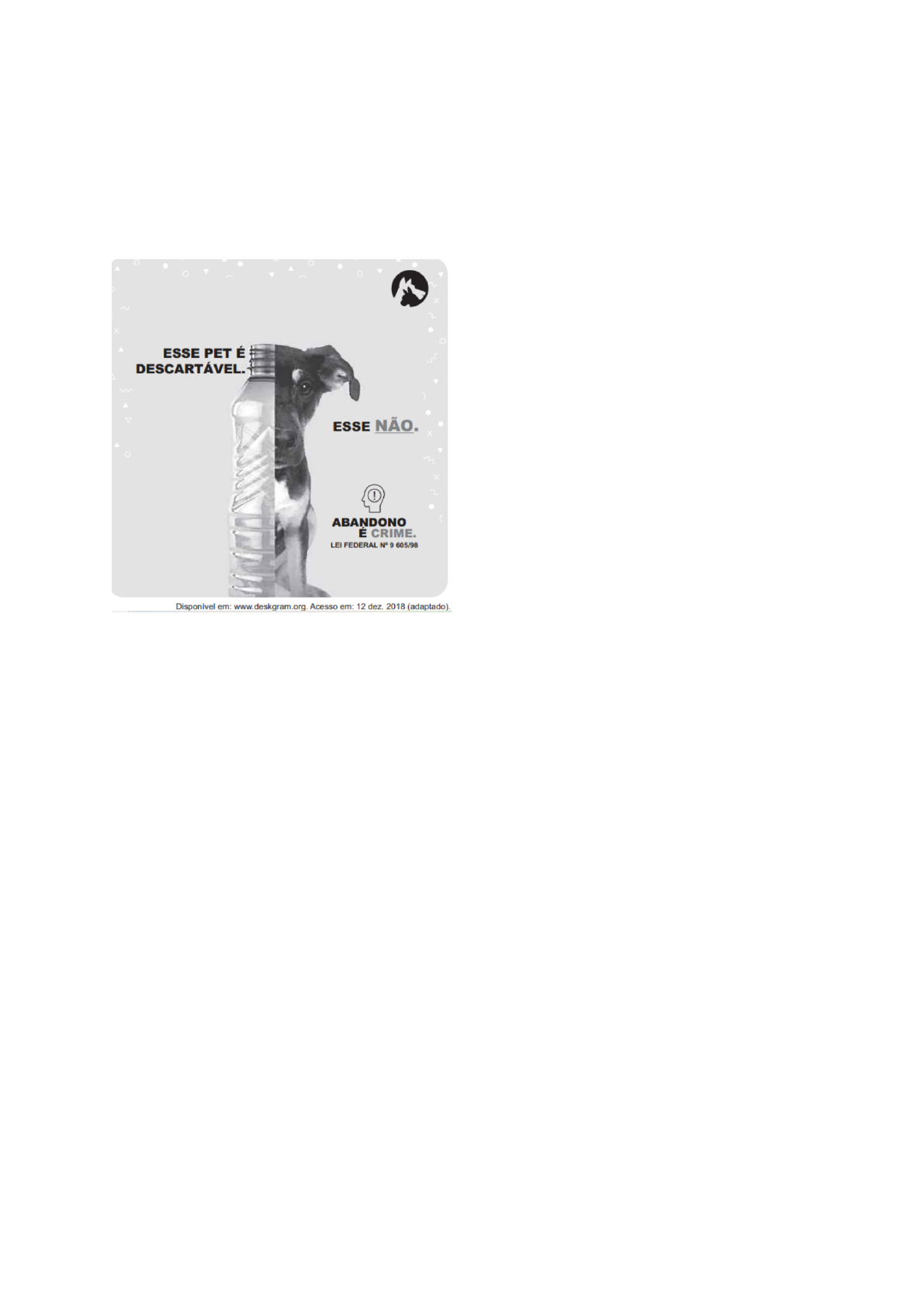 <p>LINGUAGENS, CÓDIGOS E SUAS TECNOLOGIAS</p><p>(LÍNGUA PORTUGUESA - 30 QUESTÕES)</p><p>QUESTÃO 01 (ENEM 2021)</p><p>A associação entre o texto verbal e as imagens da garrafa e do cão configura recurso</p><p>expressivo que busca:</p><p>A. estimular denúncias de maus-tratos contra animais.</p><p>B. desvincular o conceito de descarte da ideia de negligência.</p><p>C. incentivar campanhas de adoção de animais em situação de rua.</p><p>D. sensibilizar o público em relação ao abandono de animais domésticos.</p><p>E. alertar a população sobre as sanções legais acerca de uma prática criminosa.</p><p>QUESTÃO 02 (ENEM 2019)</p><p>O efeito estufa não é um fenômeno recente e, muito menos, naturalmente maléfico. Alguns</p><p>dos gases que o provocam funcionam como uma capa protetora que impede a dispersão</p><p>total do calor e garante o equilíbrio da temperatura na Terra. Cientistas americanos da</p><p>Universidade da Virgínia alegam ter descoberto um dos primeiros registros da ação humana</p><p>sobre o efeito estufa. Há oito mil anos, houve uma súbita elevação da quantidade de CO2 na</p><p>atmosfera terrestre. Nesse mesmo período, agricultores da Europa e da China já</p><p>dominavam o fogo e haviam domesticado cães e ovelhas. A atividade humana da época</p><p>com maior impacto sobre a organização social e sobre o ambiente foi o começo do plantio</p><p>de trigo, cevada, ervilha e outros vegetais. Esse plantio passou a exigir áreas de terreno</p><p>livre de sua vegetação original, providenciadas pelos inúmeros grupos humanos nessas</p><p>regiões com métodos elementares de preparo do solo, ainda hoje, usados e condenados,</p><p>em razão dos problemas ambientais decorrentes.</p><p>Aquecimento global e a nova geografia de produção no Brasil.</p><p>Disponível em: .</p><p>Acesso em: 23 jun. 2009. (Com adaptações).</p><p>Segundo a hipótese levantada pela pesquisa sobre as primeiras atividades humanas</p><p>organizadas, o impacto ambiental mencionado foi decorrente</p><p>A. da manipulação de alimentos cujo cozimento e consumo liberavam grandes</p><p>quantidades de calor e gás carbônico.</p><p>B. da queima ou da deterioração das árvores derrubadas para o plantio, que</p><p>contribuíram para a liberação de gás carbônico e poluentes em proporções</p><p>significativas.</p><p>C. do início da domesticação de animais no período mencionado, a qual contribuiu para</p><p>uma forte elevação das emissões de gás metano.</p><p>D. da derrubada de árvores para a fabricação de casas e móveis, que representou o</p><p>principal fator de liberação de gás carbônico na atmosfera naquele período.</p><p>E. do incremento na fabricação de cerâmicas que, naquele período, contribuiu para a</p><p>liberação de material particulado na atmosfera.</p><p>QUESTÃO 03 (BASEADA NO ENEM DE 2016)</p><p>Mandinga — Esse era o nome do qual muitos portugueses chegaram a chamar uma parte</p><p>que fazia parte da costa ocidental da África. Muitos estudantes, hoje em dia, acabam se</p><p>perguntando qual teria sido o significado deste nome.</p><p>De acordo com especialistas e historiadores, o termo mandinga teria surgido após os</p><p>europeus acreditarem que era por ali que viviam os bruxos e amaldiçoados. No entanto,</p><p>algo atrativo poderia fazer parte de toda a maldição que ali poderia existir: o ouro. Ele está</p><p>em volta de muitos africanos e que muitas vezes acaba servindo como moeda de troca. No</p><p>dicionário nativo, essa palavra teria se tornado como se fosse um sinônimo de feiticeiro e</p><p>feitiçaria.</p><p>Neste texto que está localizado logo acima pode-se dizer que o termo mandinga teria</p><p>surgido através de:</p><p>A. contexto sócio-histórico.</p><p>B. diversidade técnica.</p><p>C. descoberta geográfica.</p><p>D. apropriação religiosa.</p><p>E. contraste cultural.</p><p>QUESTÃO 04 (ENEM 2010)</p><p>Câncer 21/06 a 21/07</p><p>O eclipse em seu signo vai desencadear mudanças na sua autoestima e no seu modo de</p><p>agir. O corpo indicará onde você falha – se anda engolindo sapos, a área gástrica se</p><p>ressentirá. O que ficou guardado virá à tona, pois este novo ciclo exige uma</p><p>“desintoxicação”. Seja comedida em suas ações, já que precisará de energia para se</p><p>recompor. Há preocupação com a família, e a comunicação entre os irmãos trava.</p><p>Lembre-se: palavra preciosa é palavra dita na hora certa. Isso ajuda também na vida</p><p>amorosa, que será testada. Melhor conter as expectativas e ter calma, avaliando as próprias</p><p>carências de modo maduro. Sentirá vontade de olhar além das questões materiais – sua</p><p>confiança virá da intimidade com os assuntos da alma.</p><p>Revista Cláudia. Nº 7, ano 48, jul. 2009.</p><p>O reconhecimento dos diferentes gêneros textuais, seu contexto de uso, sua função</p><p>específica, seu objetivo comunicativo e seu formato mais comum relacionam-se com os</p><p>conhecimentos construídos socioculturalmente. A análise dos elementos constitutivos desse</p><p>texto demonstra que sua função é:</p><p>A. vender um produto anunciado.</p><p>B. informar sobre astronomia.</p><p>C. ensinar os cuidados com a saúde.</p><p>D. expor a opinião de leitores em um jornal.</p><p>E. aconselhar sobre amor, família, saúde, trabalho.</p><p>QUESTÃO 05 (ENEM 2020)</p><p>Essa campanha de conscientização sobre o assédio sofrido pelas mulheres nas ruas</p><p>constrói-se pela combinação da linguagem verbal e não verbal. A imagem da mulher com o</p><p>nariz e a boca cobertos por um lenço é a representação não verbal do(a)</p><p>A. silêncio imposto às mulheres, que não podem denunciar o assédio sofrido.</p><p>B. metáfora de que as mulheres precisam defender-se do assédio masculino.</p><p>C. incapacidade de as mulheres protegerem-se da agressão verbal dos assediadores.</p><p>D. constrangimento pelo qual passam as mulheres e sua