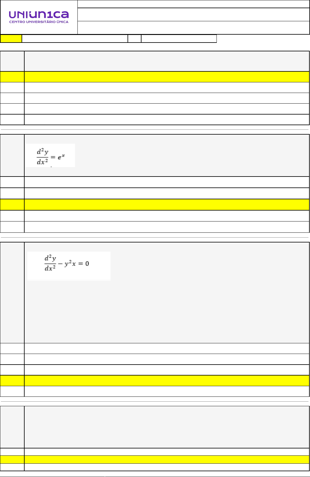 <p>02/10/2024 22:07:07 1/3</p><p>REVISÃO DE SIMULADO</p><p>Nome:</p><p>MARCOS AURÉLIO COIMBRA SALES</p><p>Disciplina:</p><p>Cálculo III</p><p>Respostas corretas são marcadas em amarelo X Respostas marcardas por você.</p><p>Questão</p><p>001 As raízes da equação característica (2α+2) y''+(4 - 4α) y'-(α - 2)y=0 e K1+K2=2 ,</p><p>K1.K2=1;</p><p>X A) -1 e 1</p><p>B) -1 e -2</p><p>C) 0 e 2</p><p>D) 3 e 4</p><p>E) 2 e 6</p><p>Questão</p><p>002 Analise a equação abaixo:</p><p>Qual é o conjunto das soluções gerais que satisfaz a equação dada?</p><p>A) y(x) = ex + 2.K+x</p><p>B) y(x) = ex</p><p>X C) y(x) = ex + Kx</p><p>D) y(x) = e-x + k</p><p>E) y(x) = ex + x</p><p>Questão</p><p>003 Analise a expressão abaixo:</p><p>De acordo com a expressão dada, avalie as afirmativas abaixo:</p><p>I. A expressão dada representa uma equação diferencial de segunda ordem.</p><p>II. O conjunto das soluções para a expressão representada pode ser dado por</p><p>y(x)=A.sen(xt)+B.cosâÂ�¡(xt), onde A e B são constantes quaisquer.</p><p>III. Obter uma única solução para a expressão dada é o mesmo que obter todo o</p><p>conjunto de soluções.</p><p>É correto o que se afirma em</p><p>A) I e III, apenas.</p><p>B) II, apenas.</p><p>C) I e II, apenas.</p><p>D) I, apenas.</p><p>X E) III, apenas.</p><p>Questão</p><p>004 Analise a expressão abaixo:</p><p>y(x)= Ae −kx</p><p>Supondo a diferenciabilidade da expressão dada, podemos dizer que se trata do</p><p>conjunto solução de</p><p>A) y”(x) = -3y(x)</p><p>X B) y”(x) = k2y(x)</p><p>C) y”(x) = 0</p><p>02/10/2024 22:07:07 2/3</p><p>D) y”(x) = ky(x)</p><p>E) y”(x) = -y(x)</p><p>Questão</p><p>005 A solução particular da equação 4y''+4y'+y=0, quando y(0)=2 e y' (0)=8</p><p>A) e3x (2x+2)</p><p>X B) ex (2x+2)</p><p>C) e3x</p><p>D) ex</p><p>E) e3x (x+1)</p><p>Questão</p><p>006 A transformada de Laplace da função: f(x)=2senx+3 cosâ�¡2x é:</p><p>A)</p><p>B)</p><p>C)</p><p>X D)</p><p>E)</p><p>Questão</p><p>007 Analise a equação abaixo:</p><p>A solução geral para e equação é</p><p>A)</p><p>X B)</p><p>C)</p><p>D)</p><p>E)</p><p>Questão</p><p>008 Analise a expressão dada abaixo:</p><p>Representa uma</p><p>A) equação linear de primeira ordem.</p><p>X B) equação diferencial de segunda ordem.</p><p>02/10/2024 22:07:07 3/3</p><p>C) equação diferencial de ordem n.</p><p>D) equação diferencial de primeira ordem.</p><p>E) equação transcendental de primeira ordem.</p>