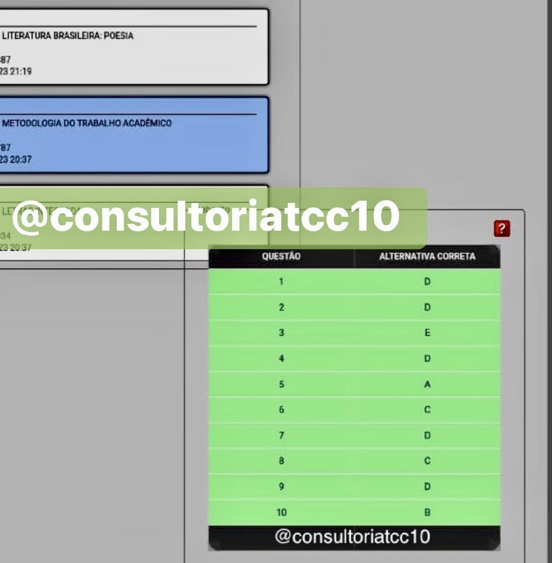<p>LITERATURA BRASILEIRA: POESIA 87 METODOLOGIA DO TRABALHO 87 20:37 LE7 @consultoriatcc10 ? 34 23 20:37 QUESTÃO ALTERNATIVA CORRETA 1 D 2 D 3 E 4 D 5 A 6 C 7 D 8 C 9 D 10 B @consultoriatcc10</p><p>Questões de múltipla escolha Disciplina: 538730 METODOLOGIA DO TRABALHO ACADÊMICO Questão 1: Em seu trabalho, o aluno Bastos Ferreira incluiu a citação a seguir: "Em relação à teoria politica, qual a natureza do Estado moderno segundo o Novo Desenvolvimentismo? Nos ricos, ele começou transformou-se no Estado liberal e no Estado liberal-democrático, à medida que seus povos conquistavam direito ao sufrágio Um pouco com a pressão popular por menor mudou novamente, transformando-se no Estado social" Segundo a norma ABNT: A) texto e a ideia são de autoria de Bastos Ferreira, autor citado por Bresser-Pereira B) Apenas a ideia é de sendo texto de autoria de Bastos C) Apenas o texto é de sendo a ideia de autoria de Bastos D) texto e a ideia são de Bresser-Pereira, autor citado por Bastos E) Segundo as normas disponibilizadas pela não há como identificar autor da ideia, tampouco do texto citado por Bastos Questão 2: No texto abaixo, a ABNT (Associação Brasileira de Normas Técnicas) explica processos de elaboração de normas técnicas. o processo de elaboração de um Documento Técnico ABNT é iniciado a partir de uma que pode ser apresentada por qualquer pessoa, empresa, entidade ou organismo que estejam envolvidos com @consultoriatcc10 assunto a ser A pertinência da demanda é analisada pela ABNT sendo assunto é levado ao Comitê Técnico correspondente para inserção em seu Programa de Normalização Setorial (PNS). Caso não exista Técnico relacionado ao assunto, a ABNT propõe a criação de um novo que pode ser um Brasileiro um Organismo de Normalização Setorial (ABNT/ONS) ou uma Comissão de Estudo Especial assunto é discutido amplamente pelas Comissões de Estudo, com a participação aberta a qualquer independentemente de ser ou não associado à ABNT, até atingir gerando então um Projeto de Norma em: 3 Quando do contexto do trabalho e com base no texto acima, podemos afirmar que: As regras da ABNT para a elaboração de trabalhos acadêmicos existem em função de demandas existentes na comunidade em relação às formas de realização e publicação de textos acadêmicos. As regras da ABNT para a realização e publicação de textos acadêmicos são fruto de debates e consultas à comunidade de forma geral, e são definidas a partir do consenso entre os III. As regras para a inclusão de normas a respeito do trabalho acadêmico são bastando que, para sua vigência, seja realizado um requerimento formal a qualquer instituição ou organismo de normalização. correto apenas o que se afirma em: A) B) C) III. @consultoriatcc10 D) E) Questão 3: Leia texto a seguir: São cada vez mais comuns a desconfiança e o desprezo pelo pensamento cientifico. A proliferação de teorias conspiratórias e o negacionismo em relação a temas como a eficiência das vacinas, a origem do a forma da Terra, a evolução das espécies ou o aquecimento global são exemplos de como, em alguns grupos, as crenças e pessoais passam a ter mais importância que as evidências apresentadas pelos o recente movimento global "anticiência" tenta colocar a ciência em A ciência também é vitima das fake informações falsas divulgadas como se fossem falsas sempre Mas com a elas passaram a ser uma ritmo e escala nunca antes visto. Plataformas como Twitter e WhatsApp favorecem a replicação de boatos e Disponível Acesso em: 3 ago. Segundo texto: As plataformas digitais sido responsáveis pela desmistificação da ciência e da comunidade cientifica, movimento que enriquece debate com novas evidências e com a defesa de novos protagonistas no desenvolvimento de A pressão de determinados grupos sociais tem agido no sentido de desacreditar a ciência, ignorando evidências e resultados aceitos de forma consensual pela comunidade III. As plataformas digitais têm sido utilizadas pelos grupos que pretendem desacreditar a ciência, funcionando como veículo para a disseminação de boatos e Está correto apenas que se afirma em: A) III. B) C) D) @consultoriatcc10 E)</p><p>Questão tests Publicado no em 14 de fevereiro de 2017 A Rede de Pesquisa Empirica em Direito (REED) associação civil que pesquisadoras # pesquisadores em de todo o de seu dever de promover as melhores em diante debate público recente sobre uso de de decisões não protegidos por direito autoral a manifestar nos seguintes termos 1. A integral dos na pesquisa redação cientificas e fundamental à qualidade reputação da academia Alunas alunos de direito de aprendem 01 da em cursos de graduação e tendo dever de plágio uma violação de o uso de # trases de terceiros deve indicado com precisão na parte textual de um indispensável para que leitor possa distinguir o pensamento do autor do texto que venha de outras A entrada lista de não supre este o autor da forma de expressão da ideia alheia imperioso que assim indique por meio de pelo alargamento da margem a depender da do trecho not termos da Norma Brasileira de Referência (NBR) da Associação Brasileira de Normas (ABNT) Tal largamente conhecida facilmente em de todo 4 Enquanto violação não se restringe às que tambéen possa ser como violação ao direito autoral na quer criminal indevidamente do tests de quaisquer registros tais como decisões judiciais ou documentos configura mesmo quando constitua violação ao direito autoral Trata se de prática ao confundir pela ou com objeto de $ Deve-se reconhecer que organização do trabalho atualmente vigente na redação na prática do direito gerando condições disseminação do mas essa realidade não autoriza sua que deve ser combatida por todos profissionais o em face da autora ou do autor do texto por deixar de reconhecer the trabalho E eticamente em face do por the do de saber com precisão a autoria daqui