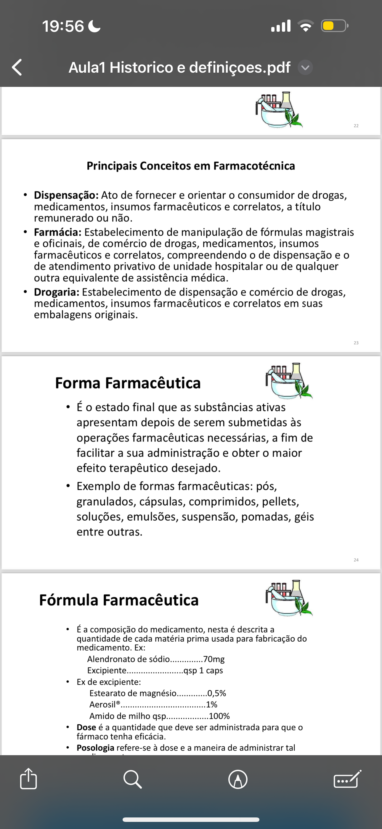 <p>19:56 C Aula1 Historico e definiçoes.pdf 22 Principais Conceitos em Farmacotécnica Dispensação: Ato de fornecer e orientar o consumidor de drogas, medicamentos, insumos farmacêuticos e correlatos, a título remunerado ou não. Farmácia: Estabelecimento de manipulação de fórmulas magistrais e oficinais, de comércio de drogas, medicamentos, insumos farmacêuticos e correlatos, compreendendo o de dispensação e o de atendimento privativo de unidade hospitalar ou de qualquer outra equivalente de assistência médica. Drogaria: Estabelecimento de dispensação e comércio de drogas, medicamentos, insumos farmacêuticos e correlatos em suas embalagens originais. 23 Forma Farmacêutica É o estado final que as substâncias ativas apresentam depois de serem submetidas às operações farmacêuticas necessárias, a fim de facilitar a sua administração e obter o maior efeito terapêutico desejado. Exemplo de formas farmacêuticas: pós, granulados, cápsulas, comprimidos, pellets, soluções, emulsões, suspensão, pomadas, géis entre outras. 24 Fórmula Farmacêutica É a composição do medicamento, nesta é descrita a quantidade de cada matéria prima usada para fabricação do medicamento. Ex: Alendronato de sódio 70mg Excipiente qsp 1 caps Ex de excipiente: Estearato de magnésio 0,5% 1% Amido de milho qsp 100% Dose é a quantidade que deve ser administrada para que o fármaco tenha eficácia. Posologia refere-se à dose e a maneira de administrar tal A</p>