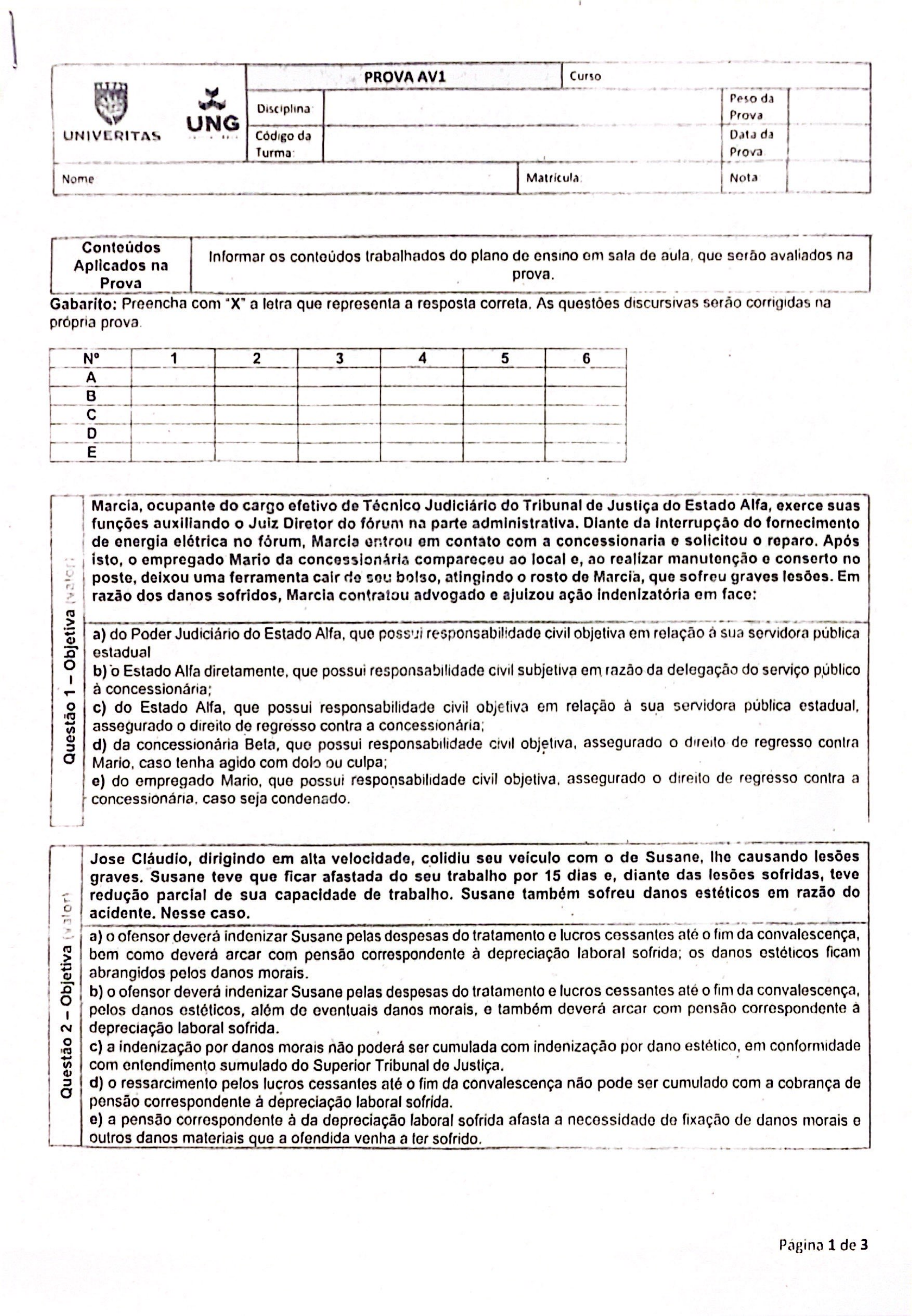 <p>PROVA AV1 Curso Peso da Disciplina Prova UNG UNIVERITAS Código da Data da Turma: Prova Nome Nota Conteúdos Informar os conteúdos trabalhados do plano de ensino em sala de aula. que serão avaliados na Aplicados na prova. Prova Gabarito: Preencha com "X" a letra que representa a resposta correta, As questões discursivas serão corrigidas na própria prova. N° 1 2 3 4 5 6 A B C D E Marcia, ocupante do cargo efetivo de Técnico Judiciário do Tribunal de Justiça do Estado Alfa, exerce suas funções auxiliando o Juiz Diretor do fórum na parte administrativa. Diante da do fornecimento de energia elétrica no fórum, Marcia em contato com a concessionaria e solicitou o reparo. Após isto, o empregado Mario da compareceu ao local e, ao realizar manutenção e conserto no poste, deixou uma ferramenta cair de bolso, atingindo o rosto de Marcia, que sofreu graves lesões. Em razão dos danos sofridos, Marcia contratou advogado e ajuizou ação indenizatória em face: a) do Poder Judiciário do Estado Alfa, que possui responsabilidade civil objetiva em relação à sua servidora pública estadual b) o Estado Alfa diretamente, que possui responsabilidade civil subjetiva em razão da delegação do serviço público à c) do Estado Alfa, que possui responsabilidade civil objetiva em relação à sua servidora pública estadual, assegurado o direito de regresso contra a d) da concessionária que possui responsabilidade civil objetiva, assegurado o direito de regresso contra Mario, caso tenha agido com dolo culpa; e) do empregado Mario, que possui responsabilidade civil assegurado o direito de regresso contra a caso seja condenado. Jose Cláudio, dirigindo em alta velocidade, colidiu seu veículo com o de Susane, lhe causando lesões graves. Susane teve que ficar afastada do seu trabalho por 15 dias e, diante das lesões sofridas, teve redução parcial de sua capacidade de trabalho. Susane também sofreu danos estéticos em razão do Nesse caso. a) o ofensor deverá indenizar Susane pelas despesas do tratamento e lucros cessantes até o fim da convalescença, bem como deverá arcar com pensão correspondente à depreciação laboral sofrida; os danos estéticos ficam abrangidos pelos danos morais. b) o ofensor deverá indenizar Susane pelas despesas do tratamento e lucros cessantes até o fim da convalescença, pelos danos estéticos, além de eventuais danos morais, e também deverá arcar com pensão correspondente depreciação laboral sofrida. c) a indenização por danos morais não poderá ser cumulada com indenização por dano estético, em conformidade com entendimento sumulado do Superior Tribunal de Justiça. d) o ressarcimento pelos lucros cessantes até o fim da convalescença não pode ser cumulado com a cobrança de pensão correspondente à depreciação laboral sofrida. e) a pensão correspondente à da depreciação laboral sofrida afasta a necessidade de fixação de danos morais e outros danos materiais que a ofendida venha a ter sofrido. Página 1 de 3</p><p>Antônio Carlos, casado e pai de três filhas, submeteu-se a uma cirurgia ortopédica em hospital particular. Alguns dias depois de receber alta, Antônio Carlos passou a sentir dores, foi internado com urgência e veio a falecer. Diante deste contexto, os médicos informaram à família que a causa da morte estava relacionada a um Acidente Vascular Cerebral (AVC). Ademais, disseram eles ainda, que, embora tivessem detectado um erro cometido pelos médicos durante a cirurgia de Antônio Carlos, tal erro, não foi o suficiente para provocar sua morte. Diante desta informação, a esposa e as filhas de Antônio Carlos intentaram ação judicial objetivando haver indenização por danos morais em face dos cirurgiões que o operaram. Sublinhe- se que no bojo deste processo restou confirmada, por perícia, a informação de que a causa da morte de Antônio Carlos era o AVC e não o erro médico advindo da cirurgia. Neste caso: a) é correto afirmar que o pedido deve ser julgado improcedente, pois os danos morais sofridos em razão da perda do ente querido não são indenizáveis no Brasil. b) procedente, visto que objetiva a responsabilidade dos réus quanto aos danos morais sofridos pelos entes próximos. c)procedente, ante a verificação, para o evento de culpa concorrente entre o médico e paciente. d) procedente, porque comprovada a culpa dos réus, que respondem pelos danos à saúde psicofísica do paciente. e) improcedente, pois a causa da morte de Antônio Carlos vinculou-se a um AVC e não ao erro cometido pelos médicos, apesar dele ter havido. Quem sofre um dano causado por outrem tem o direito de provocar a jurisdição para buscar uma reparação civil. Nesta linha, há o dever de indenizar sempre que houver dano? a) Não. Existem situações que embora haja o dano, ele não é indenizado. Essas situações são chamadas de excludentes do dever de b) Nesse cenário, só não há o dever de indenizar pela legítima defesa c) Nesse só não há o'dever de indenizar pelo estado de necessidade d) só não há o dever de indenizar pelo exercício regular do direito ou das próprias funções e cláusula de não indenizar. e) Sim, deve indenizar sempre que o dano ocorre, Quais são os elementos essenciais da responsabilidade civil? a) conduta ou ato humano sem o nexo de causalidade; b) ou ato humano, dano c) conduta ou ato humano, nexo de causalidade e o dano d) nexo de causalidade e dano e) todas alternativas estão corretas Pedro, dezessete anos de idade, mora com'seus pais no edifício Clareira do Bosque, em certa manhã ele se desentendeu com seu vizinho Manoel, de dezoito anos. o desentendimento ocorreu logo após Manoel, por do porteiro, ter recebido e lido a revista pertencente aos pais do adolescente. Manoel, percebido o equivoco, promoveu a imediata devolução do periódico, momento no qual foi surpreendido com atitude inesperada de Pedro, que revoltado com o desalinho das páginas da revista, o agrediu