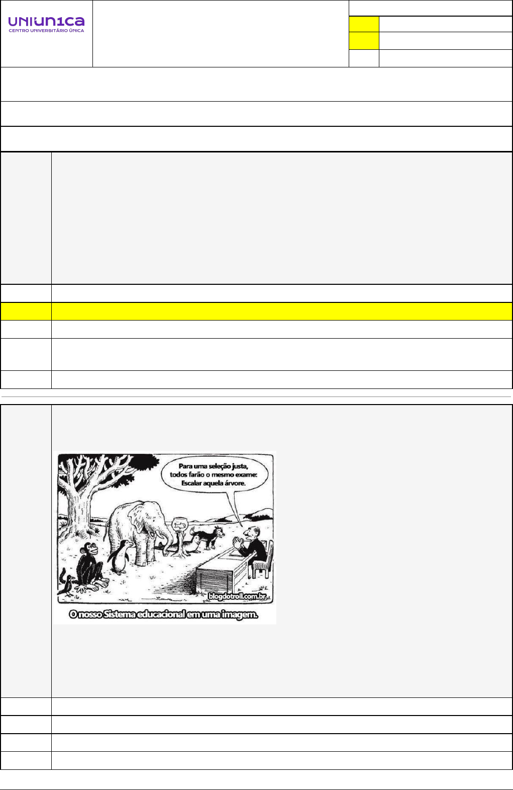 <p>Pincel Atômico - 03/10/2024 05:48:10 1/3</p><p>GESMAELLY NAARA</p><p>OLIVEIRA SILVA</p><p>Avaliação Online (SALA EAD) - Capitulos/Referencias 4,5,6</p><p>Atividade finalizada em 02/10/2024 19:26:07 (2702676 / 1)</p><p>LEGENDA</p><p>Resposta correta na questão</p><p># Resposta correta - Questão Anulada</p><p>X Resposta selecionada pelo Aluno</p><p>Disciplina:</p><p>FUNDAMENTOS E METODOLOGIA DO ENSINO DA MATEMÁTICA [1025511] - Avaliação com 5 questões, com o peso total de 15,00 pontos</p><p>[capítulos - 4,5,6]</p><p>Turma:</p><p>Segunda Graduação: Pedagogia para Licenciados - Grupo: ABRIL/2024 - SGPLIC/ABRIL24 [112588]</p><p>Aluno(a):</p><p>91474615 - GESMAELLY NAARA OLIVEIRA SILVA - Respondeu 5 questões corretas, obtendo um total de 15,00 pontos como nota</p><p>[355874_675</p><p>90]</p><p>Questão</p><p>001</p><p>Mabel Panizza, em Ensinar matemática na educação infantil e nas séries iniciais:</p><p>análise e propostas, mostra que, a uma longa tradição escolar que propunha aos</p><p>alunos grandes quantidades de contas, seguiu-se uma nova corrente baseada na</p><p>resolução de problemas. A autora traz o seguinte problema de adição: “Nesta caixa</p><p>tenho 3 bolinhas e nesta outra, 42. Quantas bolinhas tenho ao todo? ”. Para resolvê-</p><p>lo, trata-se de encontrar a operação numérica adequada e calcular a soma. Conforme</p><p>a autora, quando a professora intervém na escolha da operação adequada,</p><p>respondendo afirmativamente a pergunta tão conhecida: “O sinal é de mais? ”, pode-</p><p>se dizer que</p><p>isso auxilia as crianças em seu desenvolvimento matemático.</p><p>X as crianças resolvem a conta, mas não o problema.</p><p>ela está ensinando o valor posicional dos números.</p><p>o cálculo da soma põe em prática, por si só, o conhecimento do aspecto cardinal do</p><p>número.</p><p>ela supre uma falha do problema, que deveria ter sugerido a operação a ser usada.</p><p>[355874_676</p><p>09]</p><p>Questão</p><p>002</p><p>A seguir, está uma transcrição de parte de um texto do Sociólogo francês Pierre Bourdiau e uma charge que constam no capítulo sobre</p><p>avaliação da aprendizagem. Ao observar as duas postagens, podemos seguramente afirmar que</p><p>Para que sejam favorecidos os mais favorecidos e desfavorecidos os mais desfavorecidos, é necessário e suficiente que a escolar ignore,</p><p>no âmbito dos conteúdos do ensino que transmite, dos métodos e técnicas de transmissão e dos critérios de avaliação, as desigualdades</p><p>culturais entre as crianças das diferentes classes sociais. (Pierre Bordieau).</p><p>I. As propostas são totalmente contraditórias.</p><p>II. As propostas são complementares.</p><p>III. Não há relação entre as propostas.</p><p>IV. São propostas semelhantes, porém representadas de formas distintas.</p><p>Após análise das propostas e das opções acima, marque a opção correta.</p><p>Apenas a opção I é verdadeira.</p><p>Apenas a opção III está correta.</p><p>Apenas a opção II é verdadeira.</p><p>Apenas as opções I e II são verdadeiras.</p><p>Pincel Atômico - 03/10/2024 05:48:10 2/3</p><p>X Apenas a opção IV é verdadeira.</p><p>[355874_614</p><p>51]</p><p>Questão</p><p>003</p><p>(PREFEITURA MUNICIPAL DE ARABUTÃ – SC – 2017)</p><p>A avaliação na escola ganha sempre destaque nas discussões e momentos de</p><p>estudos; ela é sempre um ponto que gera angústia e preocupação entre os</p><p>professores. Quanto à avaliação é CORRETO afirmar:</p><p>Avaliação é o processo de averiguação por parte do professor das necessidades e</p><p>avanços dos alunos. O professor observa, retoma, registra e transforma em números</p><p>os índices quantitativos alcançados pelos alunos.</p><p>Avaliar é mensurar numericamente o conhecimento que os alunos alcançam após</p><p>atividades e provas onde seus conhecimentos são colocados à prova.</p><p>X</p><p>Avaliação é o processo de reflexão por parte do professor das necessidades e</p><p>avanços dos alunos. O professor observa, retoma, registra e percebe que a avaliação</p><p>considera sempre os índices qualitativos sobre os quantitativos.</p><p>Ao avaliar os alunos e perceber que os mesmos apresentam não haver compreendido</p><p>os conhecimentos explorados, o professor deve imediatamente realizar recuperação</p><p>paralela utilizando para isso atividades como cópia, passar prova a limpo ou realizar</p><p>atividades mais fáceis que a anteriormente aplicada.</p><p>Para o professor, avaliar significa sempre separar os alunos em dois grupos aqueles</p><p>que podem ser aprovados e seguir seus estudos e aqueles que deverão ser retidos.</p><p>Alunos com dificuldade de aprendizagem se retidos mais cedo diminuem suas</p><p>dificuldades no percurso escolar.</p><p>[355875_614</p><p>16]</p><p>Questão</p><p>004</p><p>(PREFEITURA MUNICIPAL DE SOLÂNEA- PB – 2019)</p><p>A habilidade de resolver e elaborar problemas de adição e de subtração, envolvendo</p><p>números de até três ordens, com os significados de juntar, acrescentar, separar,</p><p>retirar, utilizando estratégias pessoais ou convencionais, deve ser desenvolvida com</p><p>os alunos do:</p><p>X 2º ano.</p><p>5° ano.</p><p>4º ano.</p><p>3º ano.</p><p>1º ano.</p><p>[355876_614</p><p>42]</p><p>Questão</p><p>005</p><p>(SECRETARIA MUNICIPAL DE EDUCAÇÃO DE ITAJAÍ)</p><p>A avaliação é um instrumento que permite ao professor conhecer sobre o processo de</p><p>aprendizagem dos alunos. Com base no conhecimento sobre a avaliação no Ensino</p><p>Fundamental, analise as afirmativas abaixo e verifique se são Verdadeiras (V) ou</p><p>Falsas (F).</p><p>( ) É importante que o professor tenha clareza nos objetivos que se deseja alcançar</p><p>com a avaliação.</p><p>( ) As avaliações formativas devem classificar os alunos segundo os níveis de</p><p>aproveitamento apresentados.</p><p>( ) Encarar a avaliação enquanto reorientação para uma 