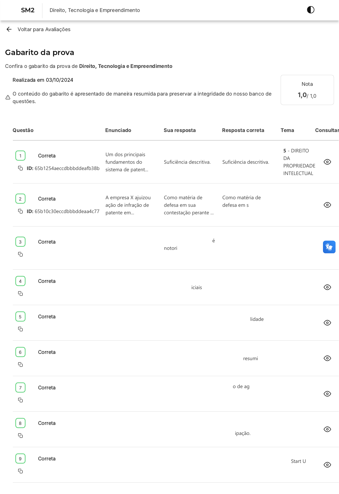 <p>Voltar para Avaliações</p><p>Gabarito da prova</p><p>Confira o gabarito da prova de Direito, Tecnologia e Empreendimento</p><p>Realizada em 03/10/2024</p><p>O conteúdo do gabarito é apresentado de maneira resumida para preservar a integridade do nosso banco de</p><p>questões.</p><p>Nota</p><p>1,0/ 1,0</p><p>Questão Enunciado Sua resposta Resposta correta Tema Consultar</p><p>Correta</p><p>ID: 65b1254aeccdbbbddeafb38b</p><p>Um dos principais</p><p>fundamentos do</p><p>sistema de patent...</p><p>Suficiência descritiva. Suficiência descritiva.</p><p>5 - DIREITO</p><p>DA</p><p>PROPRIEDADE</p><p>INTELECTUAL</p><p>Correta</p><p>ID: 65b10c30eccdbbbddeaa4c77</p><p>A empresa X ajuizou</p><p>ação de infração de</p><p>patente em...</p><p>Como matéria de</p><p>defesa em sua</p><p>contestação perante ...</p><p>Como matéria de</p><p>defesa em sua</p><p>contestação perante ...</p><p>5 - DIREITO</p><p>DA</p><p>PROPRIEDADE</p><p>INTELECTUAL</p><p>Correta</p><p>ID: 65b12381eccdbbbddeaf6055</p><p>Considerando o</p><p>enunciado acima,</p><p>Pedro, para formar...</p><p>Vedada, pois a marca é</p><p>notoriamente</p><p>conhecida no B...</p><p>Vedada, pois a marca é</p><p>notoriamente</p><p>conhecida no B...</p><p>5 - DIREITO</p><p>DA</p><p>PROPRIEDADE</p><p>INTELECTUAL</p><p>Correta</p><p>ID: 65c41e8292547b2a794419e1</p><p>Em relação às</p><p>heurísticas e vieses</p><p>cognitivos:</p><p>A imprevisibilidade das</p><p>decisões judiciais ou a</p><p>in...</p><p>A imprevisibilidade das</p><p>decisões judiciais ou a</p><p>in...</p><p>6 - ANÁLISE</p><p>ECONÔMICA</p><p>DO DIREITO</p><p>Correta</p><p>ID: 65b1254aeccdbbbddeafb39c</p><p>Sobre o IPO (Initial</p><p>Public Offering),</p><p>marque a al...</p><p>É uma modalidade de</p><p>investimento anjo.</p><p>É uma modalidade de</p><p>investimento anjo.</p><p>4 - Start Ups e</p><p>Legal Techs</p><p>Correta</p><p>ID: 65b10c37eccdbbbddeaa4dd9</p><p>No tocante à Análise</p><p>Econômica do Direito</p><p>comporta...</p><p>O viés confirmatório</p><p>pode ser resumido da</p><p>seguinte...</p><p>O viés confirmatório</p><p>pode ser resumido da</p><p>seguinte...</p><p>6 - ANÁLISE</p><p>ECONÔMICA</p><p>DO DIREITO</p><p>Correta</p><p>ID: 65b10d54eccdbbbddeaa7701</p><p>O viés do otimismo, o</p><p>qual diz respeito à</p><p>nossa ca...</p><p>Modo de agir do</p><p>mediador nos centros</p><p>judiciários d...</p><p>Modo de agir do</p><p>mediador nos centros</p><p>judiciários d...</p><p>6 - ANÁLISE</p><p>ECONÔMICA</p><p>DO DIREITO</p><p>Correta</p><p>ID: 65b11e7aeccdbbbddeae7d25</p><p>A figura do sócio</p><p>ostensivo está presente</p><p>em qual ...</p><p>Sociedade em conta de</p><p>participação.</p><p>Sociedade em conta de</p><p>participação.</p><p>4 - Start Ups e</p><p>Legal Techs</p><p>Correta</p><p>ID: 65b1165eeccdbbbddeacca59</p><p>Quanto à proteção da</p><p>propriedade intelectual</p><p>em um...</p><p>É extremamente</p><p>importante registrar a</p><p>marca de uma...</p><p>É extremamente</p><p>importante registrar a</p><p>marca de uma...</p><p>4 - Start Ups e</p><p>Legal Techs</p><p>1</p><p>2</p><p>3</p><p>4</p><p>5</p><p>6</p><p>7</p><p>8</p><p>9</p><p>SM2 Direito, Tecnologia e Empreendimento</p><p>https://estacio.saladeavaliacoes.com.br/avaliacoes/</p><p>Correta</p><p>ID: 65b117f9eccdbbbddead3a4c</p><p>A respeito do ciclo</p><p>construir-medir-</p><p>aprender desen...</p><p>É uma modalidade</p><p>contratual</p><p>extremamente</p><p>important...</p><p>É uma modalidade</p><p>contratual</p><p>extremamente</p><p>important...</p><p>4 - Start Ups e</p><p>Legal Techs</p><p>10</p><p>Encontrou algum problema?</p><p>Você pode copiar o ID da questão, acessar o Campus Virtual �SIA) e abrir um requerimento.</p>